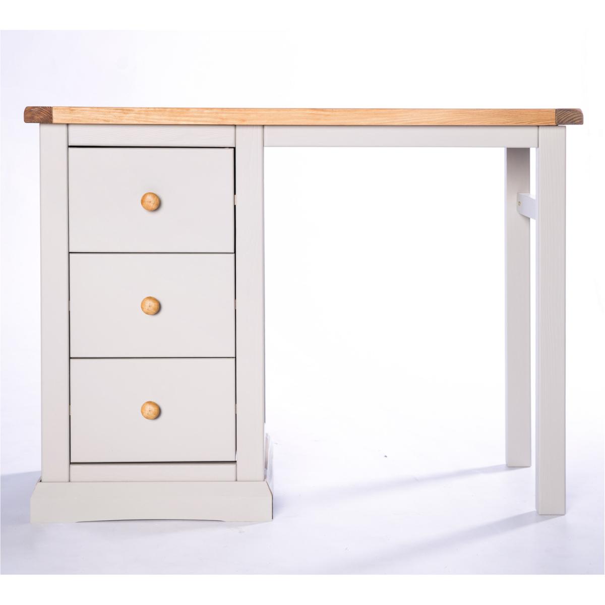Our Loreo collection has a simple but pleasing design and is produced by our skilled craftsmen to the highest standards using responsibly sourced wood and veneers. All tops are made using a combination of solid pine wood and veneers and are carefully hand waxed giving them a great look. The body is finished with high-quality eco-friendly water base paint in a light grey colour. A versatile 3-drawer desk dressing table for your home, the perfect multifunctional piece for your bedroom. The 3 drawers offer plenty of space for your belongings whether being used as a desk or dressing table. The pedestal part can be positioned to the left or right-hand side when assembling. Why not add the mirror and stool to complete your set These attributes combined with a simple construction for easy assembly makes it a great value product to be taken home today.