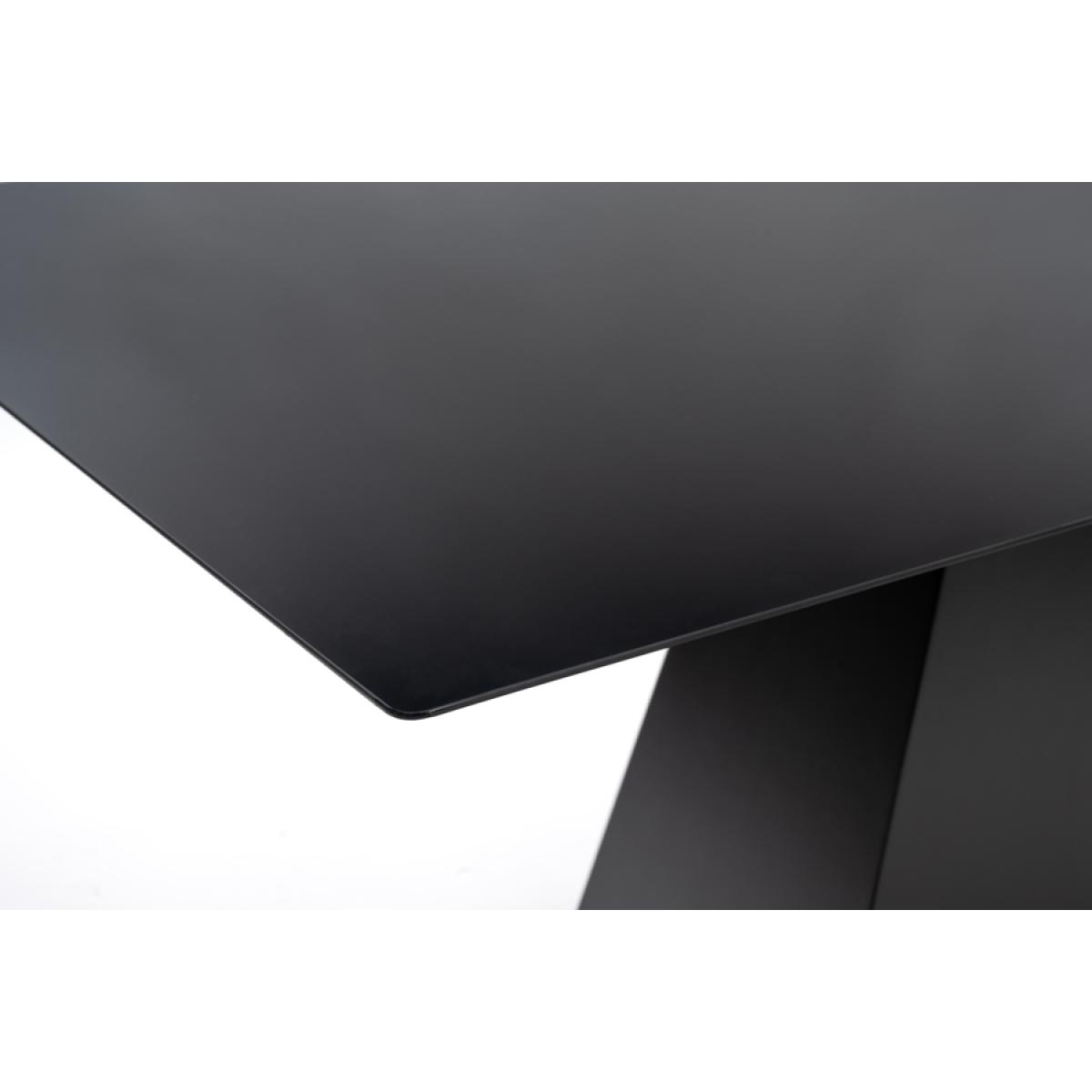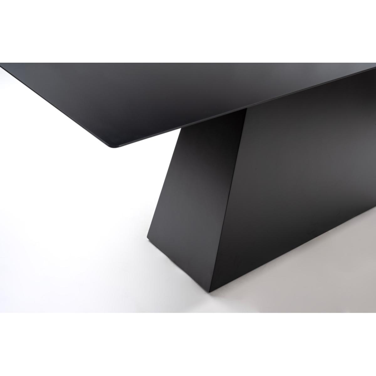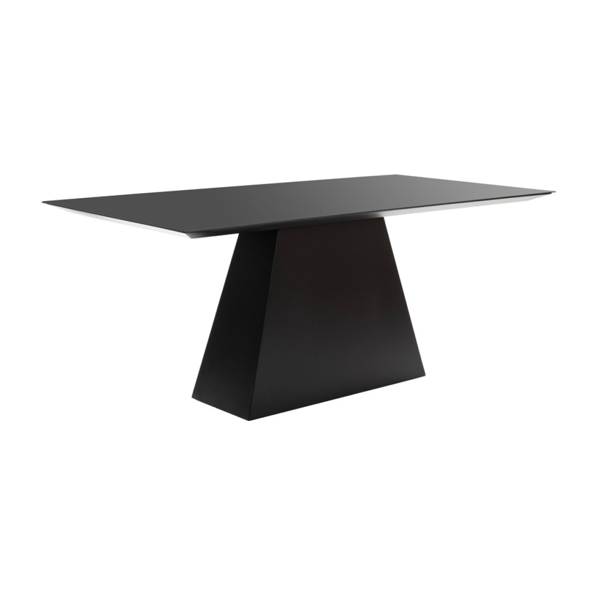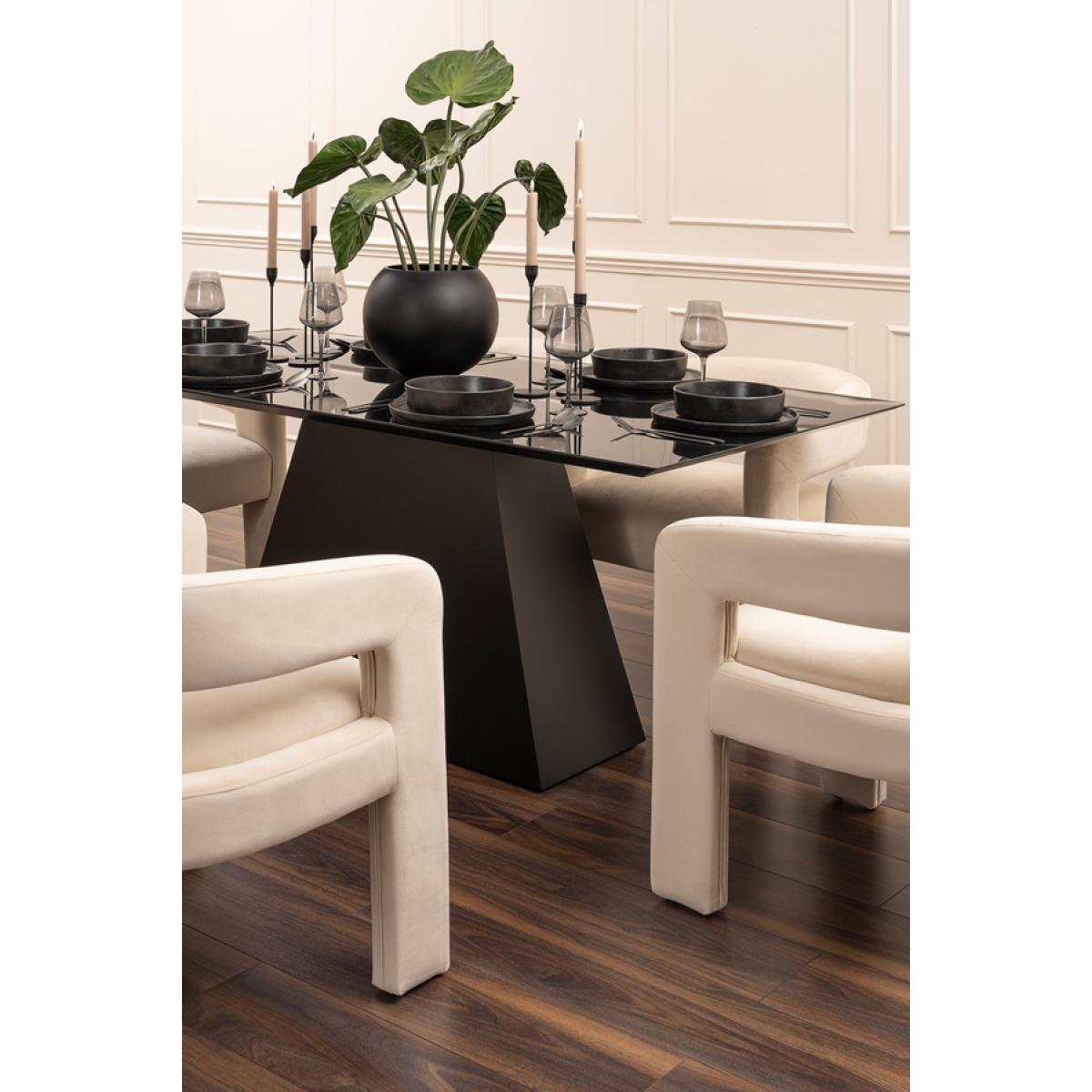 A timeless and elegant dining table with a striking graphic silhouette. Versatile design - suitable for use with any of our dining chairs. Toughened black glass tabletop. Tapered wooden base with durable black polyurethane paint finish. Height adjustable feet. Comfortably sits up to 6 people. Simple assembly required.