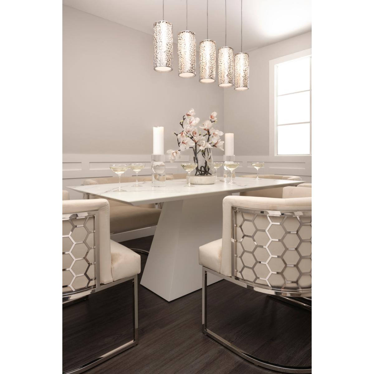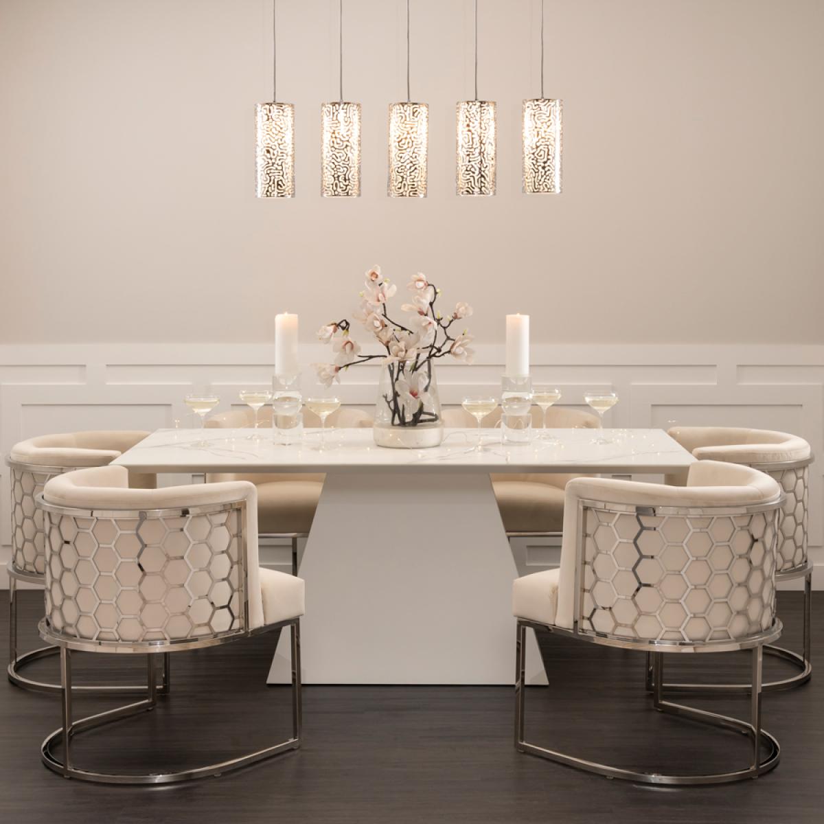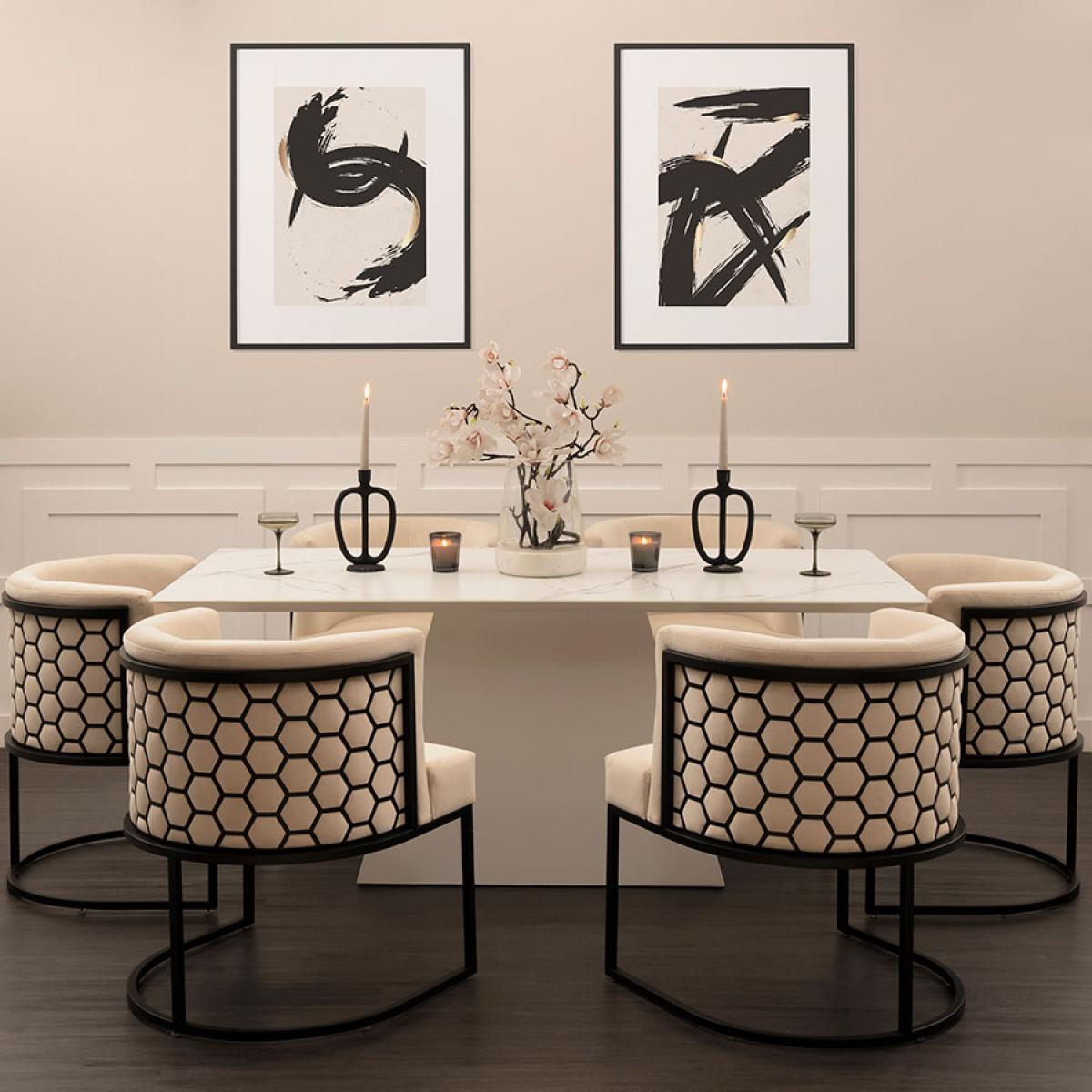 I’ve been using the Loretta table in a few shoots recently and love how its clean lines and marble-effect top lift any space. It works equally well in minimalist, Scandi and contemporary settings - pair it with slim-legged chairs in muted tones or go bold with velvet upholstery for contrast. For styling, keep the surface clutter-free: a simple runner or a low vase of greenery always looks crisp, and a set of stoneware plates in earthy shades adds warmth. Make sure to centre your lighting above the table - an adjustable pendant helps balance the strong geometric base and ensures every seat feels considered.