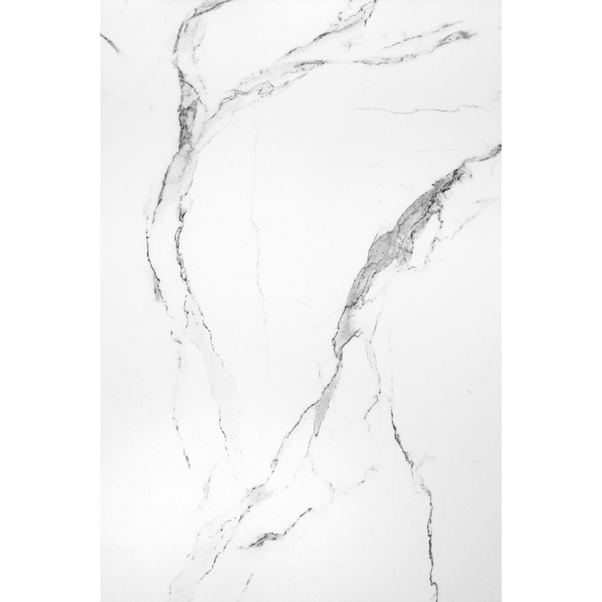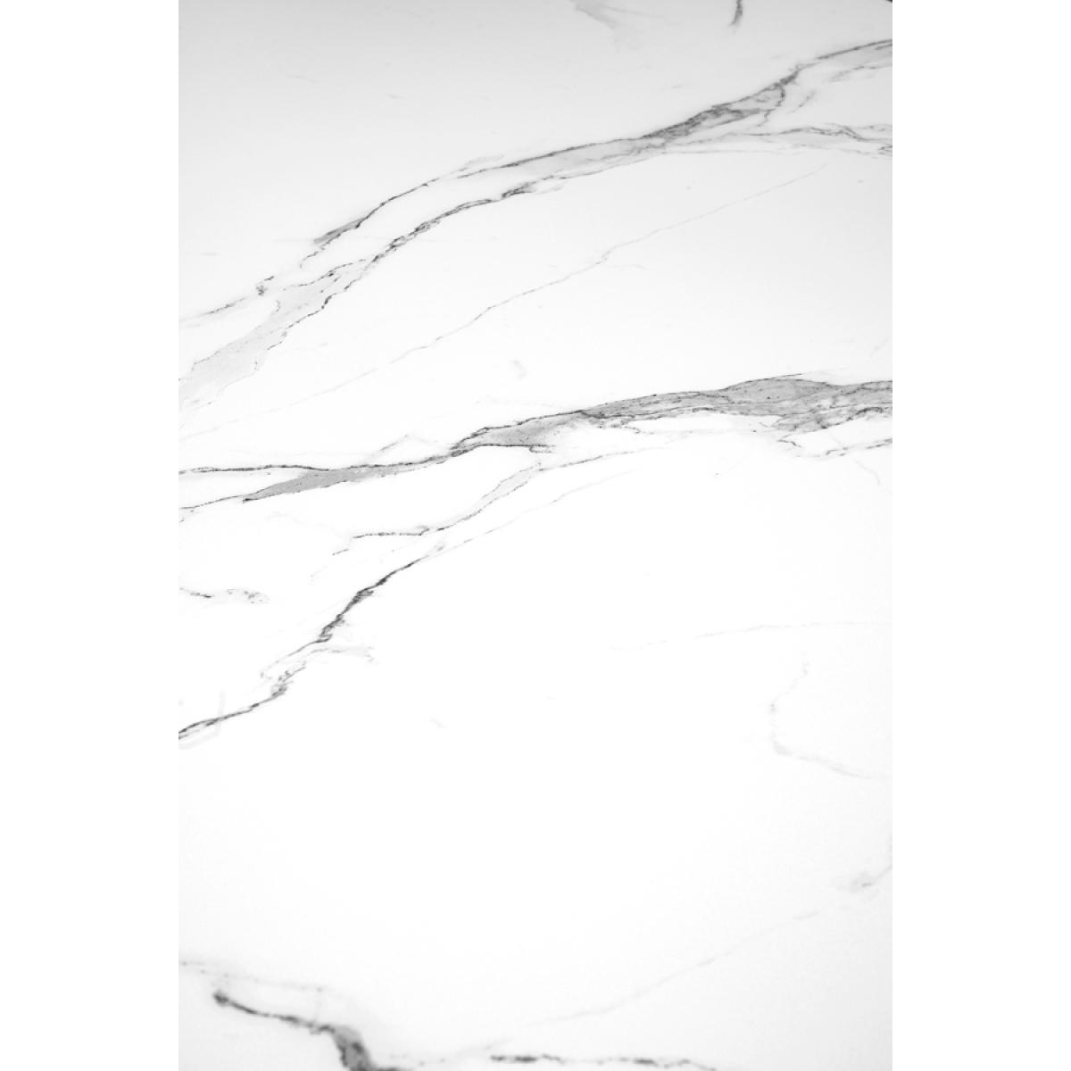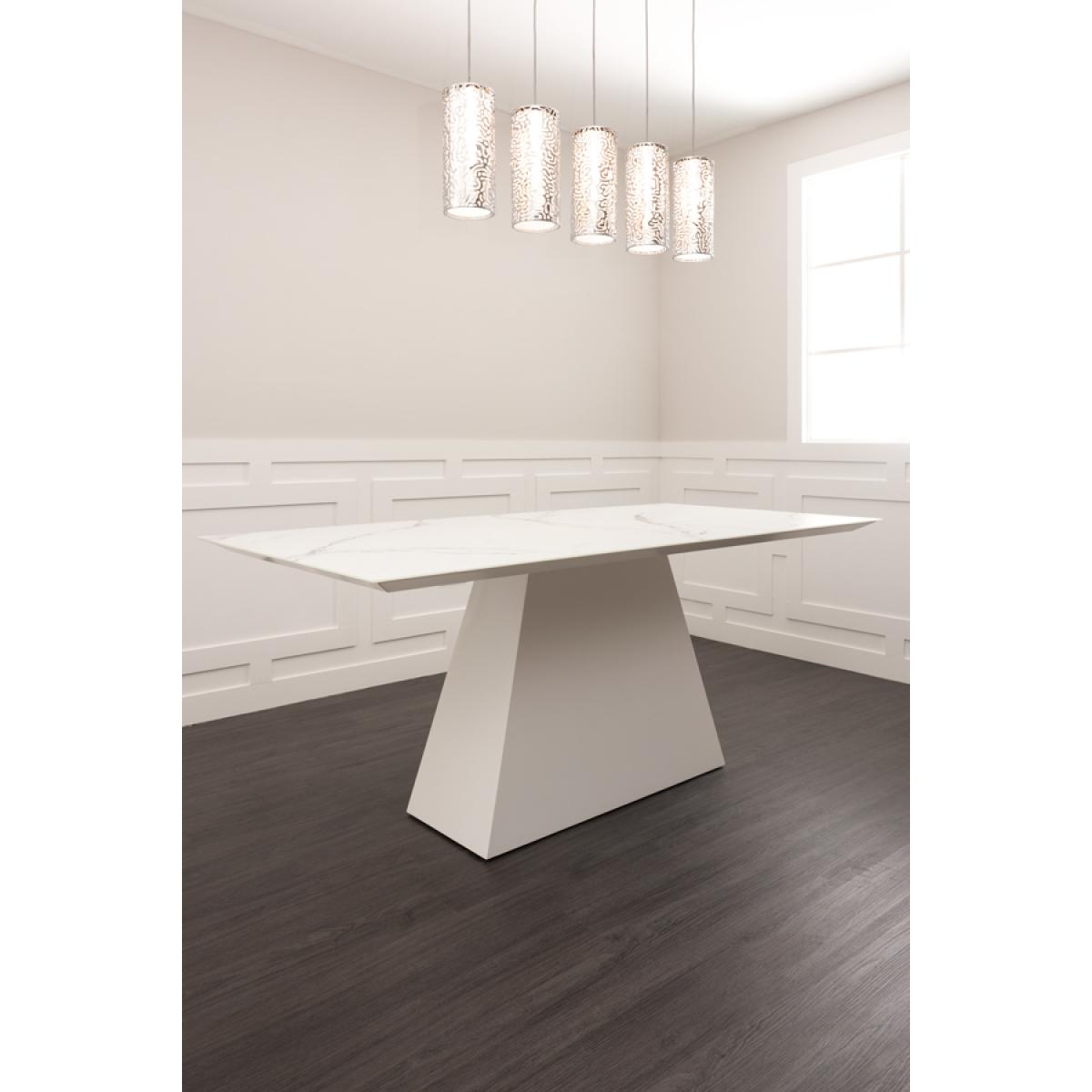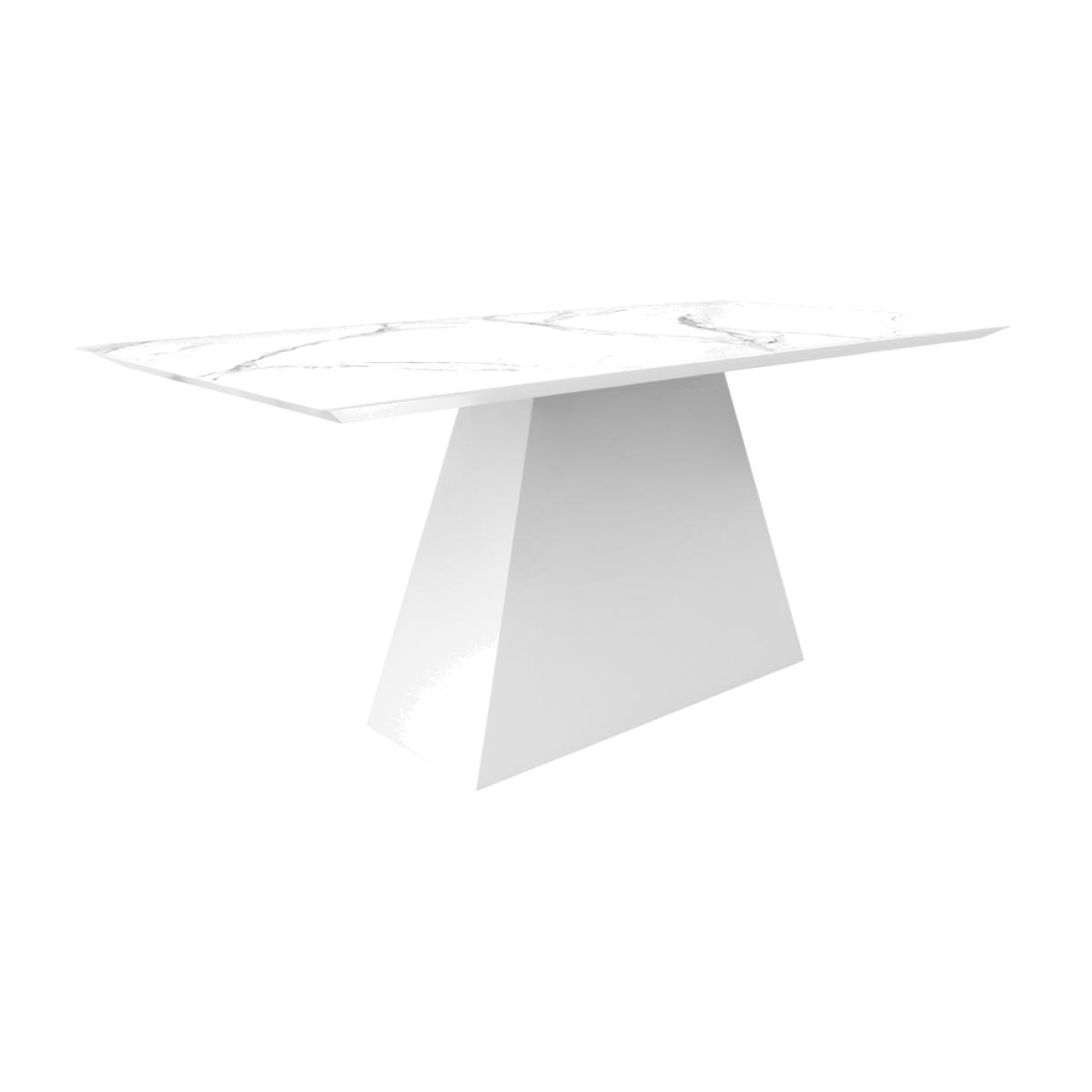 A timeless and elegant dining table with a striking graphic silhouette. Versatile design - suitable for use with any of our dining chairs. Toughened glass tabletop with marble effect finish. Tapered wooden base with durable white polyurethane paint finish. Height adjustable feet. Comfortably sits up to 6 people. Simple assembly required.