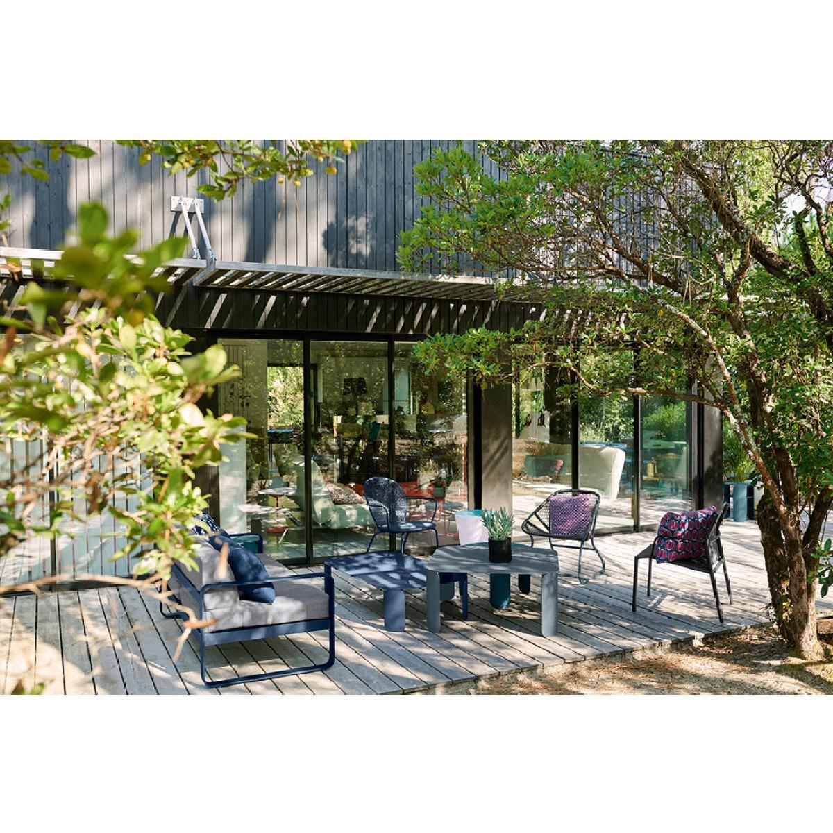 Rustic and enchanting, the Lorette collection by Frédéric Sofia will capture hearts and minds. This range features a singular, subtle motif that, like a monogram, becomes a real signature. The influences behind this motif are multiple and eclectic: this flower with its four petals is a sign of openness to the world, evoking eastern lands and mashrabiya screens. Steeped in poetry, this openwork motif also embodies the spirit of our country houses. Finally, its fine lines and superb rounded angles are inspired by the design of the 1950-1960s. Lorette perfectly reflects the spirit of Fermob with its assured graphic design and metalwork, which only the brand is capable of mastering. Very broad, this collection offers a complete set of metal furniture as well as textile accessories for indoor and outdoor use. Bewitching and elegant, Lorette gives our rooms, our gardens and our terraces a new feel, like a promise of magical moments to come. The Lorette steel bridge chair will beautify and give a new look to your garden. With its Louis XVI spirit, it revisits the iconic medallion chair in a chic and contemporary way. Featuring four slim, flaring feet for a good hold on the grass and rounded corners, its base is reminiscent of Fritz Hansen's Arne Jacobsen ant chair. The repetitive motif made up of flowers and geometric shapes gives this seat femininity and modernity: mastering the art of perforation, the creation of the backrest is the result of a real piece of craftsmanship! In addition to its elegance, Lorette is an easy-going chair: Stackable, manageable and durable, it will brave the test of time with ease.