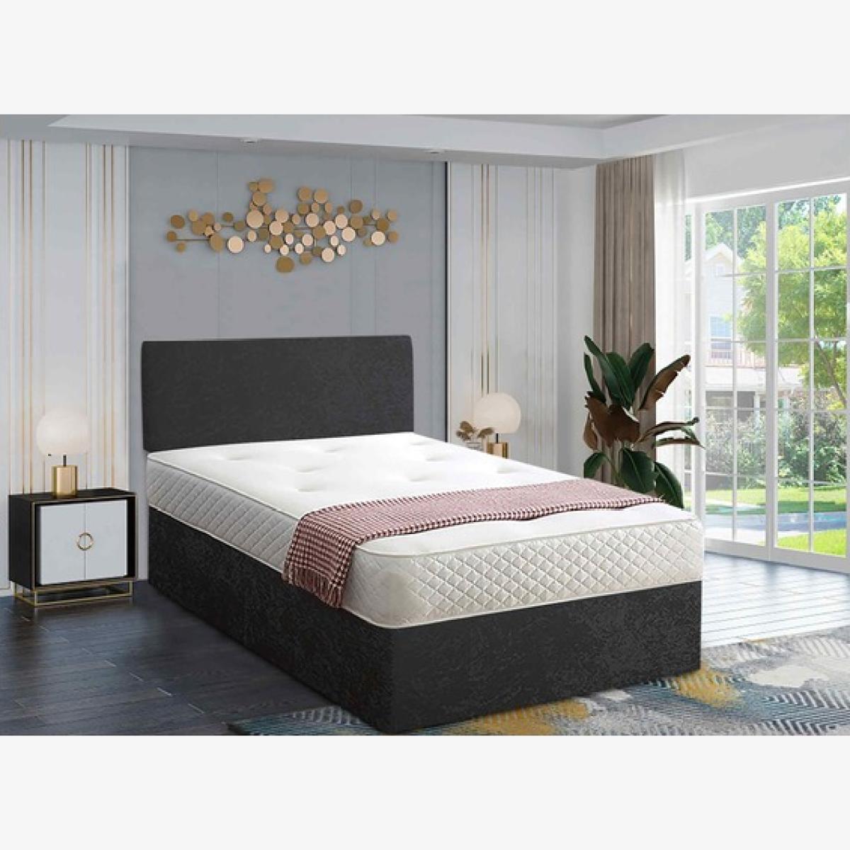 A contemporary style for any bedroom setting. This affordable yet quality divan bed comes with a 20 inch headboard, base and a memory spring mattress. This bed is available in 6 sizes and various fabrics and colours. There are storage options of having 2 drawers. The mattress is a 13.5 Open Coil Bonnell spring with a layer of responsive memory foam, hand tufted as it secures the classic mattress fillings and enhances the performance and life span. A medium to firm mattress with a depth of 10 inches this amazingly priced bed set represents great value for money.