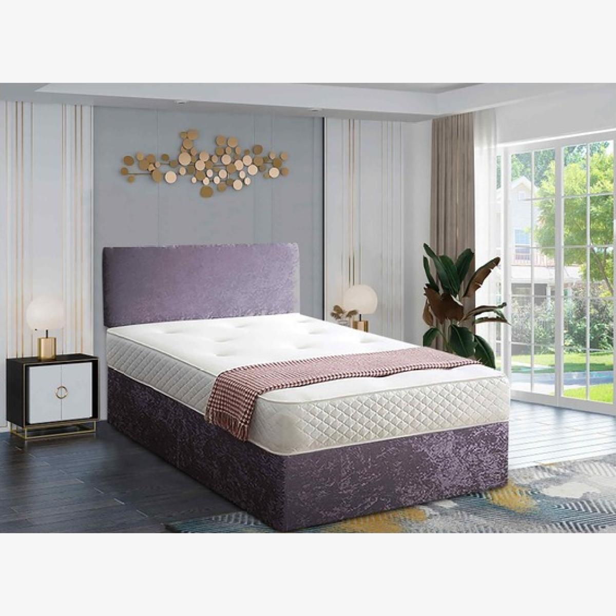 A contemporary style for any bedroom setting. This affordable yet quality divan bed comes with a 20 inch headboard, base and a memory spring mattress. This bed is available in 6 sizes and various fabrics and colours. There are storage options of having 2 drawers. The mattress is a 13.5 Open Coil Bonnell spring with a layer of responsive memory foam, hand tufted as it secures the classic mattress fillings and enhances the performance and life span. A medium to firm mattress with a depth of 10 inches this amazingly priced bed set represents great value for money.