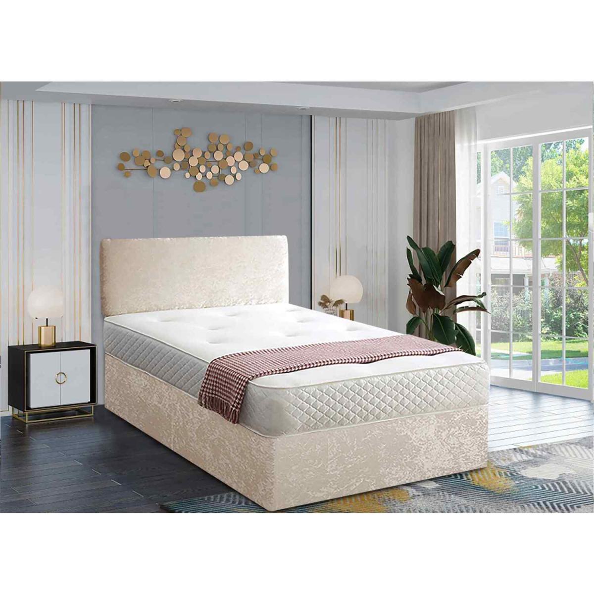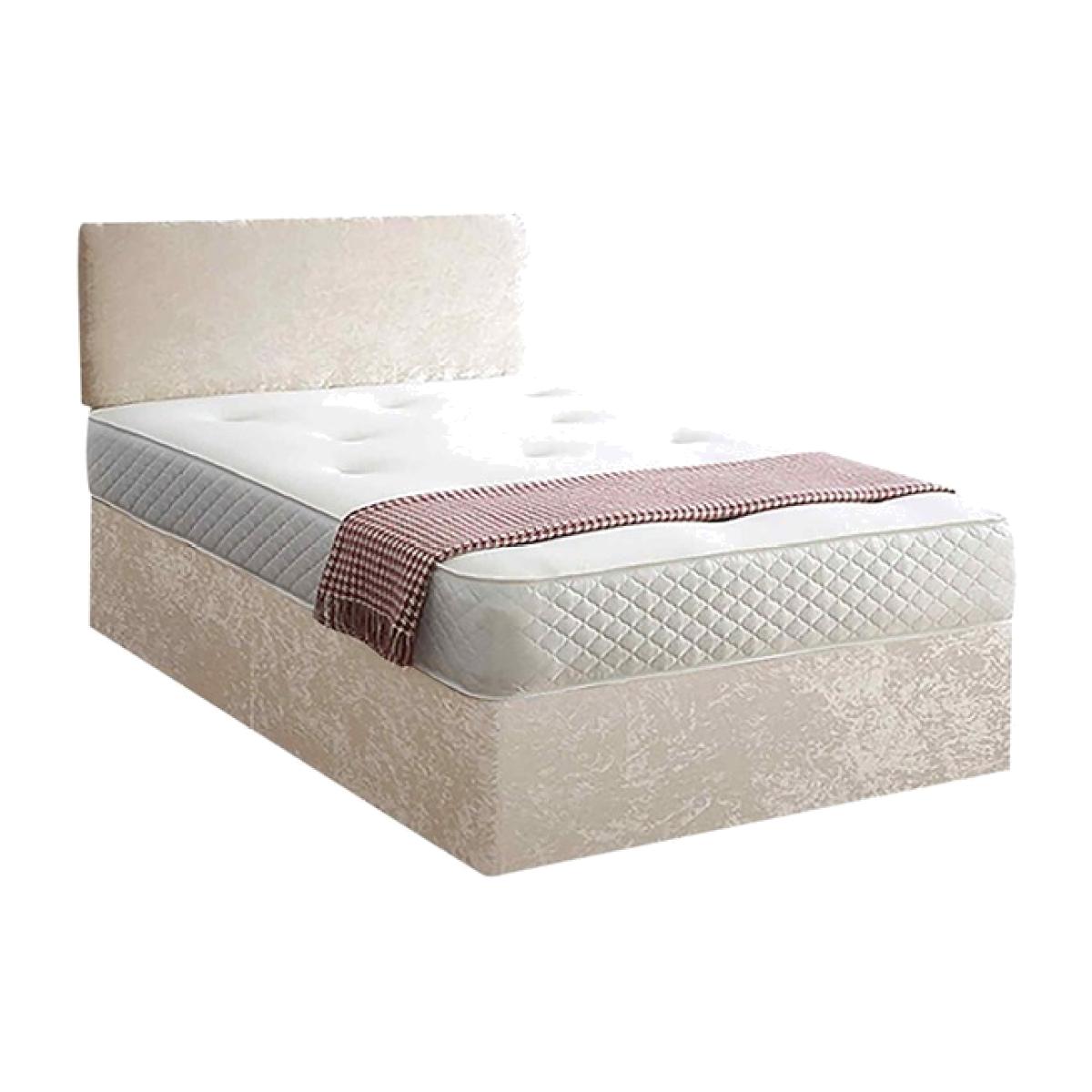 A contemporary style for any bedroom setting. This affordable yet quality divan bed comes with a 20 inch headboard, base and a memory spring mattress. This bed is available in 6 sizes and various fabrics and colours. There are storage options of having 2 drawers. The mattress is a 13.5 Open Coil Bonnell spring with a layer of responsive memory foam, hand tufted as it secures the classic mattress fillings and enhances the performance and life span. A medium to firm mattress with a depth of 10 inches this amazingly priced bed set represents great value for money.