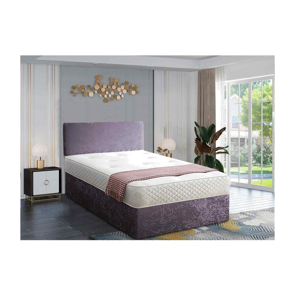 A contemporary style for any bedroom setting. This affordable yet quality divan bed comes with a 20 inch headboard, base and a memory spring mattress. This bed is available in 6 sizes and various fabrics and colours. There are storage options of having 2 drawers. The mattress is a 13.5 Open Coil Bonnell spring with a layer of responsive memory foam, hand tufted as it secures the classic mattress fillings and enhances the performance and life span. A medium to firm mattress with a depth of 10 inches this amazingly priced bed set represents great value for money.