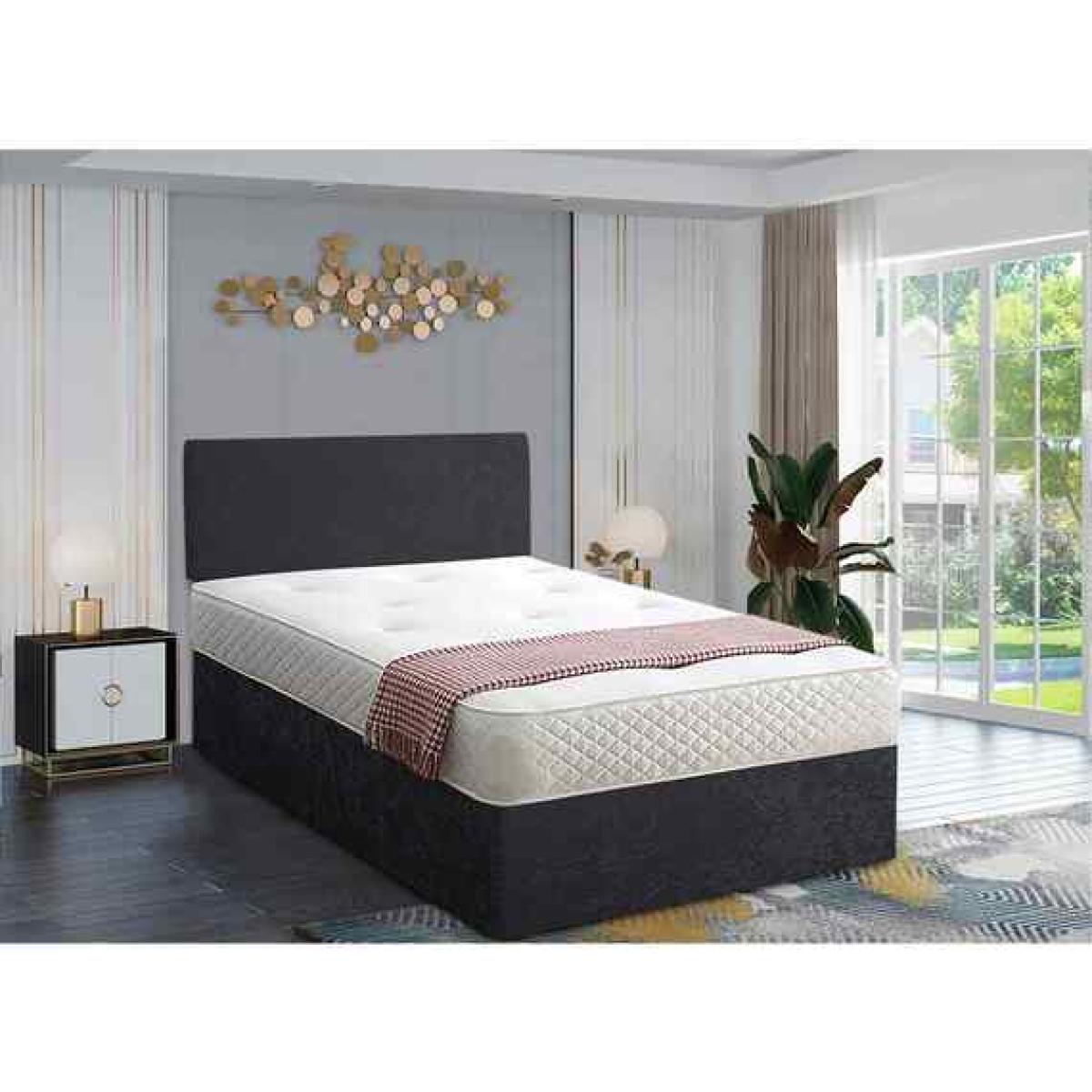 A contemporary style for any bedroom setting. This affordable yet quality divan bed comes with a 20 inch headboard, base and a memory spring mattress. This bed is available in 6 sizes and various fabrics and colours. There are storage options of having 2 drawers. The mattress is a 13.5 Open Coil Bonnell spring with a layer of responsive memory foam, hand tufted as it secures the classic mattress fillings and enhances the performance and life span. A medium to firm mattress with a depth of 10 inches this amazingly priced bed set represents great value for money.