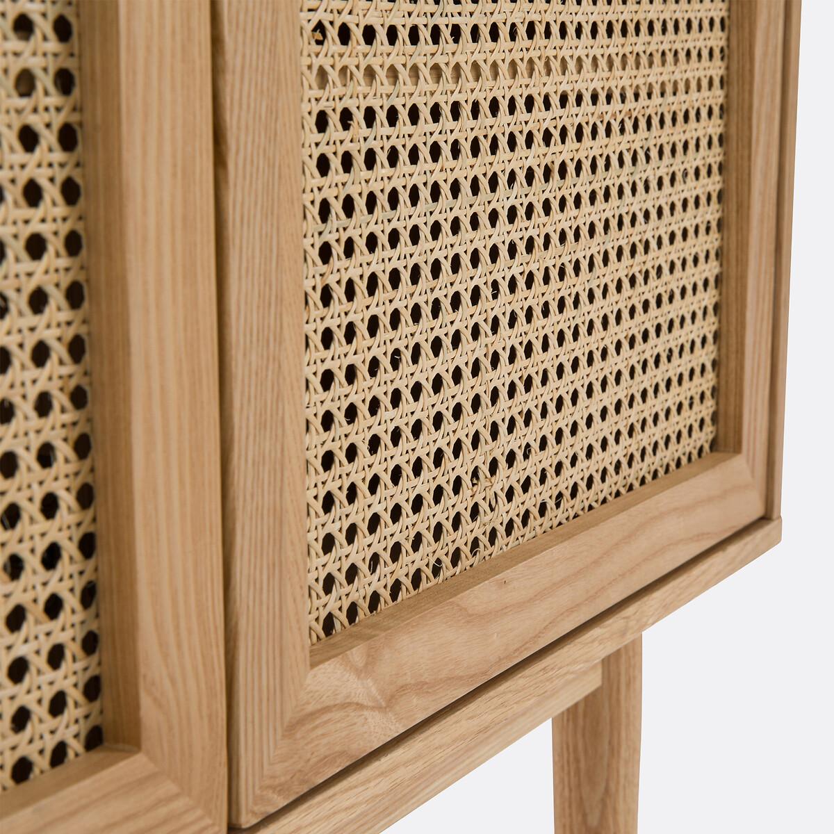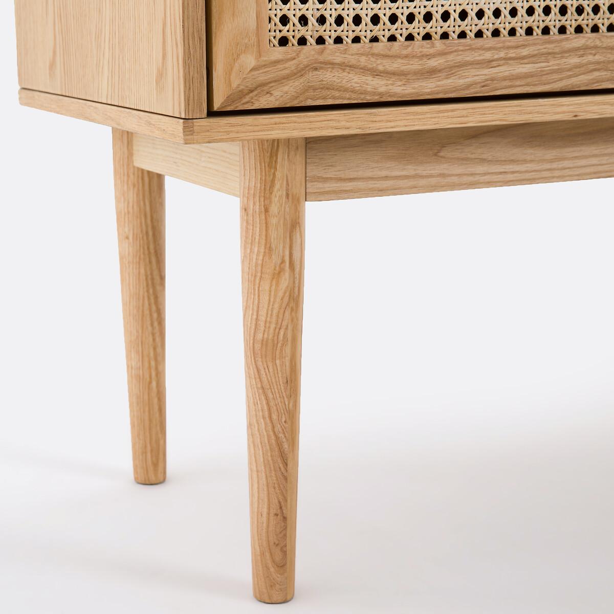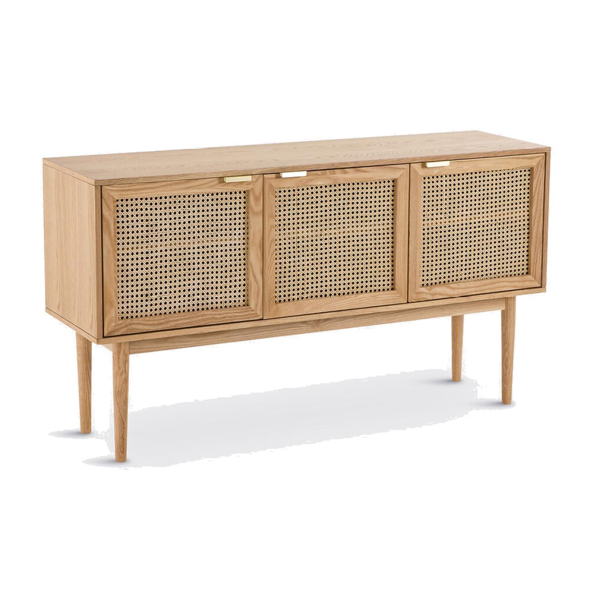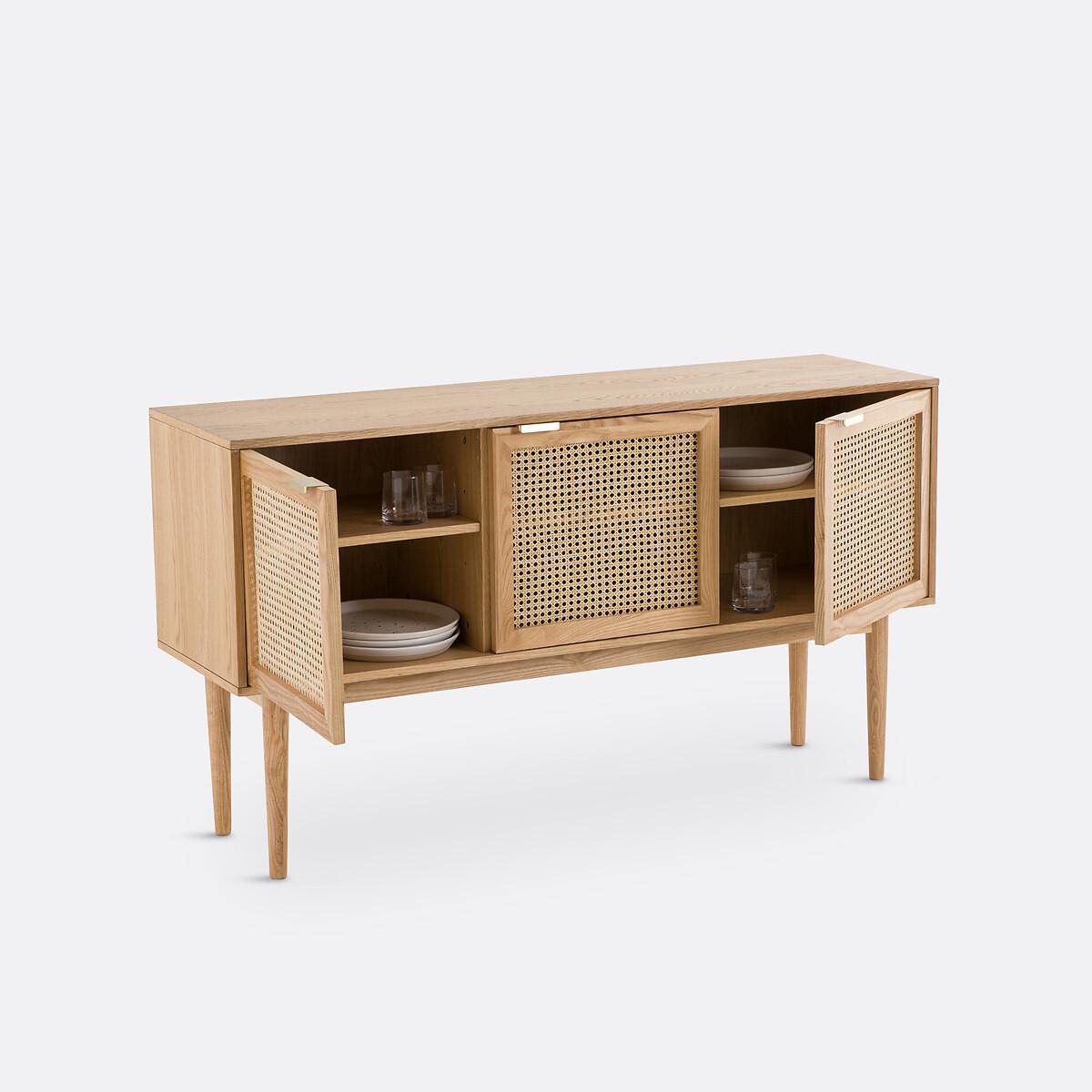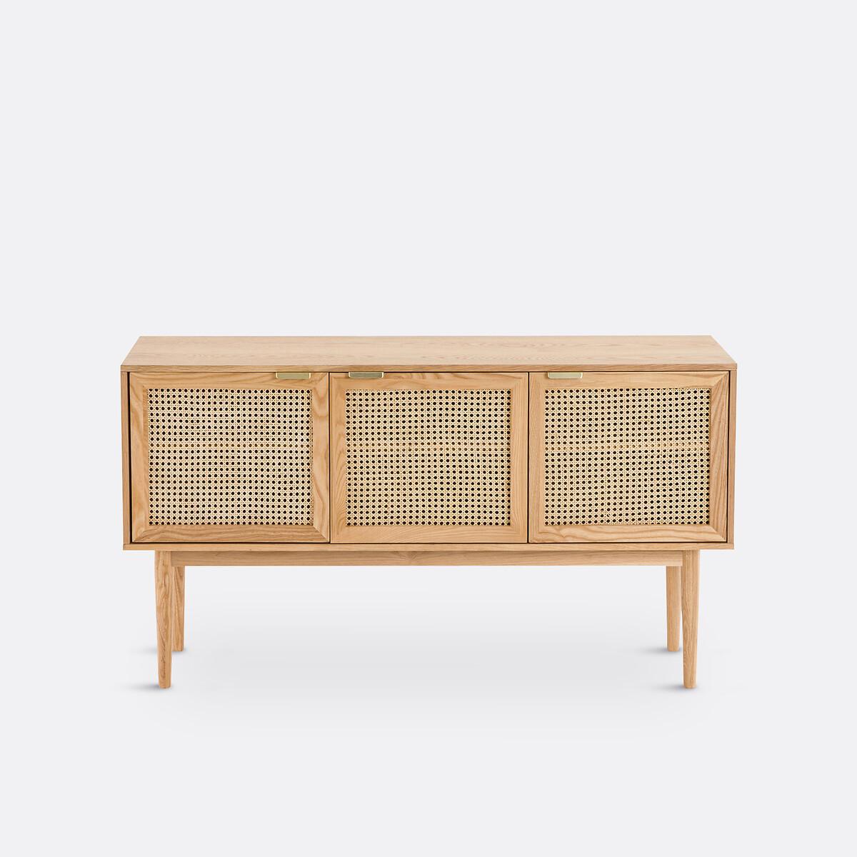Structure and legs in solid ash + cane doors = a sideboard that goes well with both a contemporary and bohemian atmosphere. Beautiful and functional. Product Details • Ash veneered MDF unit • Door frame and tapered legs in solid ash • Nitrocellulose varnish finish • 3 cane doors (natural cane), standard hinges • Gold-finish metal handles • 2 vertical dividers • 3 adjustable & removable shelves • 6 compartmentsDimensions. Overall • Width: 140cm • Height: 77cm • Depth: 40cm. Usable space • Compartments (without shelf) :L44.5 x H39 x D35cm • Base dimensions: L128 x H34 x D30cmDelivery:. This product is sold ready to assemble. Parcel dimensions and weight1 parcel • L150 x H21 x D52cm. 36.5kg