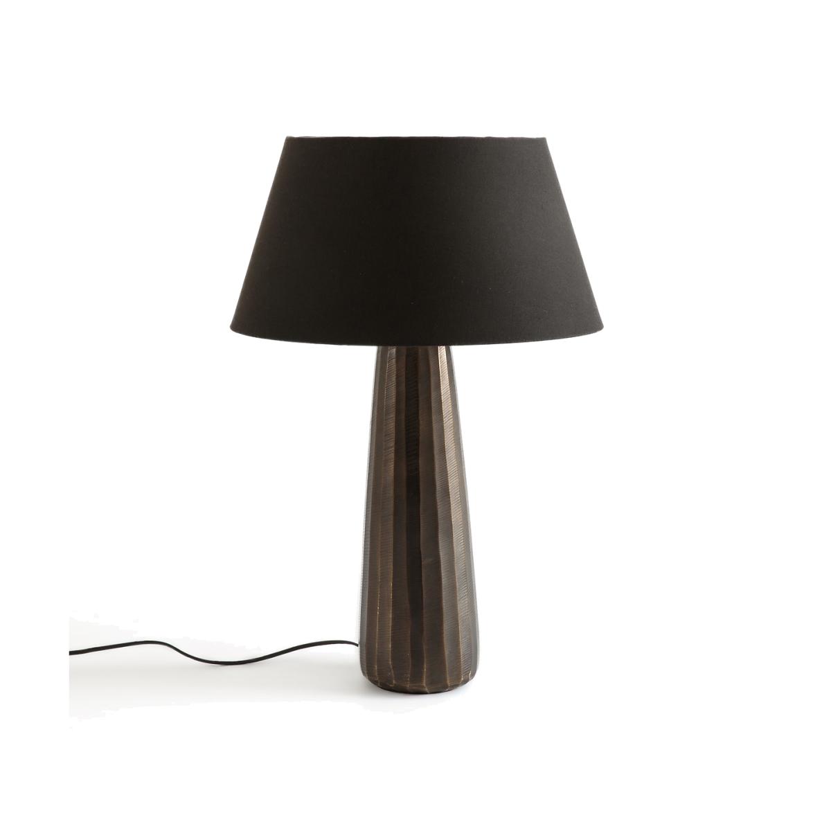 Featuring a hand engraved base with an aged brass finish, our Lotka table lamp will bring personality to your home. Product Details • Hand-engraved cast aluminium base, aged bronze finish. • Cotton lampshade • Fitted with E27 socket for 60W max bulb (not included). • Compatible with bulbs in energy classes A-E.Dimensions • L40 x H61 x D40cm.