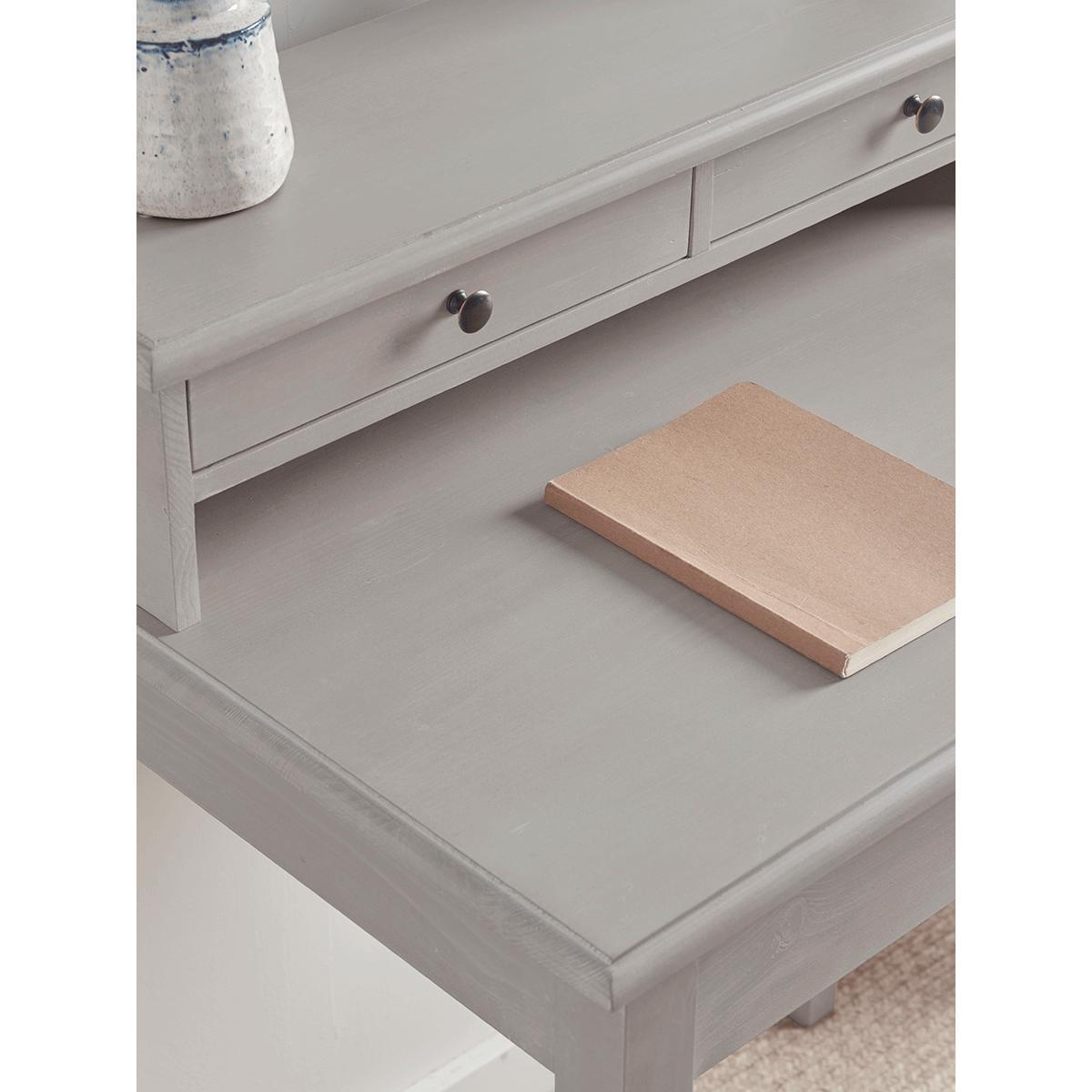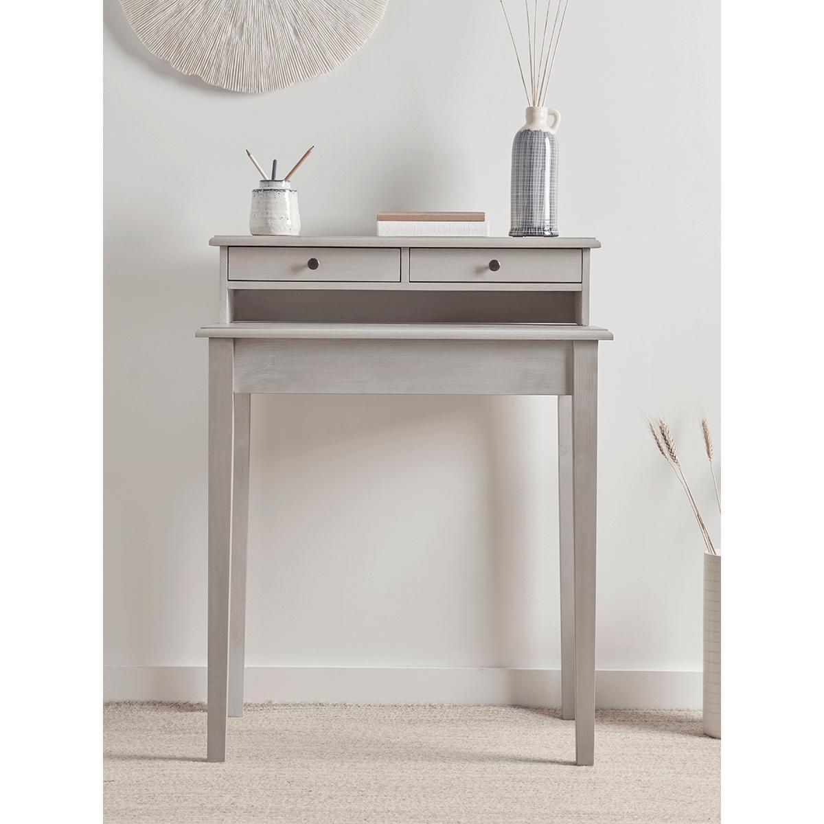 Our Lotte Desk is a stylish piece with a romantic, old writing desk design. Made from pine with a washed paint effect finish, the Lotte features a raised unit that houses two drawers to stow your writing accessories and, with a pocket beneath, there is ample working surface for papers and pens. With traditional details, our beautifully crafted piece will add a light, relaxed aesthetic to your space. Discover more from our. Lotte. Range.