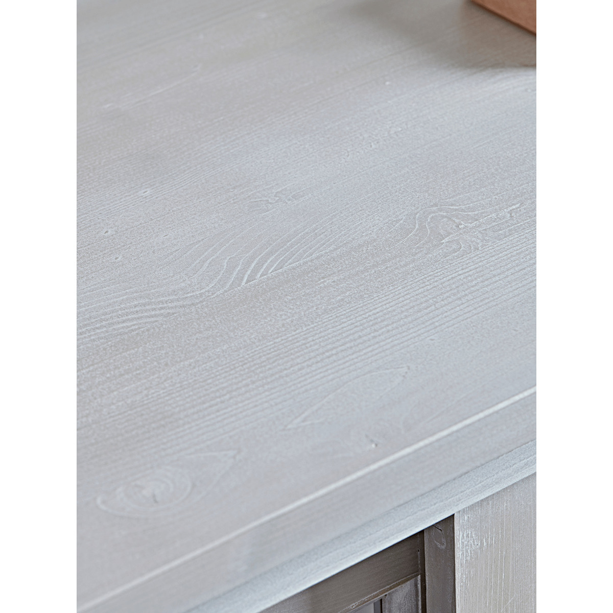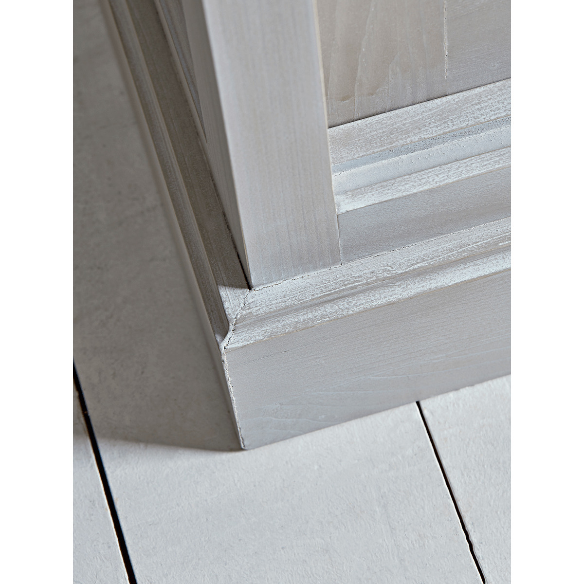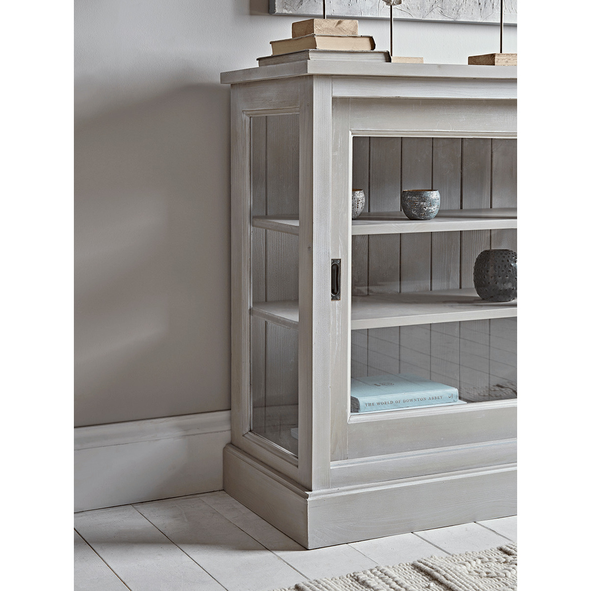 Made from pine with a washed paint effect finish our glass display cabinet has a stylish appearance with a contrast white interior, and a classic plinth base. Two glass fronted sliding doors with ironwork inset cup handles feature to front two interior shelves with three surfaces to stow an store. With a generous capacity for storing everything from books and objet to dinnerware, glass panels to the front and sides give this traditional furniture a relaxed appearance.