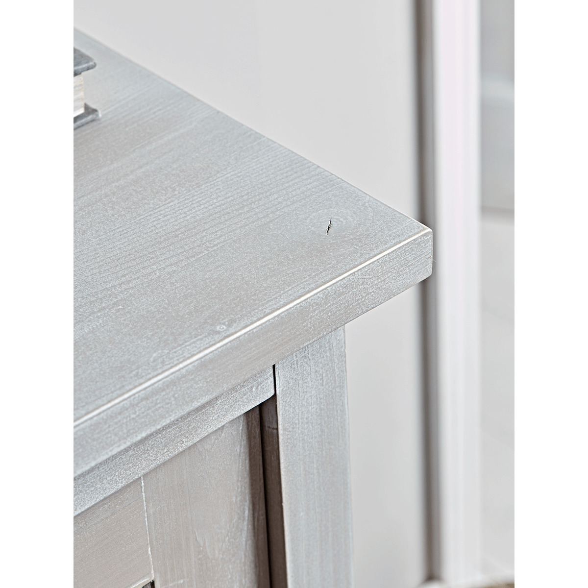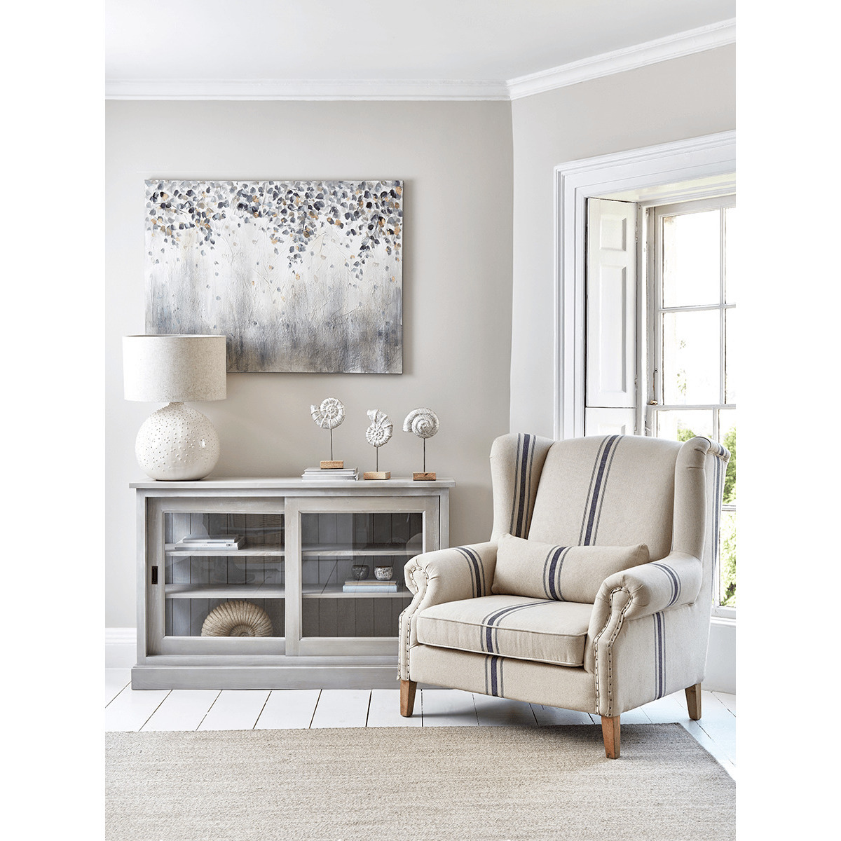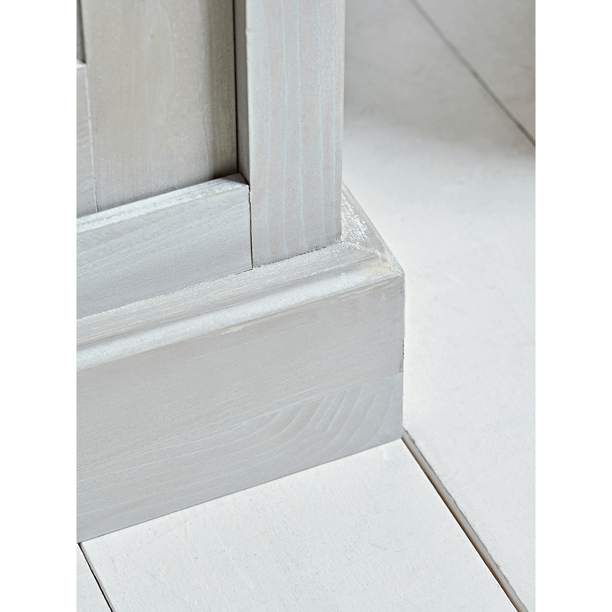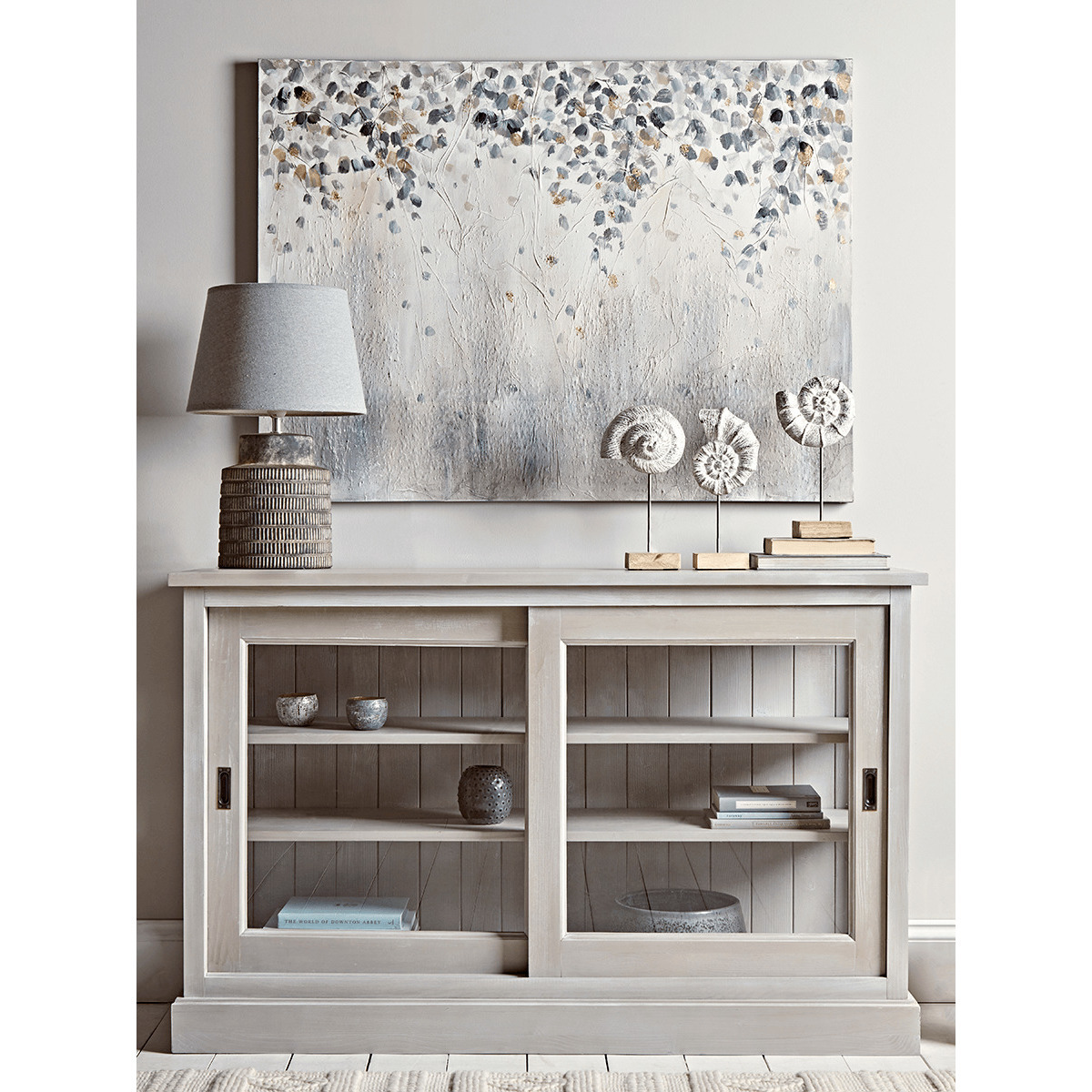Made from pine with a washed paint effect finish our glass display cabinet has a stylish appearance with a contrast white interior, and a classic plinth base. Two glass fronted sliding doors with ironwork inset cup handles feature to front two interior shelves with three surfaces to stow an store. With a generous capacity for storing everything from books and objet to dinnerware, glass panels to the front and sides give this traditional furniture a relaxed appearance.