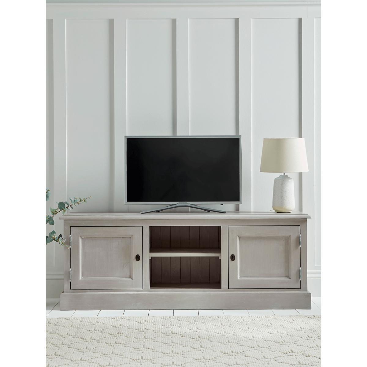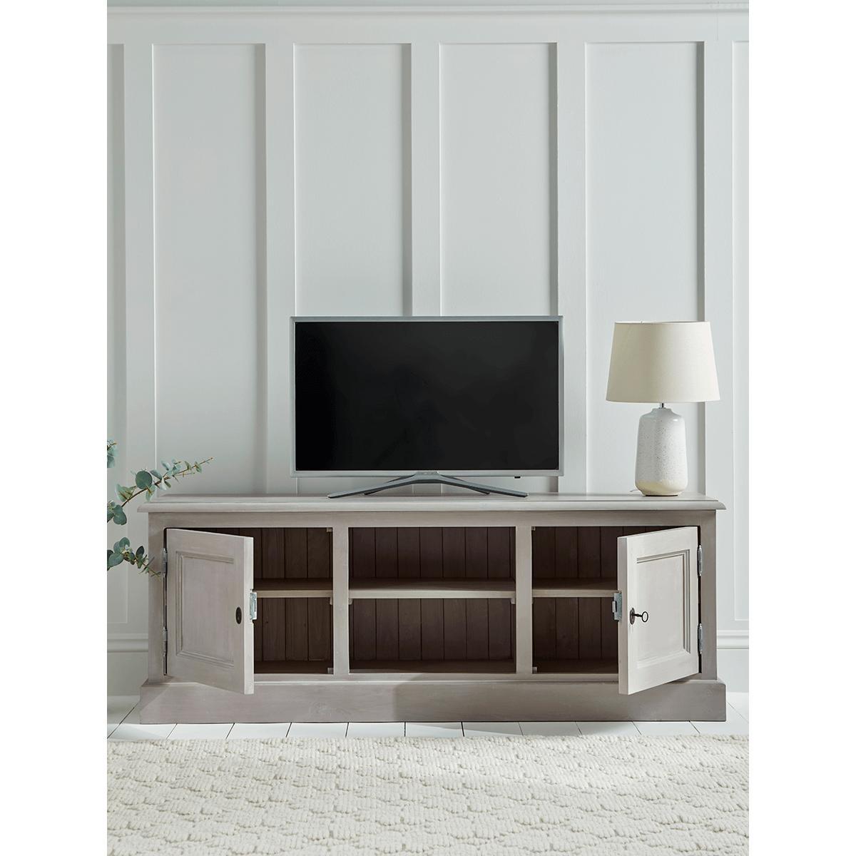 I love this media unit for its classic yet versatile design, making it a great fit for both traditional and modern interiors. It works well in living rooms where a neutral, understated piece is needed to keep the space feeling open and airy. Practical styling tips include using the top surface for statement lamps or decorative accessories, while the open shelf is perfect for organising media devices or displaying books. Its muted colour and simple detailing lend themselves to a layered, curated look with textiles or greenery nearby, ensuring a cosy but functional focal point in any lounge.
