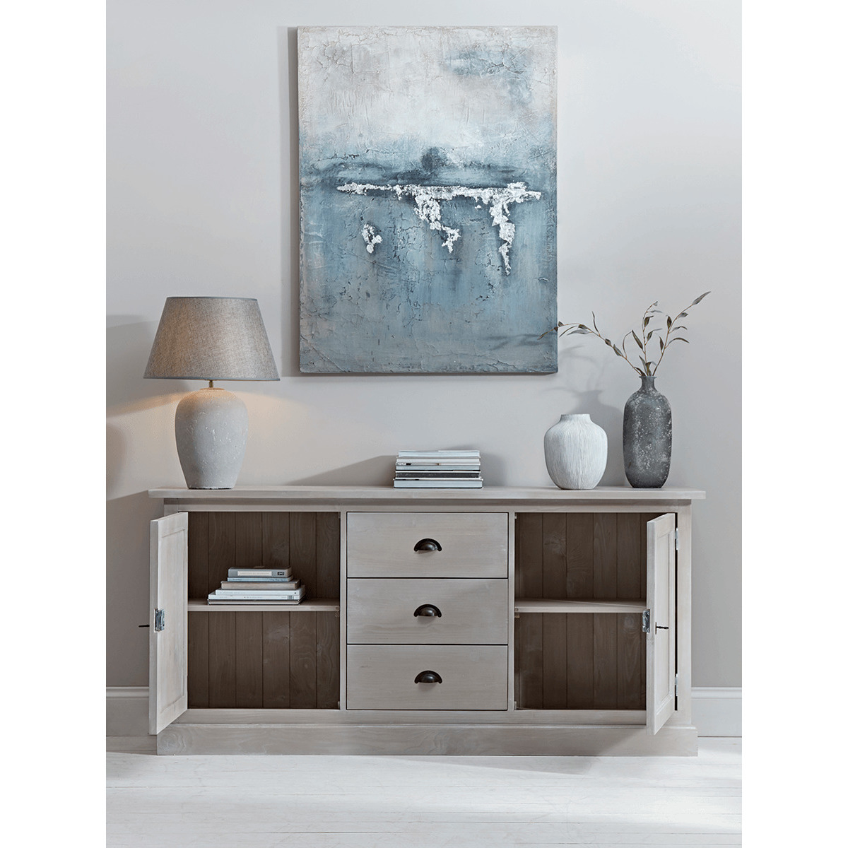 The Lotte sideboard is a versatile piece that adds a touch of understated elegance to a variety of interiors. I love how its neutral, weathered finish works especially well in coastal, Scandinavian, or rustic schemes, providing a relaxed yet refined focal point. Practical styling tips include using it to display a curated collection of vases and decorative objects, while keeping the top clear for everyday essentials. Its ample storage makes it ideal for hiding away items in a clutter-free way, making it a functional addition that also enhances the room's overall aesthetic.