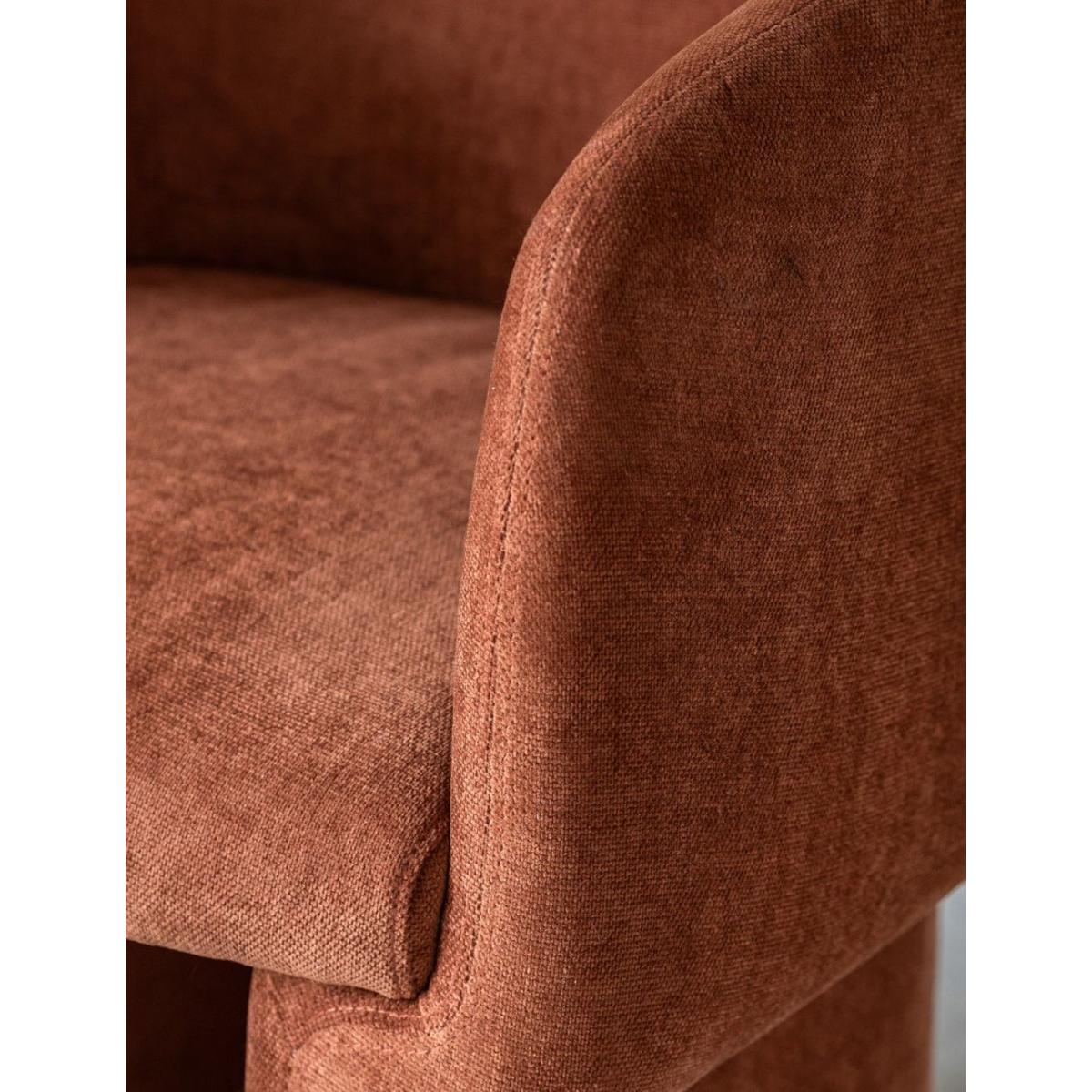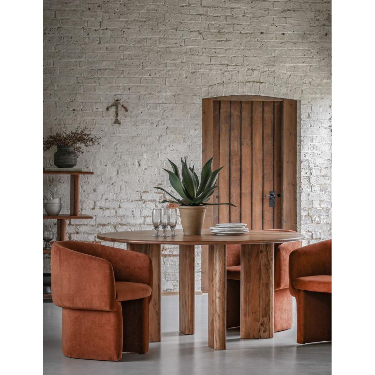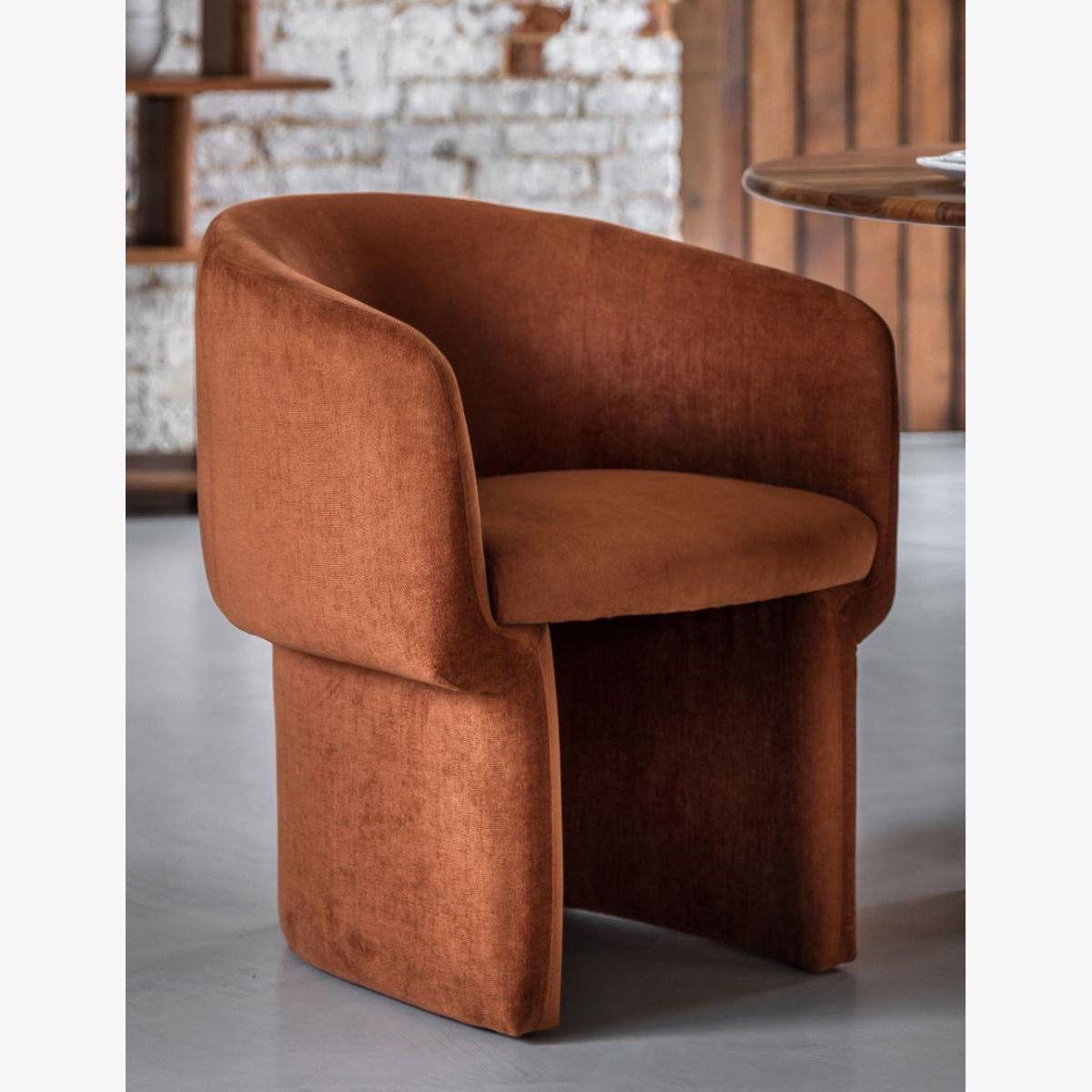 I’m a fan of this rust-coloured Lottie chair for its sculptural yet simple silhouette - the wrap-around back and generous seat pad make it just as comfortable as it is striking. The warm hue works brilliantly against pale walls or concrete floors, adding an instant focal point without overwhelming the space. It suits a range of interiors, from Scandinavian-inspired kitchens to more industrial or boho dining rooms. Pair it with a light oak or marble-top table and introduce brass or black metal accents for contrast. For a pulled-together look, balance the rich rust tone with soft neutrals in linens or a neutral rug, and repeat a hint of the same colour in cushions or accessories elsewhere in the room.