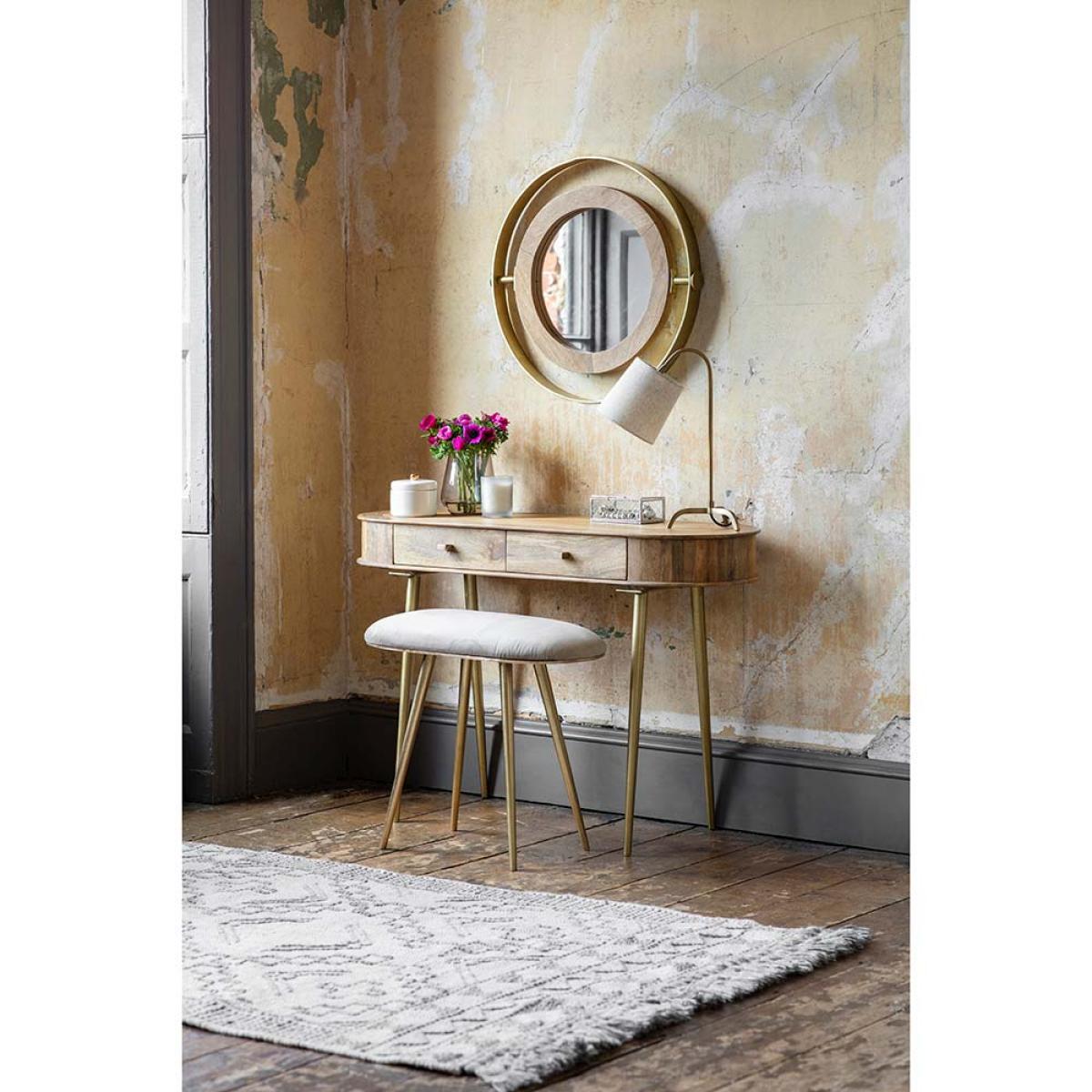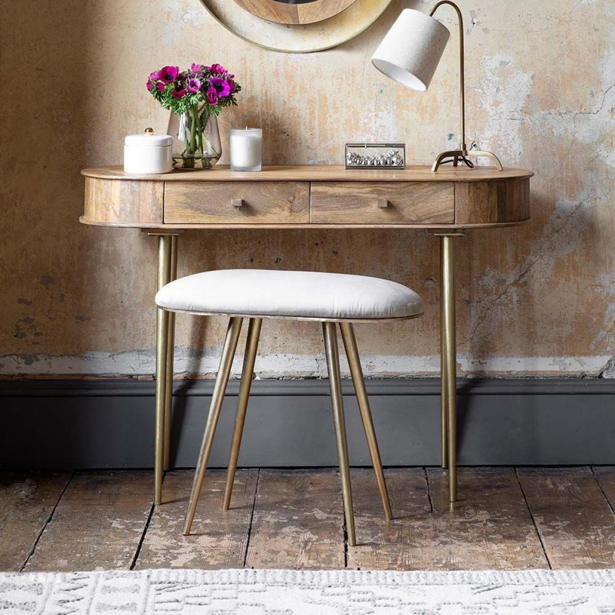 I’m a fan of this Lottie set for its neat footprint and mixed-material look - the warm timber top paired with slim brass legs brings a light, airy feel without dominating a room. It sits equally well in a Scandi-inspired bedroom or a vintage-industrial space, thanks to its simple lines and muted tones. Styling tip: add a round wall mirror just above the table to echo its curved front, then cluster a small tray for perfumes and a slender vase of flowers to keep surfaces clutter-free. Use the two shallow drawers to organise cosmetics or stationery, and swap the stool’s cushion cover seasonally for an instant colour refresh.