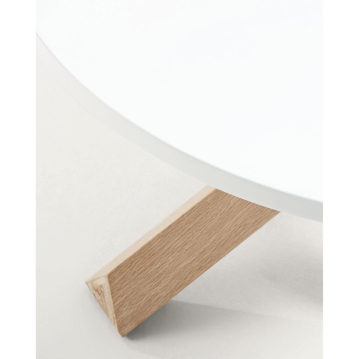 Coffee table with top in white matt lacquered MDF solid oak white wash finish legs. Height: 45 cm.