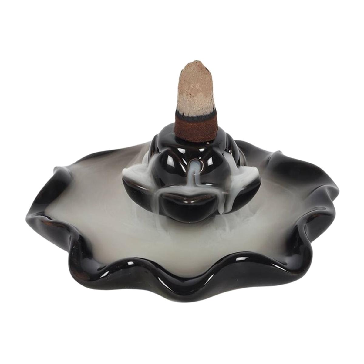 A simple yet beautiful backflow incense burner in a black ceramic lotus pool design. When the cone is lit the smoke from the cone cascades downwards in a mesmerising waterfall effect to pool at the bottom. Beautiful to watch. For best effects burn indoors in an area away from any sudden air movements. Please note that after burning it is normal for a light oily residue to appear on the oil burner, for this reason we recommend protecting any furniture it is placed upon suitably. The residue can be easily wiped off the burner with a damp cloth. Please exercise caution when burning incense. Only backflow incense cones should be used with this product, standard incense cones will not create the desired effect. It is normal for cones to take up to 10 minutes after being lit to start creating the smoking OR mist effect.