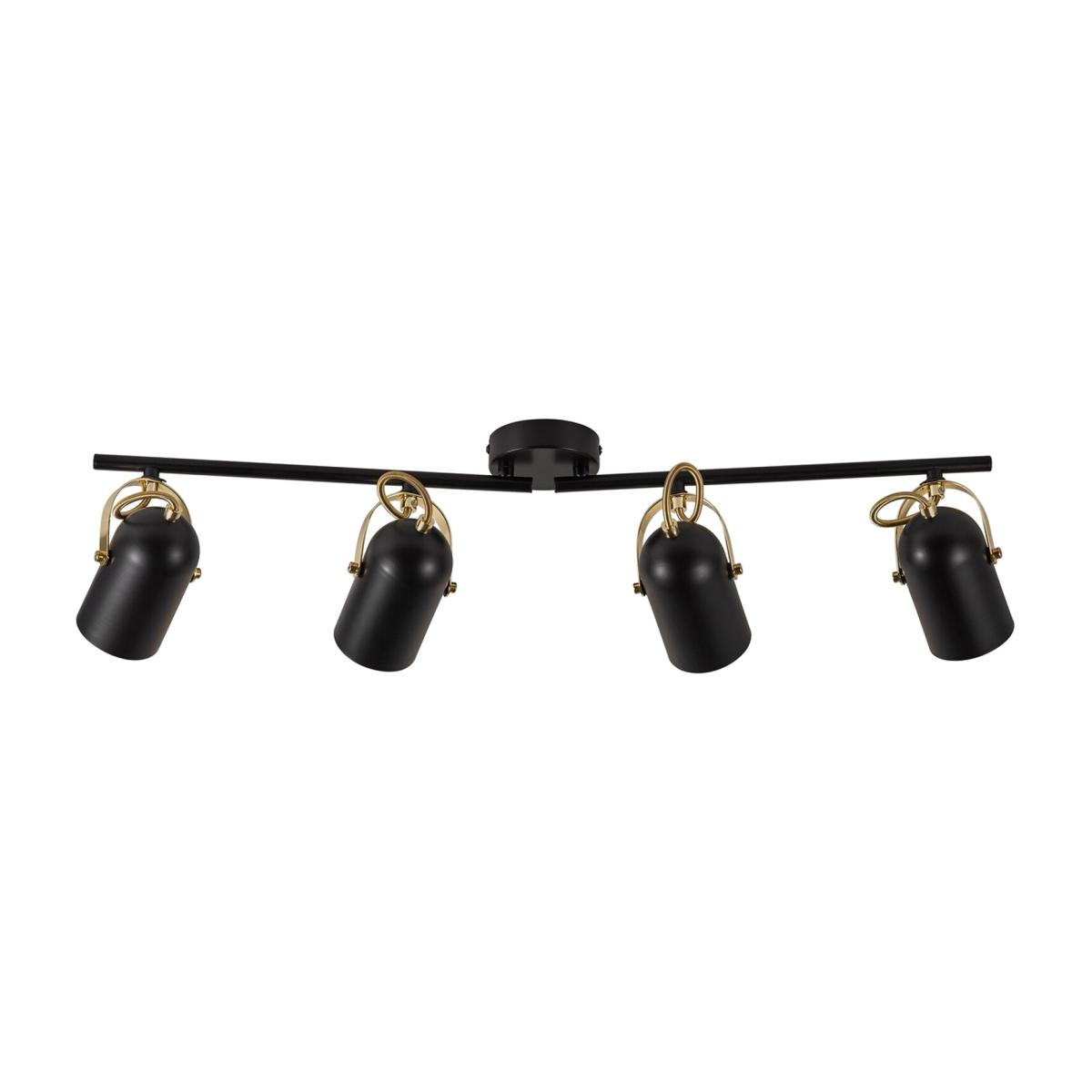 Industrial style. Adjustable lamp head for a directional light. Black silk matt finish and polished brass details, Set up a beautiful lighting scheme with the help of the Lotus Black 4-Light Spotlight Bar with brass details. Its industrial style, matt black finish, and polished brass trim make it an easy fixture to pair with existing finishes. It also has adjustable lamp heads for directional lighting.