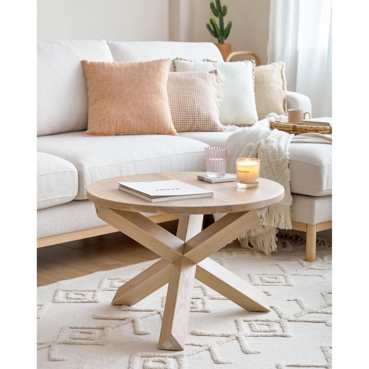 I’d pick the Lotus table for its unfussy oak grain and neat Ø65 cm footprint - it’s solid enough to feel grounded but small enough for a cosy living room or snug seating nook. The simple cross-leg design works well in Scandi, mid-century or contemporary interiors, and the light oak tone pairs easily with muted greys, deep navys or even richer jewel tones. For styling, keep it functional: a low brass tray at the centre holds remotes or coasters, a small ceramic vase with fresh greenery adds a fresh touch, and a couple of coffee-table books tucked underneath introduce varying heights. Pop the table on a natural-fibre rug to define the space and soften the look against hard floors.