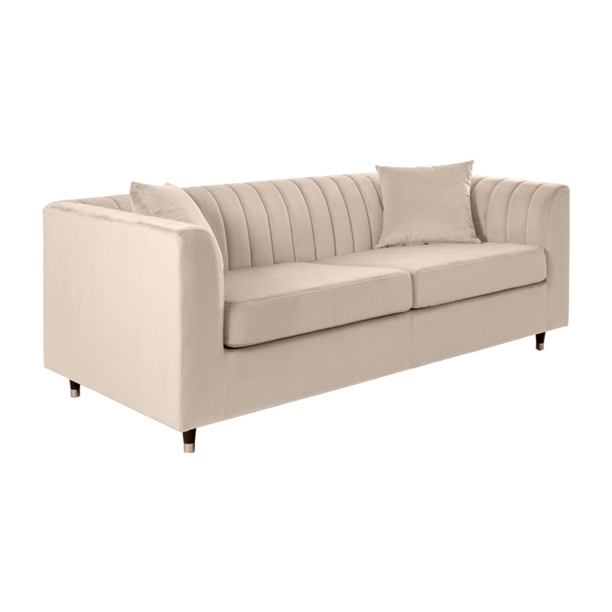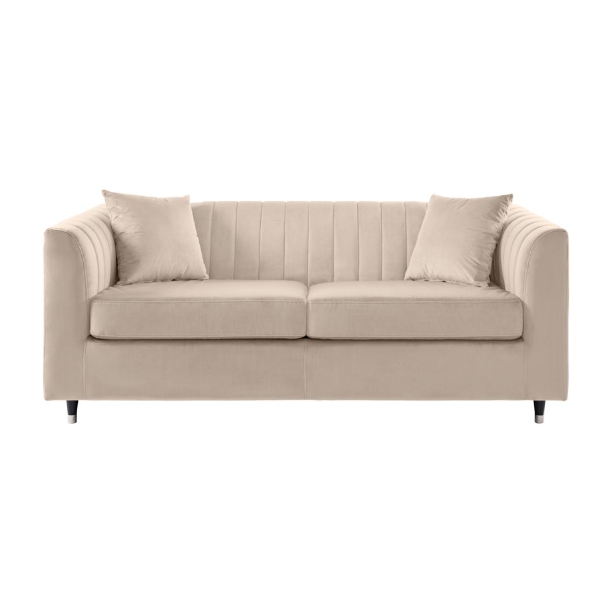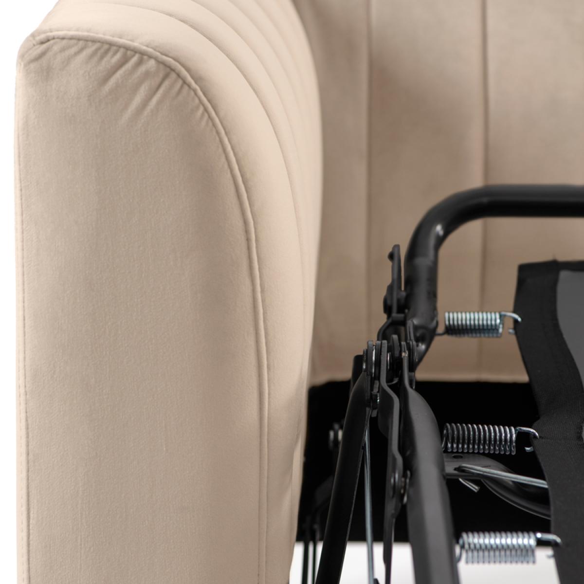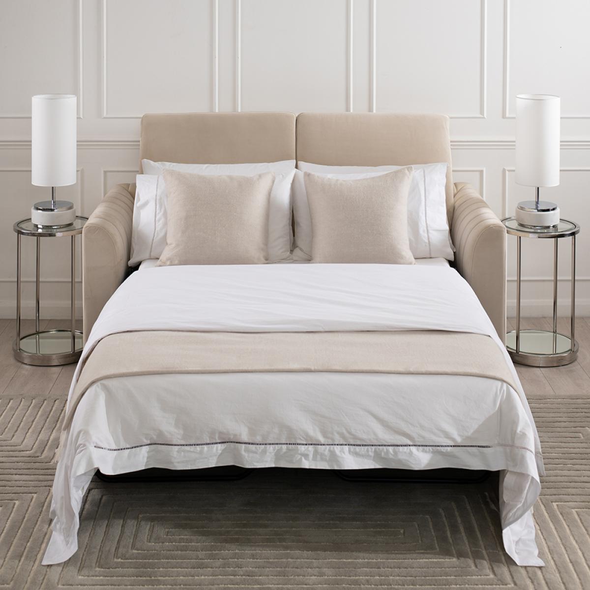 A handsome sofa bed inspired by highly collectable Mid-Century American furniture. Can be effortlessly transformed in seconds - ideal for guests and occasional use. Folds out to the equivalent size of a double bed. Ideal for use in family rooms and studies. Soft and practical velvet fabric. Deep padded upholstery with distinctive fluted quilting. Black stained wooden legs with chrome ferrules.