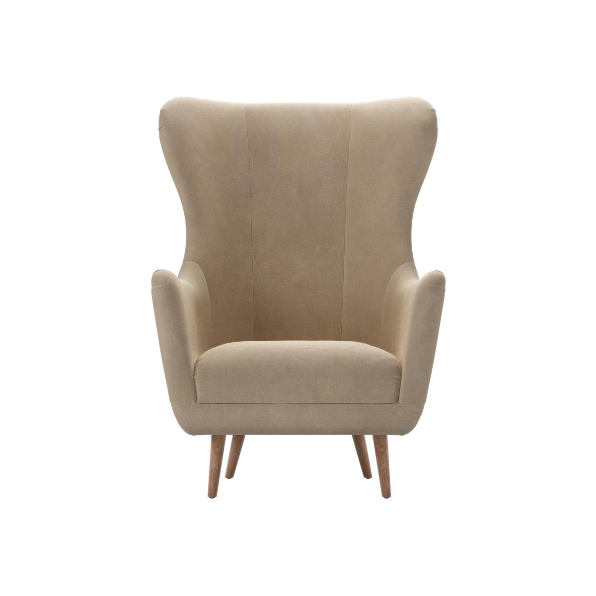 I love this armchair for its timeless silhouette and versatile colour. The Fawn Aquaclean velvet lends a soft, tactile quality that stays practical thanks to its stain-resistant finish, making it ideal for family rooms or high-traffic areas. It works particularly well in mid-century or Scandinavian-inspired interiors, where its sleek lines complement minimalist or slightly vintage schemes. To style it effectively, consider pairing with neutral or warm-toned accessories, such as textured cushions or a cosy throw, to create an inviting yet polished look. Its elevated legs add a sense of lightness, so it can visually lift a space without overpowering it.