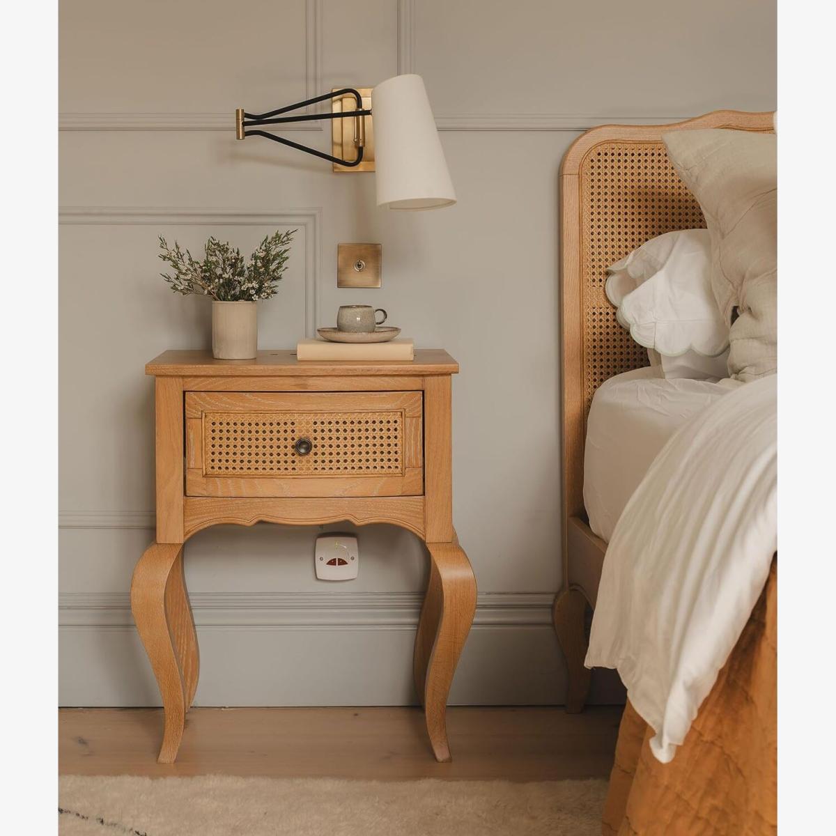 The Louis bedside table features a stunning rattan cane drawer front and an aged brass handle. This French-style cabinet sits on beautiful cabriole legs and boasts intricate carvings. It is finished in a beautiful weathered oak hue or fresh white painted finish. Measuring 54cm wide, 36.5cm deep, and 69cm tall (approximately 21.3 x 14.4 x 27.2 inches), this assembled piece complements the matching Louis range furniture, including beds, chests of drawers, and wardrobes. The Louis wooden bedside table, crafted with attention to detail, adds a touch of elegance to your space.