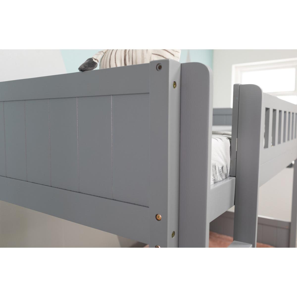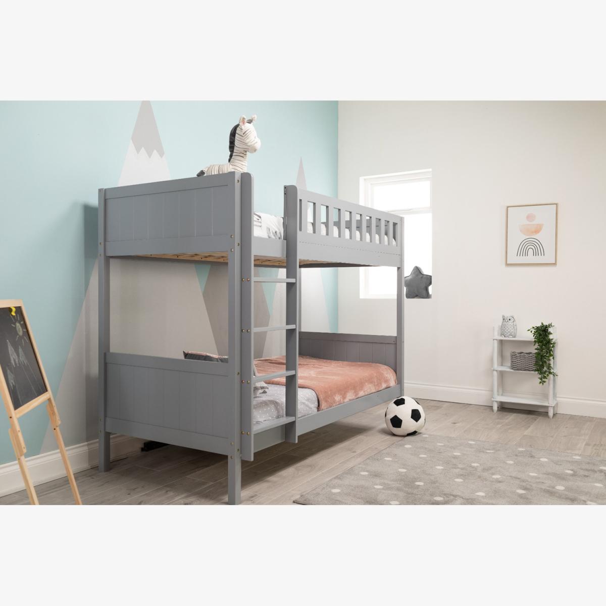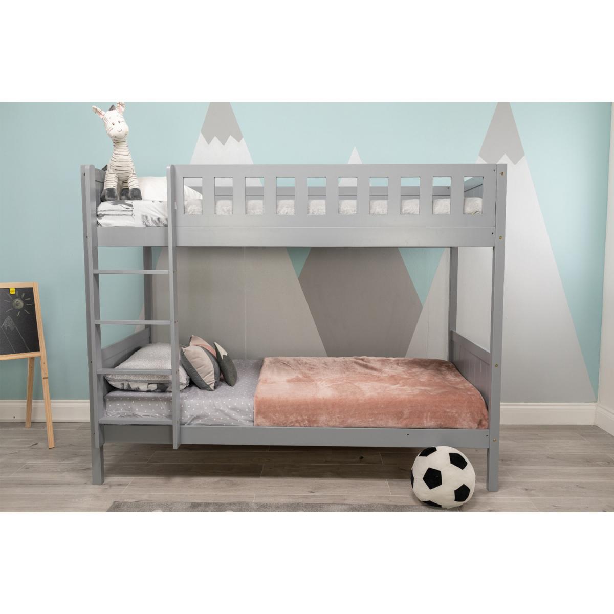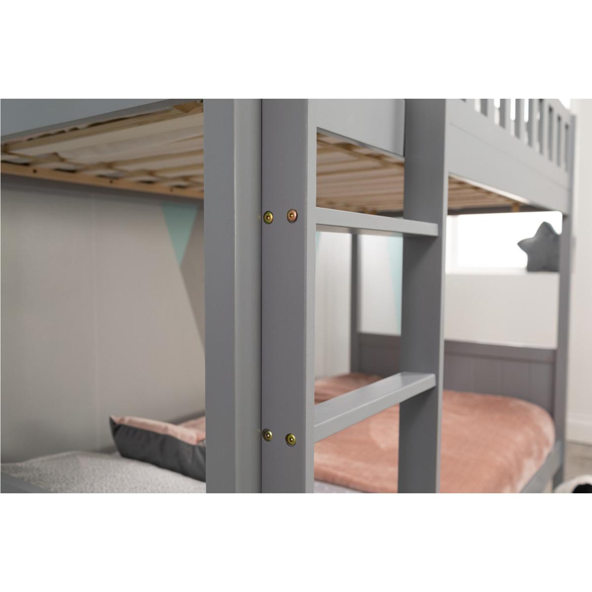 A fabulous compact bunk bed, perfect for smaller spaces, constructed from solid pine with a sleek grey or a clean white finish that will work well in any colour scheme. The Louis features solid shaker style panelled head and footboards, creating a cosy sleeping space for your little ones to snuggle down for the night. The deep ladder treads make accessing the top bunk safe and easy and the solid pine slatted base offers a sturdy mattress support whilst allowing airflow.
