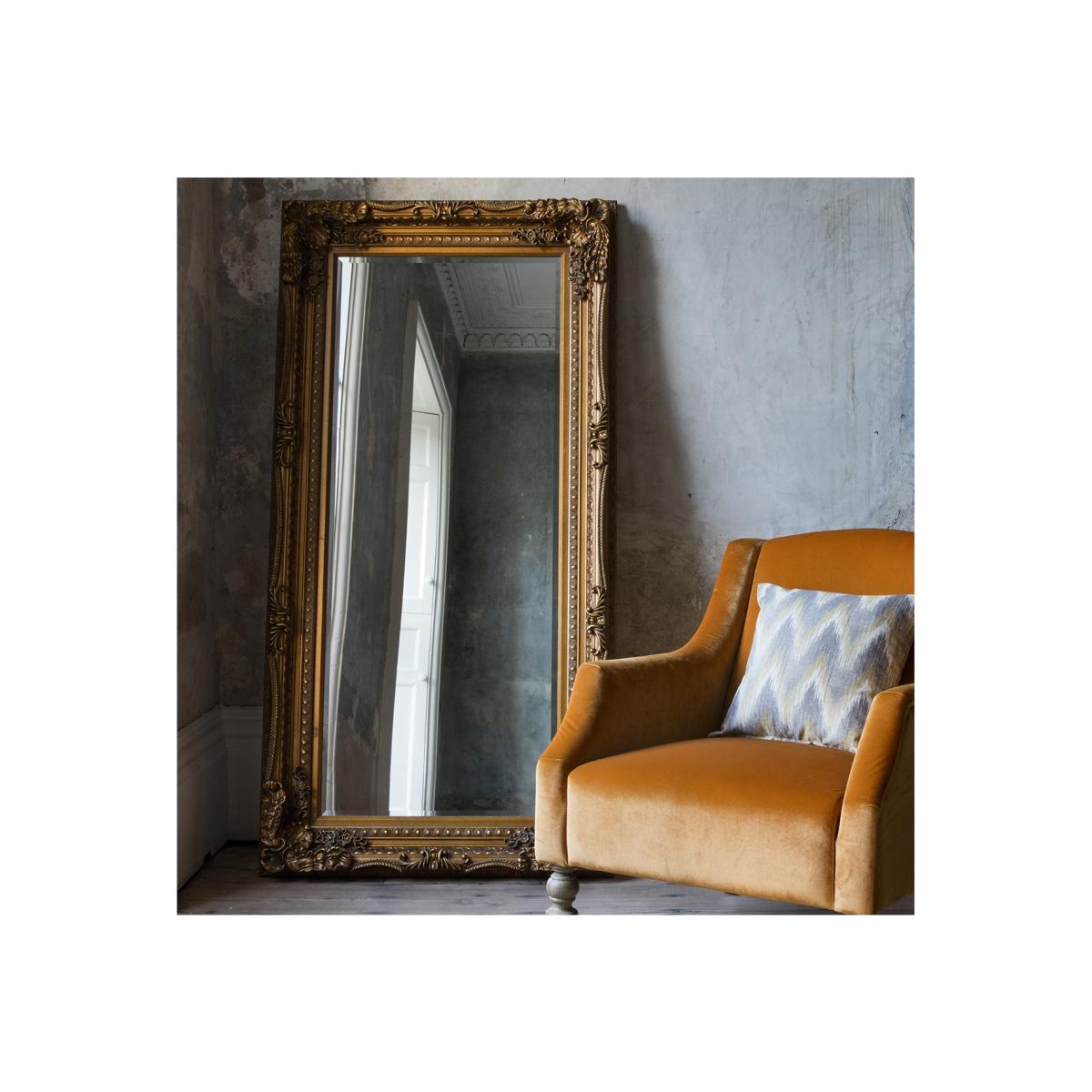 DIMENSIONS. H175.5cm x W89.5cm FEATURES. Sumptuously extravagant hand made baroque framed mirror. Gold leaf finish. Leaner mirror. Perfect for the living room dining room bedroom or hall..