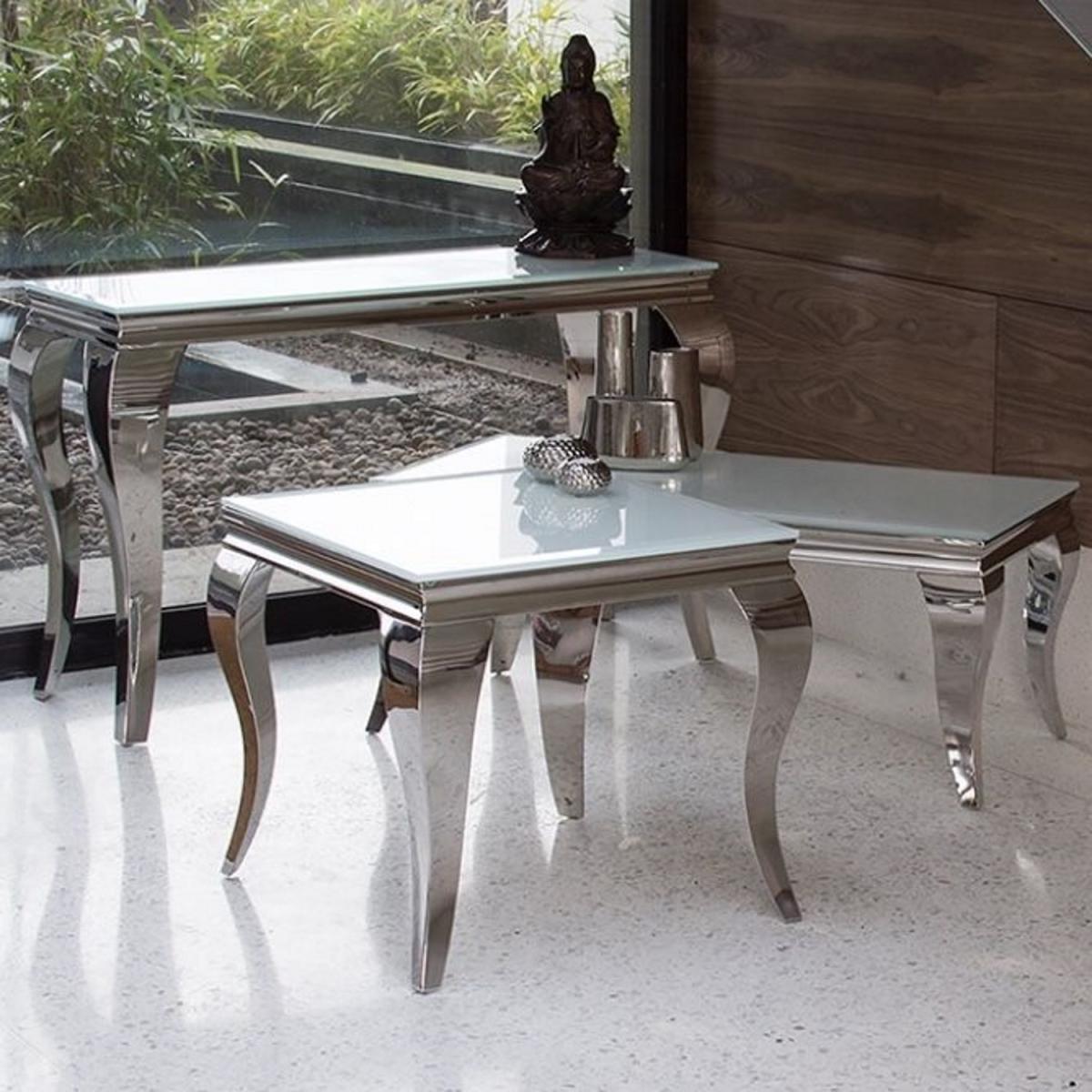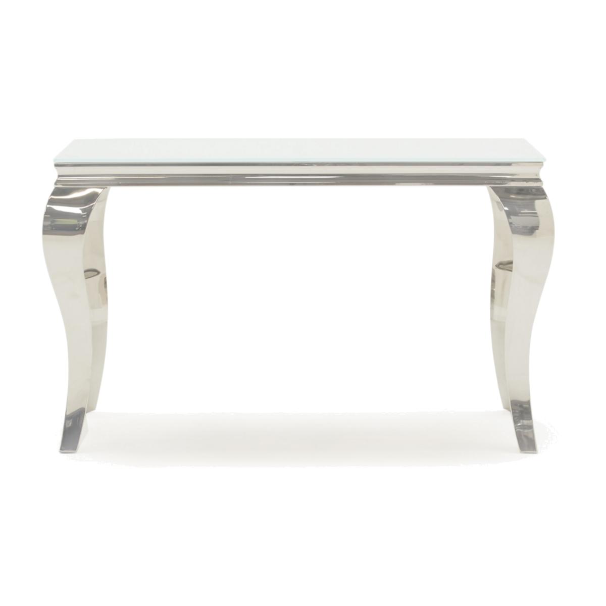 . The Shoreditch stools exude urban chic. With an industrial style the Shoreditch stools are real statement pieces mixing well in to any settingDIMENSION S. W120 x D40 x H76 cm FEATURES. Stylish and elegant show stopper piece Ideal hallway surface space White tempered glass top Curvaceous polished stainless steel legs. Made to last design and build. Coordinating pieces available. Louis range ELEGANT and; CURVACEOUS Stealing the lime light the Louis console table takes pride of place in your space. Supported by curvaceous legs an elegant element is introduced whilst the combination of sleek white glass and polished stainless steel keeps the Louis console table on trend with a modern look. CENTRE STAGE The Louis console table has show stopper looks however it won't dominate your space. The sleek glass helps to enhance the look of light and space within your room. Measuring 120x40 cm this trendy narrow table is ideal for smaller spaces such as your hallway or in front of a window. MADE TO LAST With a combination of polished stainless steel and slick tempered white glass you know that the Louis console table has been designed and made to last truly worth the stylish investment. Thanks to the smooth nature of the high quality materials that have been used to make the Louis console table it is super easy to wipe clean add a hint of polish to refresh the natural shine. ASSEMBLY The Louis console table will be delivered flat packed to ensure you get it through your doors and into the room of your choice. Self-assembly is required and can be managed by one person .