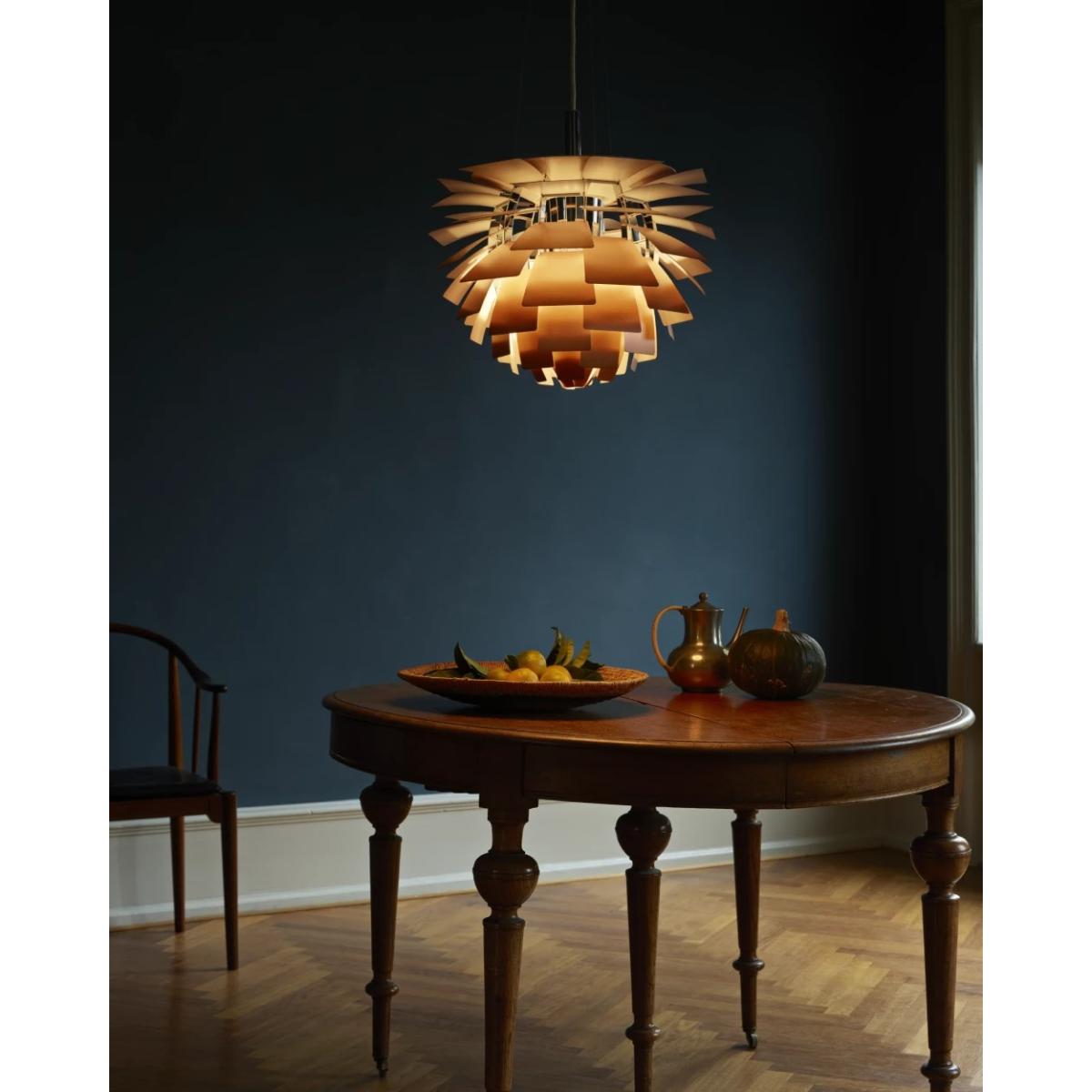 PH Artichoke pendant lamp from Louis Poulsen is a masterclass in craftsmanship. With 72 leaves, it forms a unique and sculptural design that characterizes the room with its elegance. The opal white glass screens off and reflects the light to provide distinct and glare-free illumination. Its sculptural appearance makes it an artistic interior detail in the home's larger rooms and becomes a natural focal point. With its soft and comfortable light, it creates an atmospheric ambiance wherever it hangs.