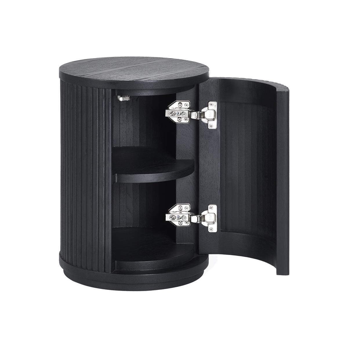 Experience the epitome of sophistication with the Louis Side Table in Black. This circular masterpiece, graced with intricate fluted details takes centre stage as a luxurious focal point in your living space. The sleek matt black finish accentuates its timeless charm, while the push-touch door reveals a concealed haven of shelving space for your cherished items. Set any decorative pieces atop this exquisite piece and immerse yourself in the lap of luxury. With minimal assembly required, enjoy a hassle-free setup for instant elegance in your home.