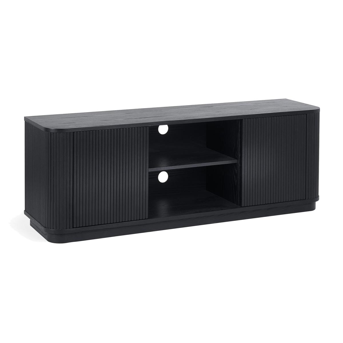 I love this TV unit for its sleek, modern design and versatile black finish, making it a great foundation for both contemporary and eclectic interiors. It works particularly well in minimalist spaces where clean lines are key, as well as in more vibrant, styled rooms where it can ground the overall look. Practical styling tips include layering decorative objects on top, like a vase or artwork, to add personality, while utilising the open shelving for media devices or baskets to keep clutter at bay. Its ribbed texture adds visual interest without overwhelming, so it pairs nicely with both textured and smooth materials in your scheme.
