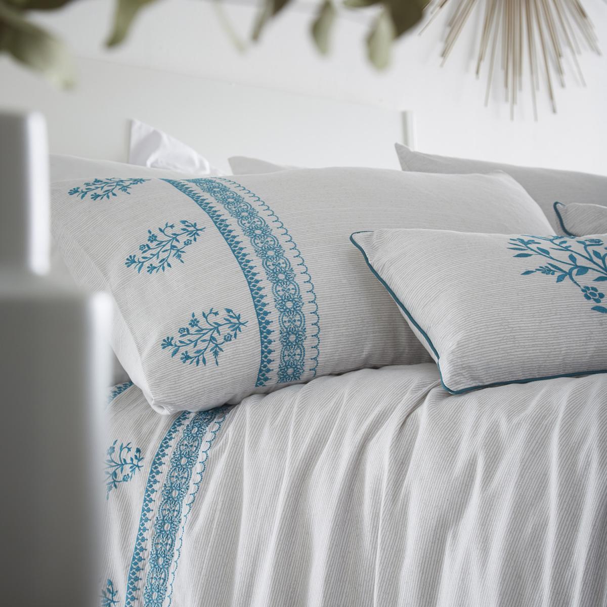 Light and airy with an elegant charm, the Louisiana Duvet Cover and Pillowcase Set features deluxe floral and lace embroidery atop a gentle printed grey pinstripe base. In bright and beautiful colours that stand out in any vintage or country inspired bedroom, you can complete the look of your boudoir and layer up with the matching embroidered cushion.