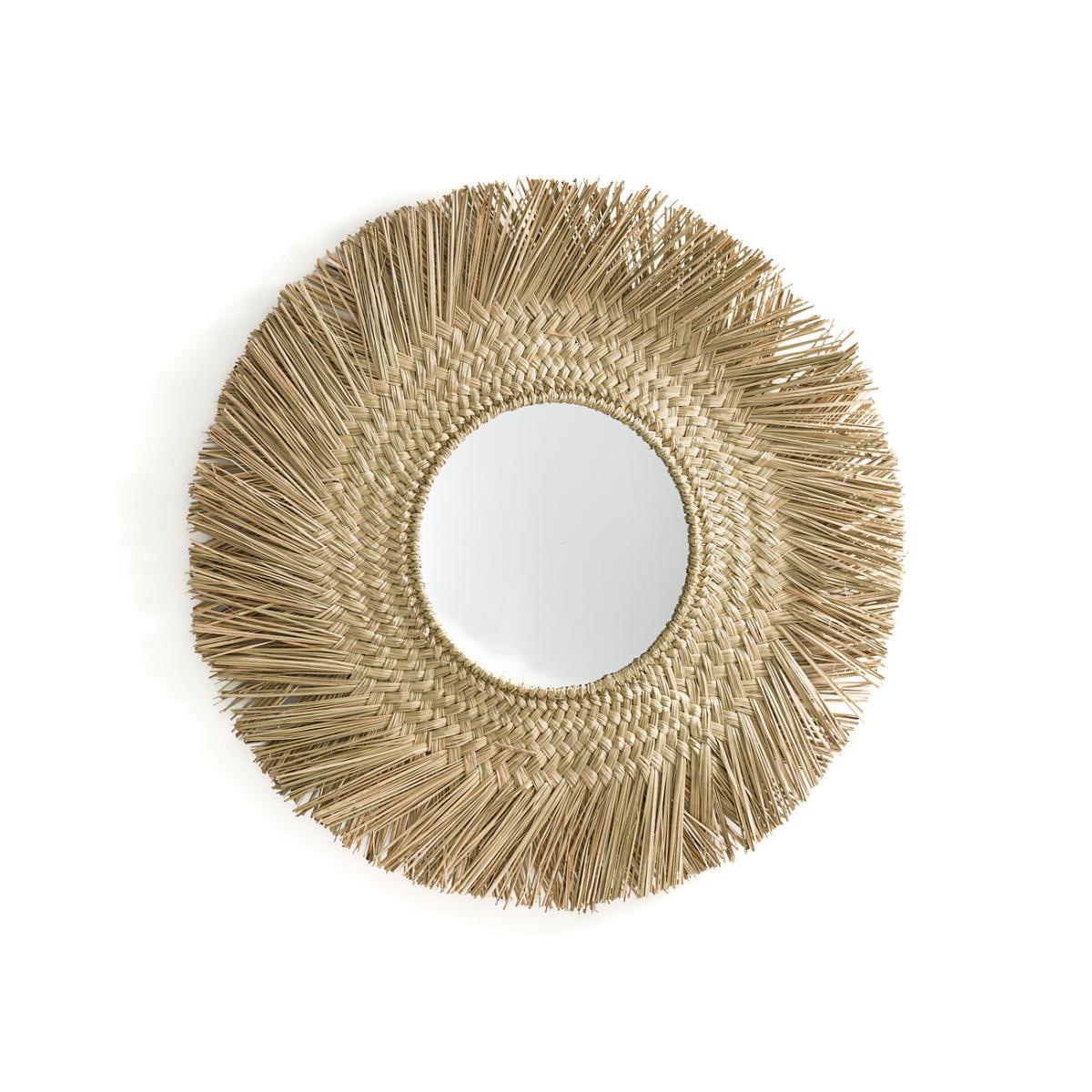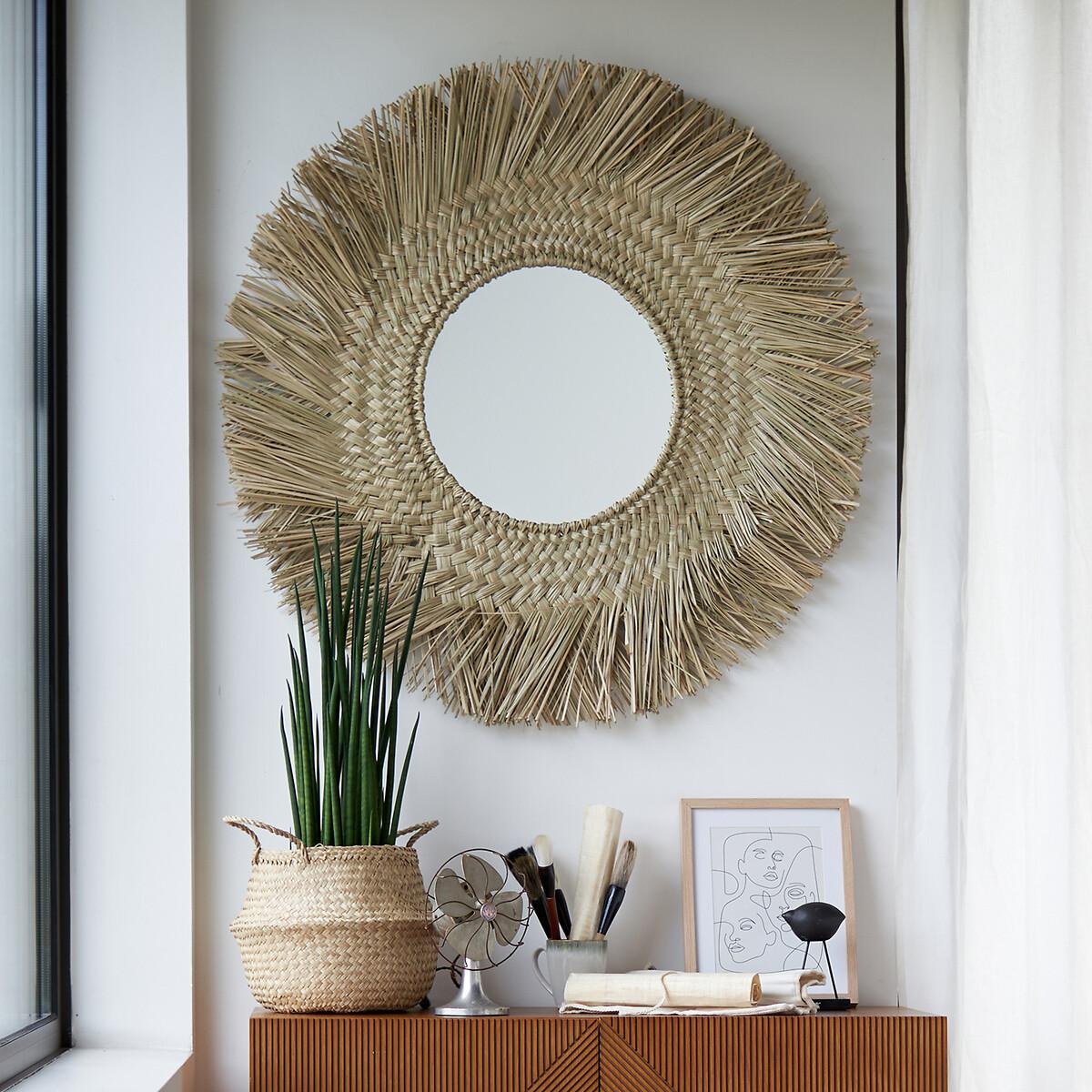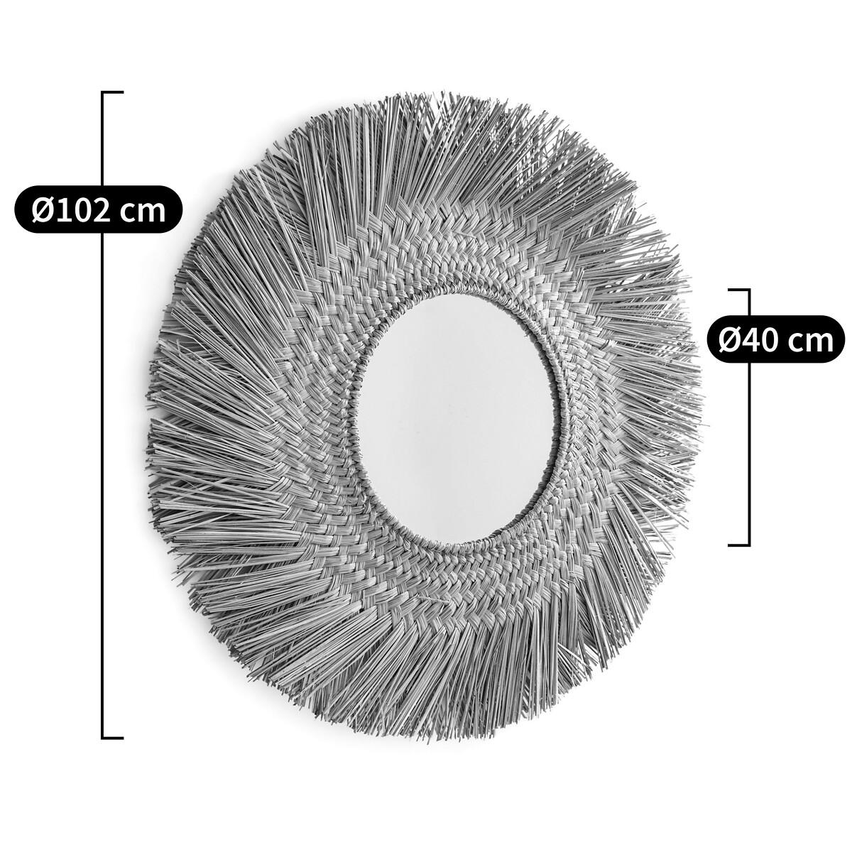 The Loully sunburst mirror. This charming sunburst mirror reflects natural light into your interior. Product Details • Woven grass • Sun design • Metal structure • To be fixed to the wall (screws and plugs not supplied) • Artisanal craftsmanship. Dimensions • Overall diameter : 102cm • Diameter of mirror : 40cm • Thickness: 2.5cm. Dimensions and weight of parcel1 parcel • L102 x H102 x D6cm. 4.7kg
