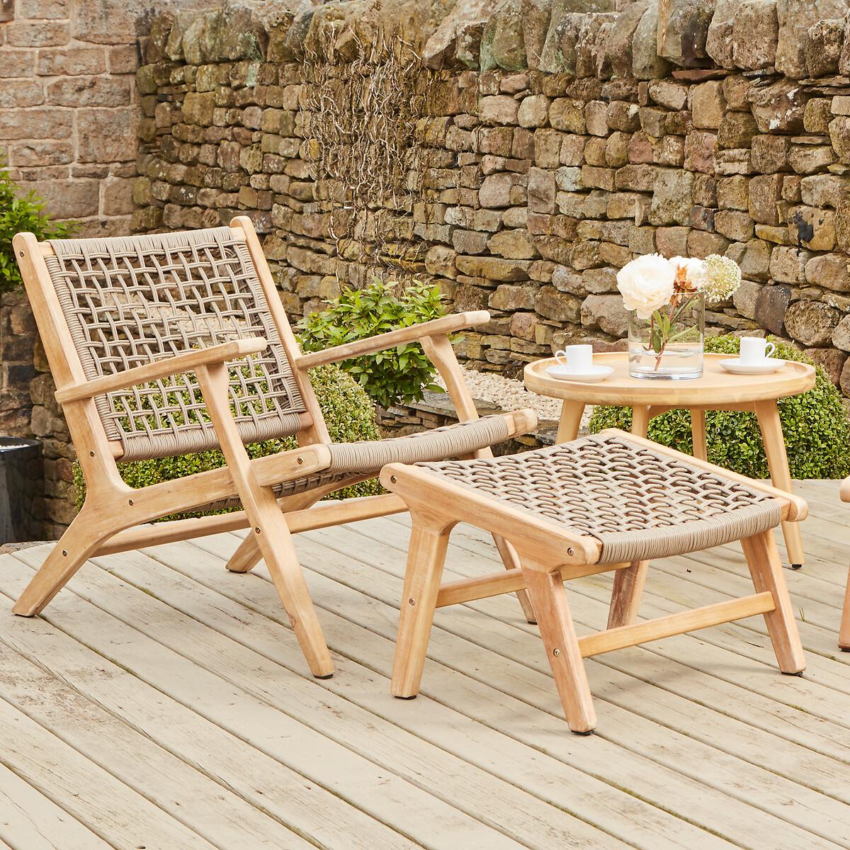 Please note: this product cannot be delivered to all Offshore Islands, Northern Ireland or Republic of Ireland - postcodes starting with; AB, BT, DD, IV, KW1-14, PA21-38, PH, TR17-27 & ALL ROI.The Lounge Chair & Hocker Footstool Garden Furniture Set is the perfect addition to any garden for those lazy sunny days. The stylish low chair and footstool is suited to relaxing and finished in a natural Acacia wood. The material seat is both durable and waterproof and features an open weave design. Please note that the table is not included. Product Dimensions:Chair: 67cmx87cmx72cm. Footstool: 59cmx47cmx39cm. Packaged Dimensions:Parcel 1: 84cmx 74.5cmx 68.5cm Weight: 11.5kg Parcel 2: 62cmx 48cmx 42cm Weight: 5.2kg. Please note this item is a large piece of furniture that will require some self assembly. Please ensure you have space to receive delivery. This product will be dispatched by one of our trusted suppliers. You’ll be contacted by their selected courier about your delivery.