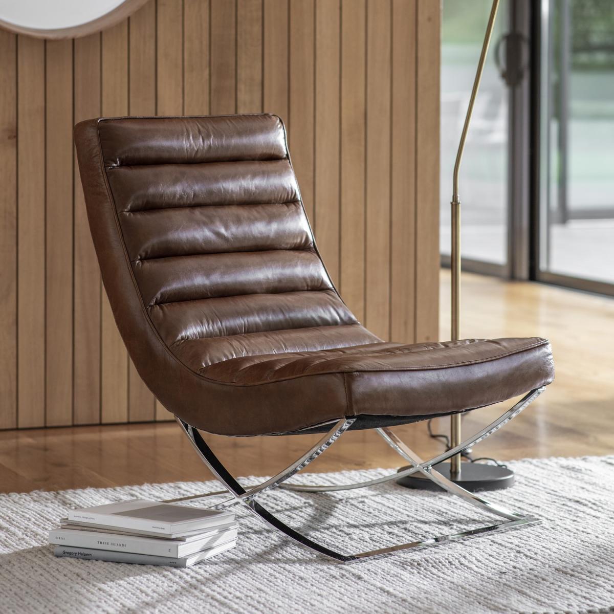 Lounge Chair in Brown Leather & Metal Base - Caspian House
