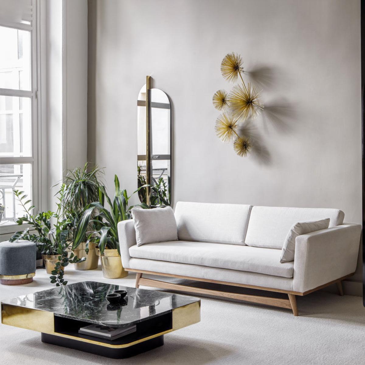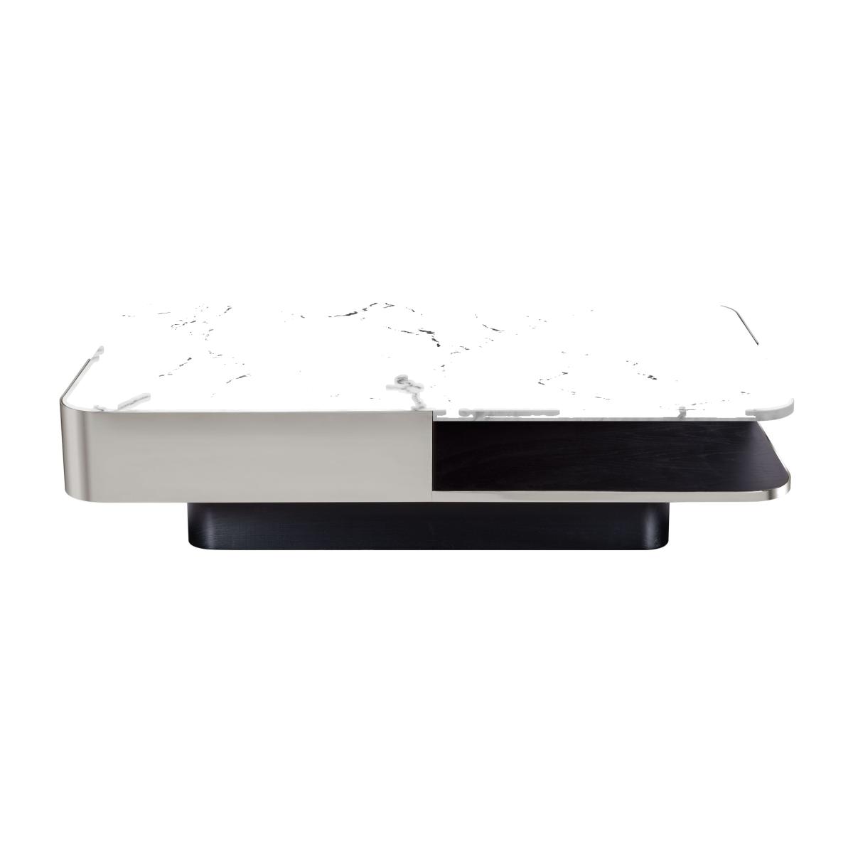 A luxurious, refined style for this coffee table which displays a vintage look inspired by furniture from the 70s. The Lounge coffee table offers a superb combination of premium materials. The marble top is encircled by a wide stainless-steel band. The tinted solid beech structure leaves the wood’s veins visible. Like a precious jewel, the silver metal dresses the minimalist structure with elegance. It binds the materials together for a result filled with originality. The cantilevered top gives life to a play between full and empty spaces and reveals a very practical storage space. This sculptural piece, with its ample volumes, plays around with full and empty spaces, the cantilevered glass and a combination of high-end materials. Chic and elegant, this coffee table will bring a touch of incomparable sophistication to your interior design. It will look great in both very modern and more traditional interiors. An exceptional piece!