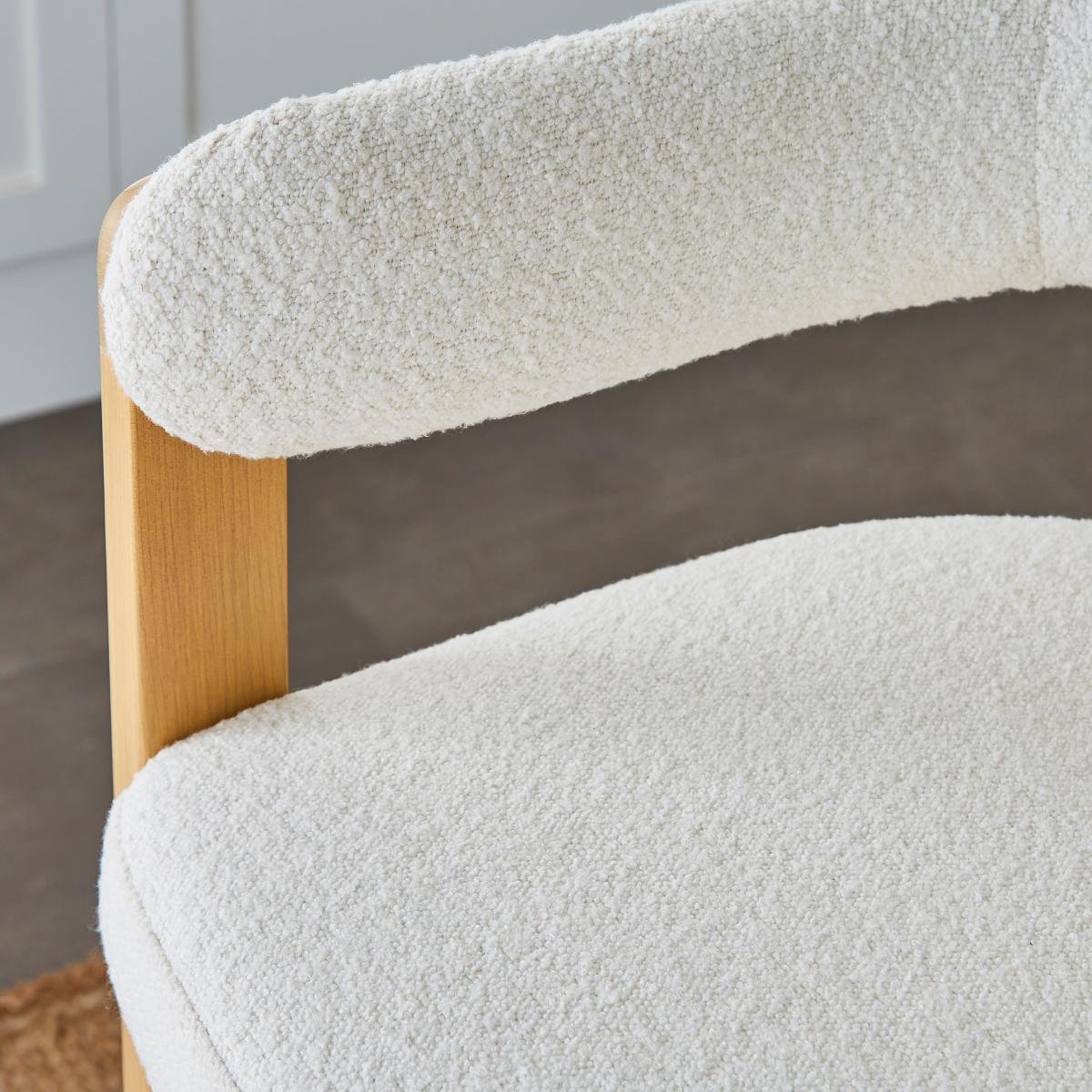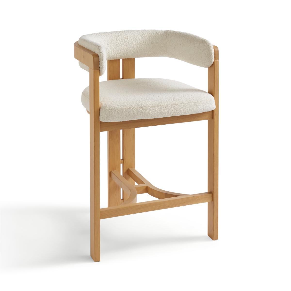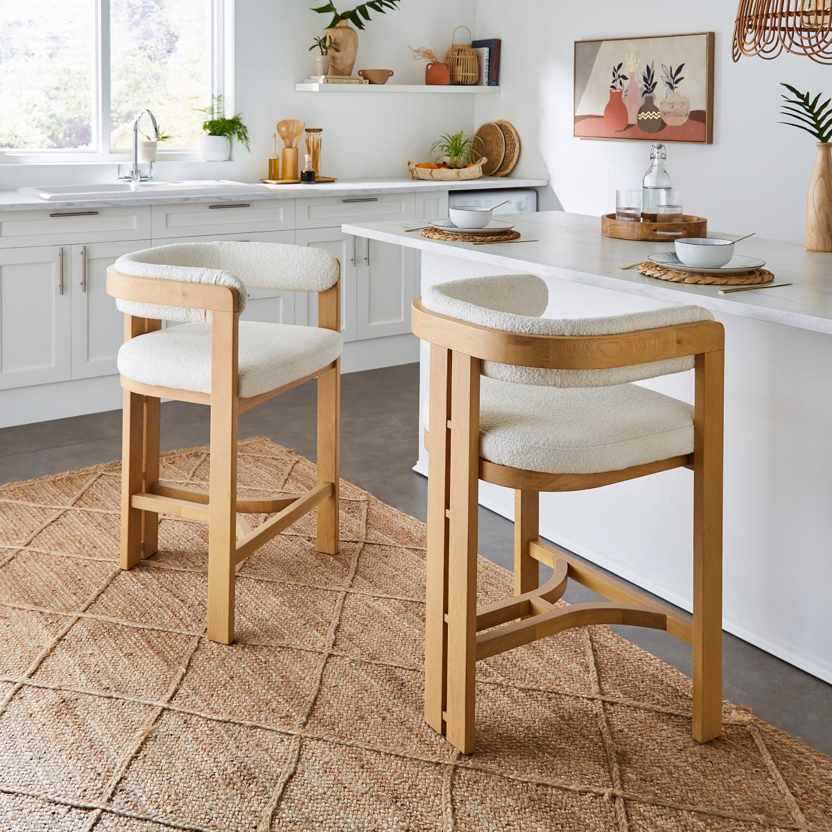 I’m a big fan of this boucle barstool for its blend of tactile comfort and clean-lined form. The soft, ivory boucle upholstery introduces subtle texture, while the light oak frame keeps the look fresh and versatile. It suits Scandi-inspired kitchens, coastal retreats or any modern scheme in need of a warm, inviting perch. For styling, position a pair around a white quartz or reclaimed-wood island to balance hard and soft surfaces. Add a jute runner or natural-fibre rug beneath to ground the stools and protect floors. If you’re aiming for a more layered effect, team them with simple, matte-finish pendant lights and a few woven accessories: a small tray of pottery or a linen table runner will tie everything together without cluttering the space.