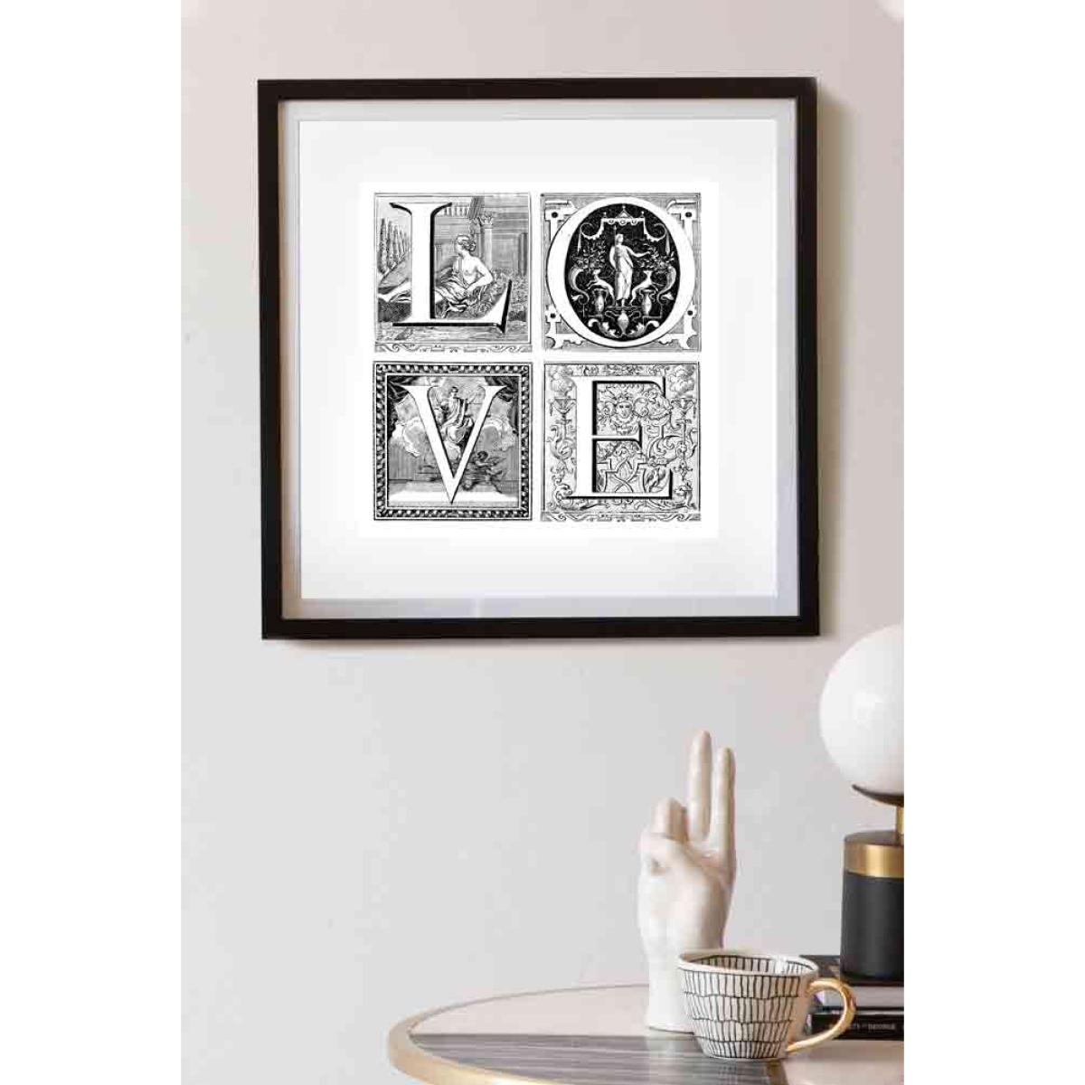 About The Love Art PrintExuding a chic yet timeless charm, the Love Art Print is a beautiful image that uses lettering and illustration to create a fabulously unique piece that will bring joy to any corner of your home, available framed or unframed. This wonderful Word Art Print features four glorious designs inspired by ancient greek paintings layered with the word Love, the perfect gift idea for a special someone that will create the wow factor amongst any scheme. Why We Think You’ll Love The Monochrome Art PrintShowcasing intricate patterns and effortless style, this Contemporary Art Print is a must have for adding interest to your walls whilst bringing a luxurious feel to your interior. A Wall Art Print that will stand out from the rest, this show-stopping piece with its monochrome design is guaranteed to become the focal point of any space, seamlessly complementing your decor whilst introducing a traditional meets quirky allure to your existing style. Where To Style The Love Modern Art PrintCurate a magnificent picture wall by using this Typography Art as the stunning centrepiece pairing it with additional wall art and memories you hold dear for a display that is meaningful to you and ultra marvellous in style. A boldly beautiful addition to your bedroom space, hang this Black and White Art Print beside your bed or above a mantelpiece to bring instant sophistication and delight to your walls.