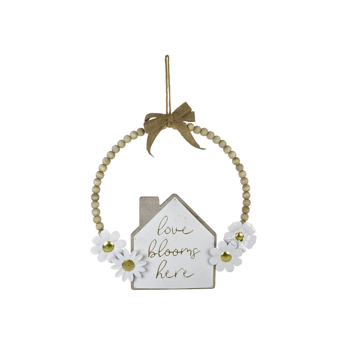 The Love Blooms Here Beaded Sign is a beautiful, quaint ornament for your space. The sign has a traditional house centrepiece accented with daisies and reads, 'Love blooms here.' The whole sign is completed with rustic beads and a bow to bring the country-house aesthetic together. It's quick and easy to hang with the included string and will look lovely in any room.
