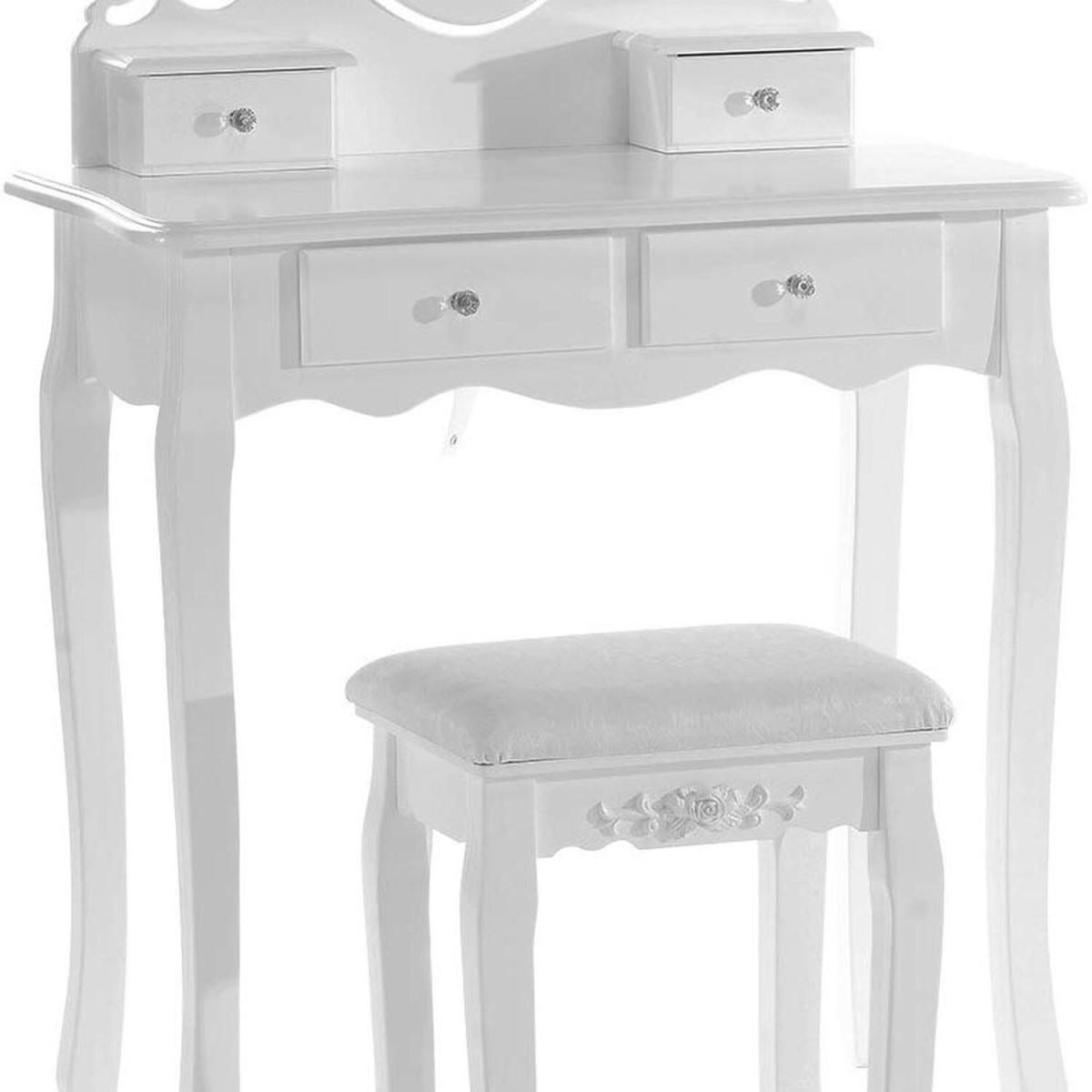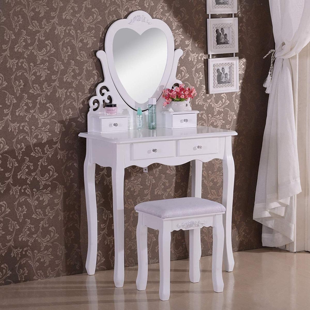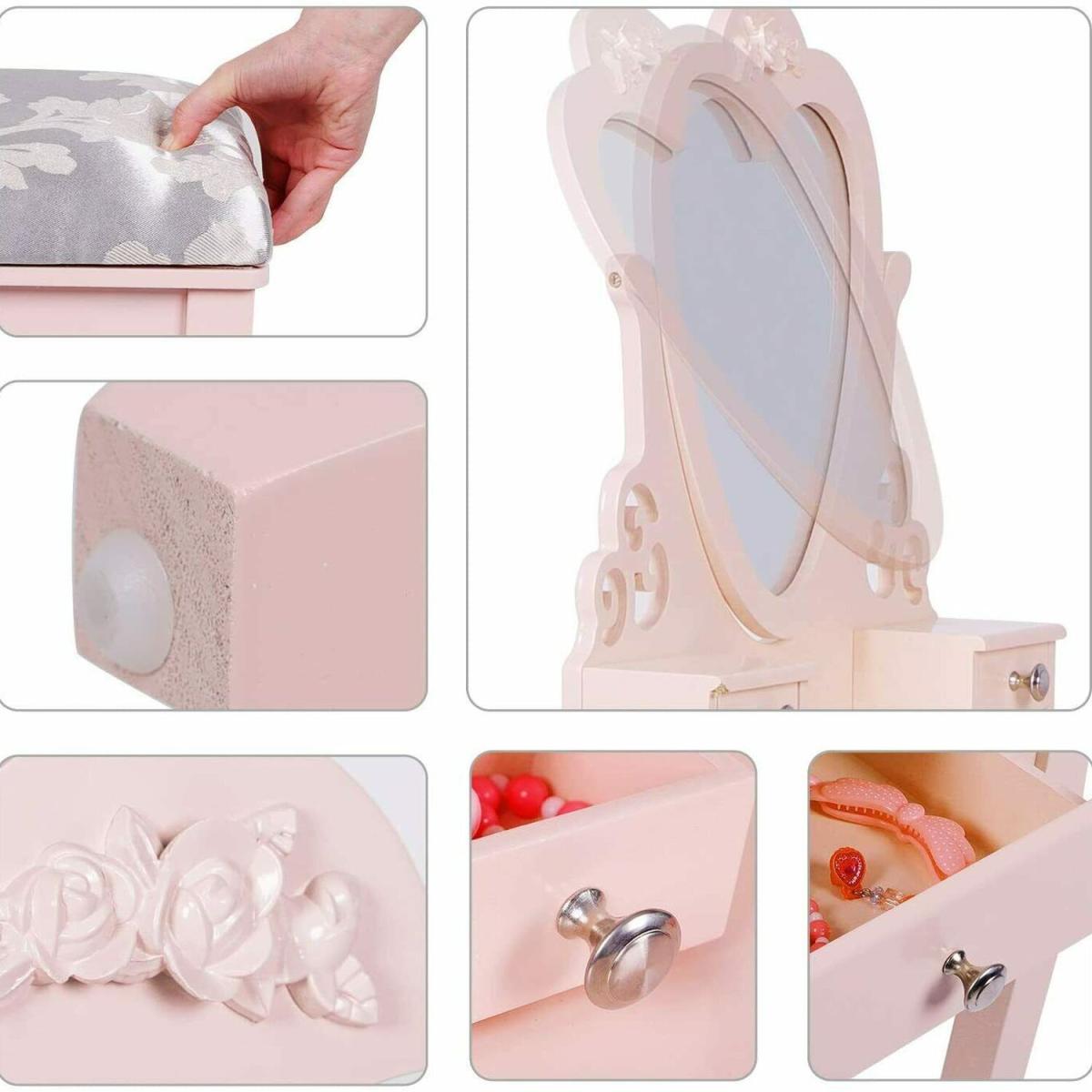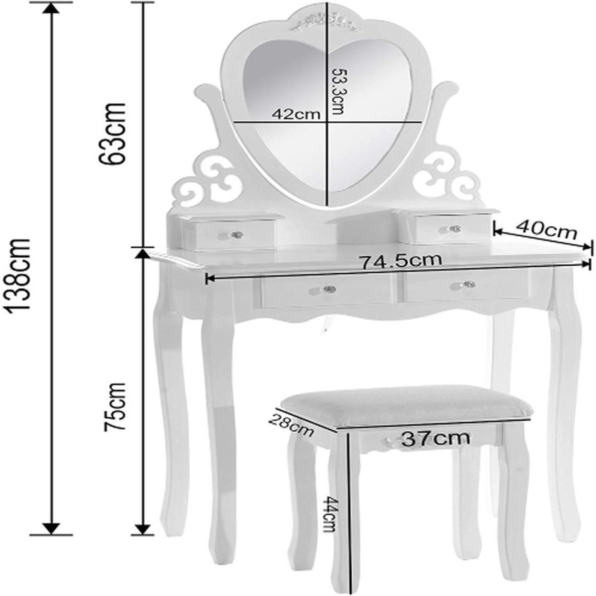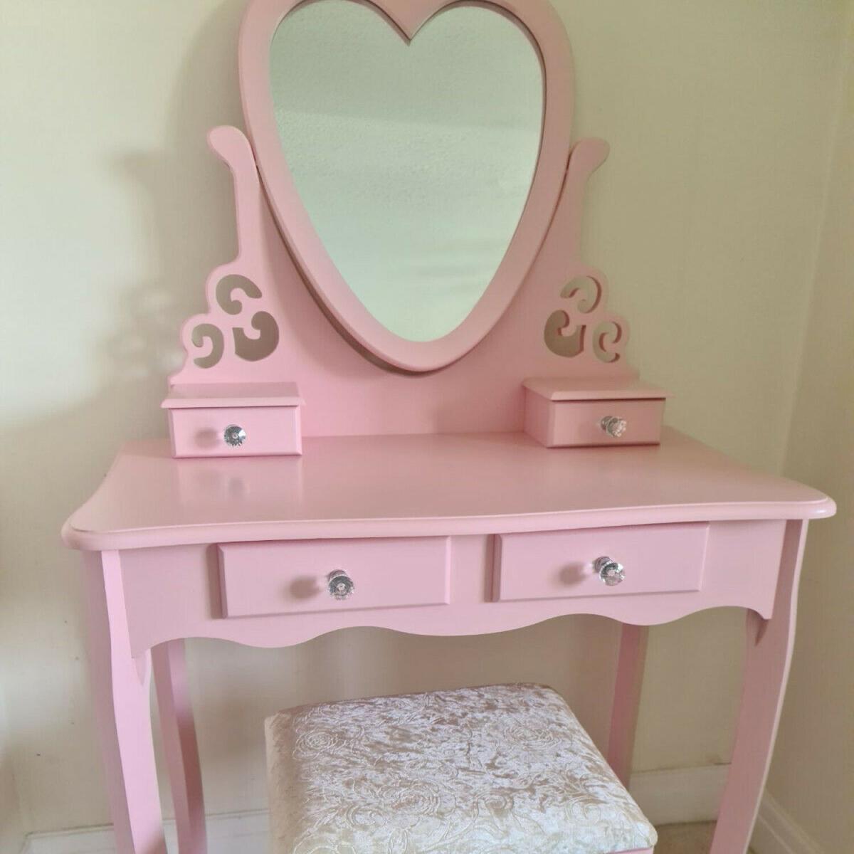 A stunning dressing table with heart shape mirror and delicate beautiful floral detailing that is compact in size to suit small rooms that include neutral-coloured padded stool. Gorgeous dressing table and cushioned stool set, cute and practical, and a lovely addition to a bedroom. Made from high-quality pink painted MDF, easy to wipe clean with a soft cloth.