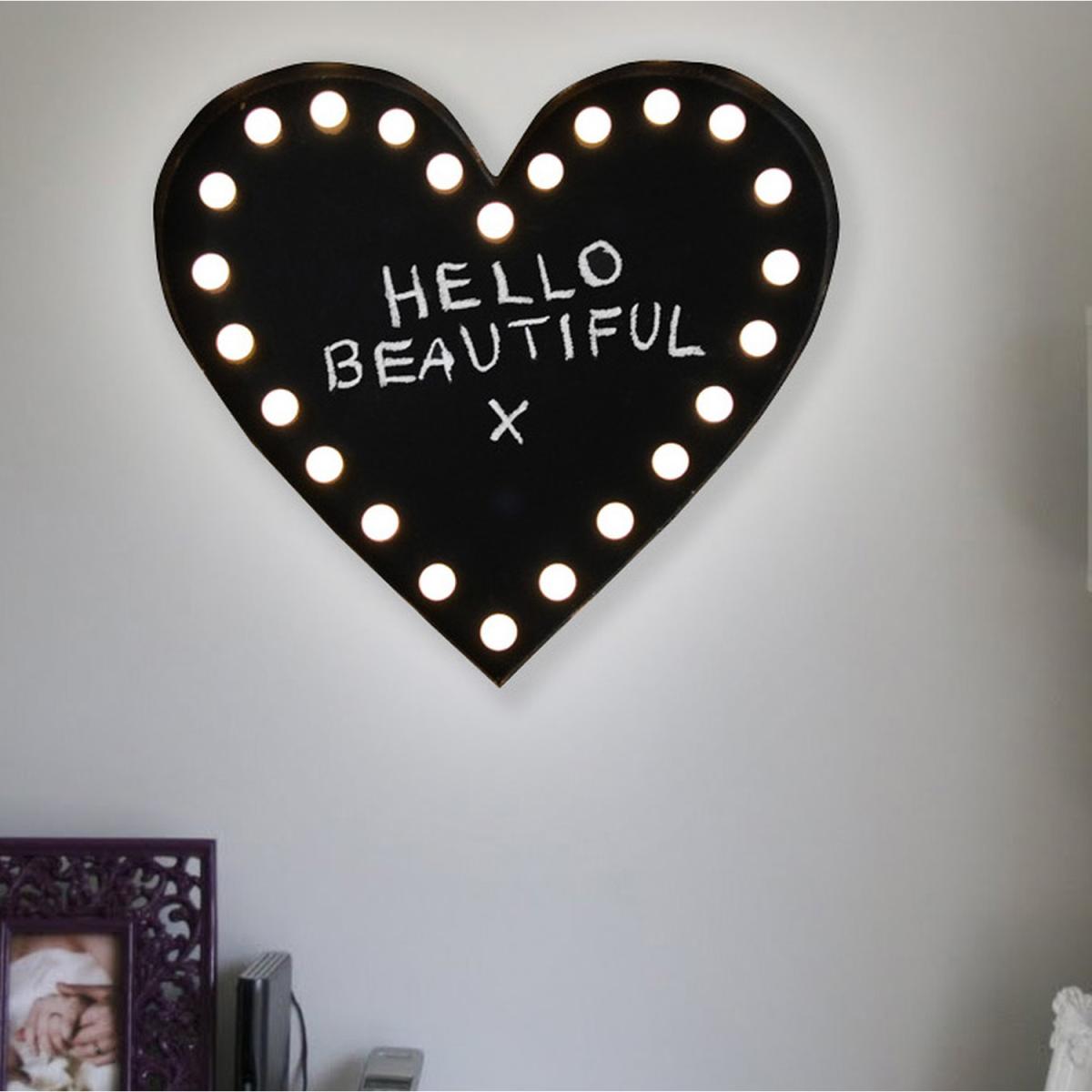Hang this LED Light-Up Love Heart up on your wall, in the hall-way, kitchen, or anywhere, and enjoy writing whatever your message of the day is in classic chalk. With just 2 AA Batteries, it turns on to illuminate the message and surrounding area with energy-efficient LEDs that give it a unique Hollywood-esque feel.