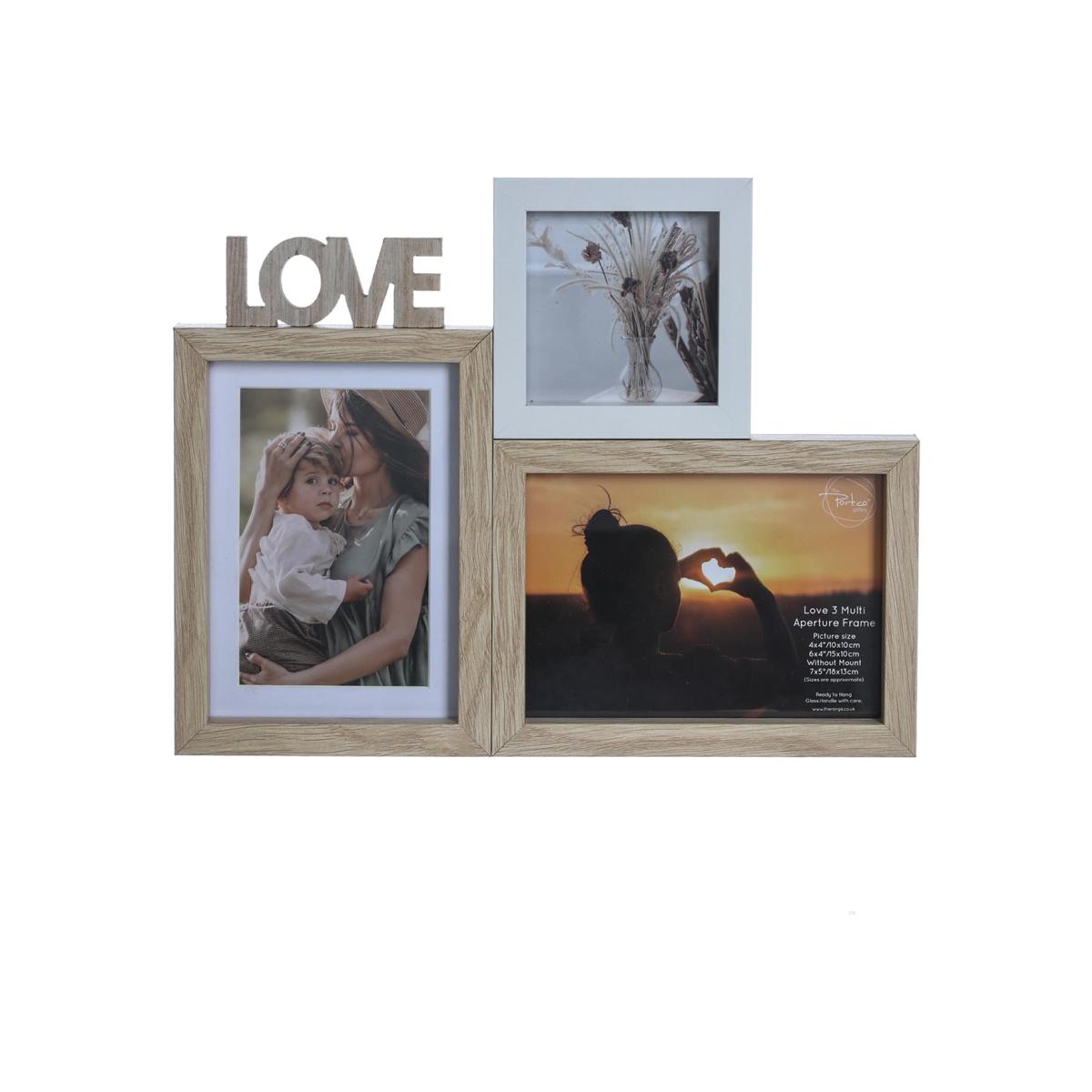 The Love Multi-Aperture Frame is a sweet, rustic way to display your favourite photographs. The frame has space for up to three photos in varying sizes to suit your style. It has a pretty wood-effect surround with a topper that says 'love' to bring a sweet and sentimental touch to the photo frame. This will look beautiful hanging in the living room, hallway, or bedroom and is easy to coordinate with multiple home decor designs.