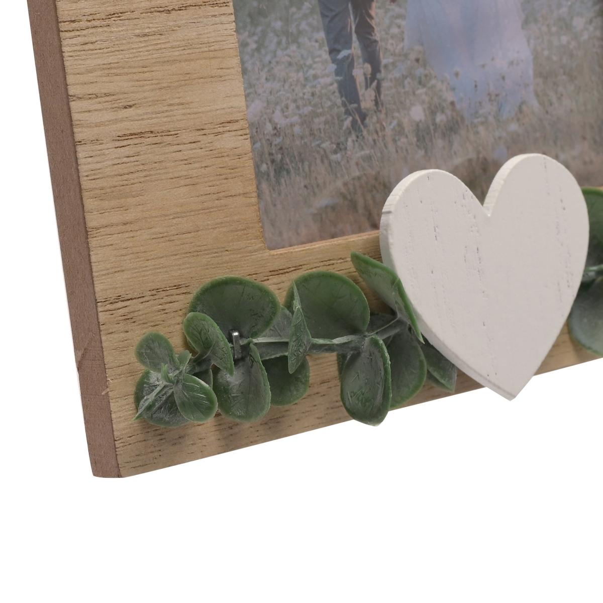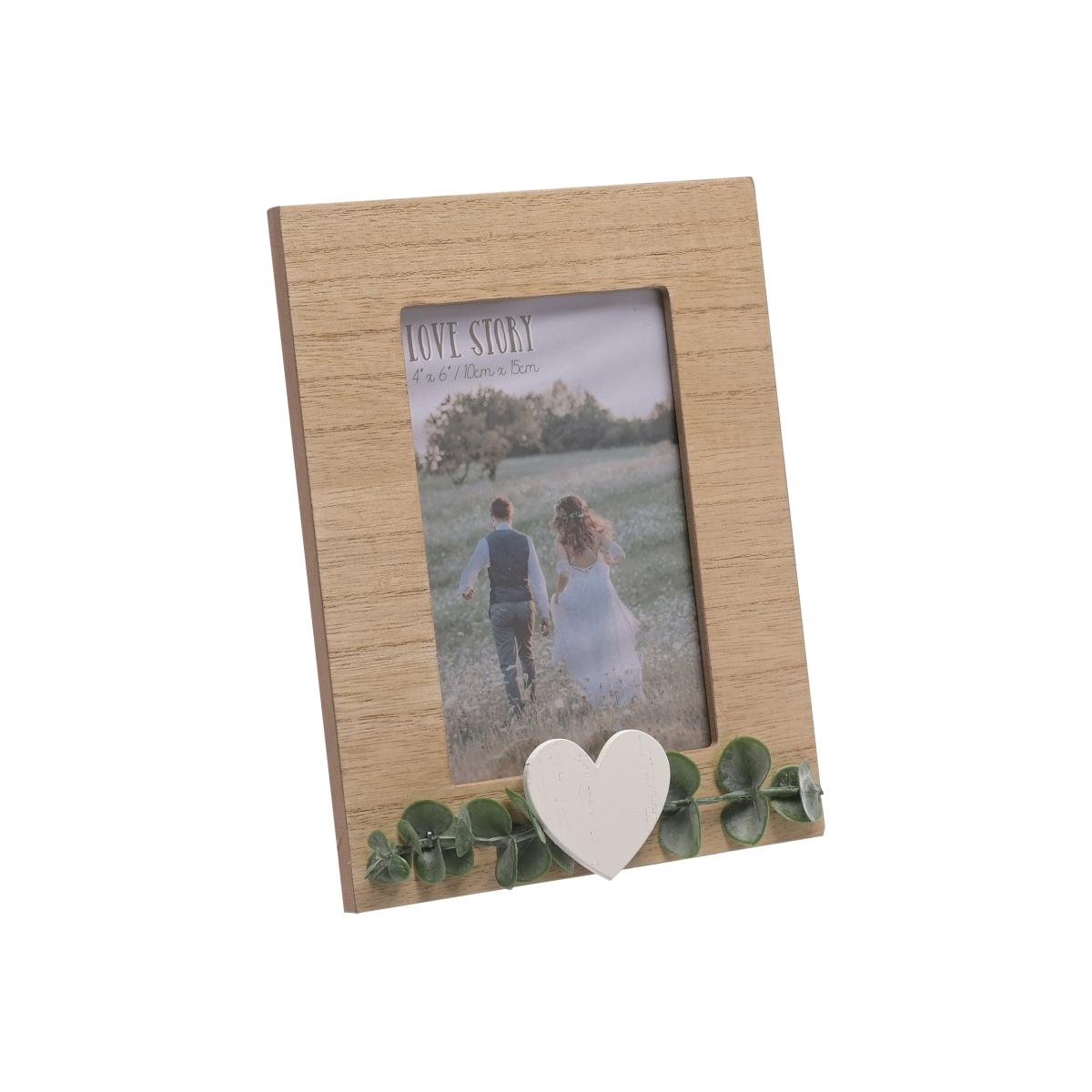 * Boho style* Portrait orientation* Free standing* Made from wood This Rustic Photo Frame from Love Story is a charming way to celebrate togetherness and capture memories. Featuring a natural wooden frame with a rustic finish, the design includes faux leaf decorations and a plain white heart embellishment. Perfect for displaying portrait photos, the frame includes an attached standing strut, making it a lovely addition to any home.