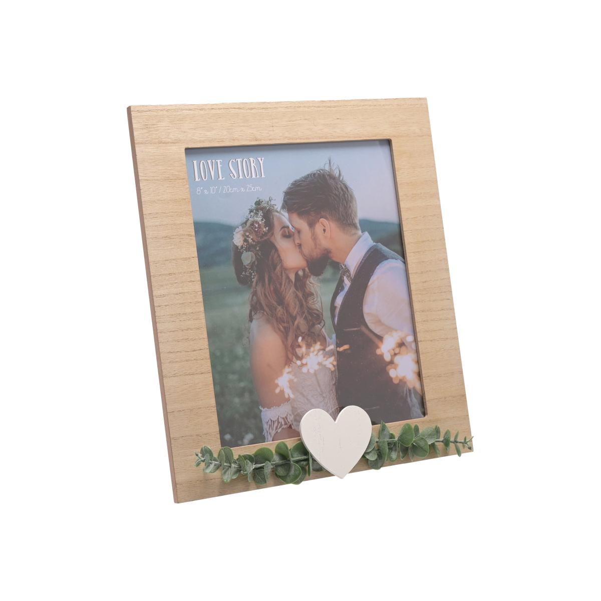* Boho style* Portrait orientation* Free standing* Made from wood This Rustic Photo Frame from Love Story is a charming way to celebrate togetherness and capture memories. Featuring a natural wooden frame with a rustic finish, the design includes faux leaf decorations and a plain white heart embellishment. Perfect for displaying portrait photos, the frame includes an attached standing strut, making it a lovely addition to any home.