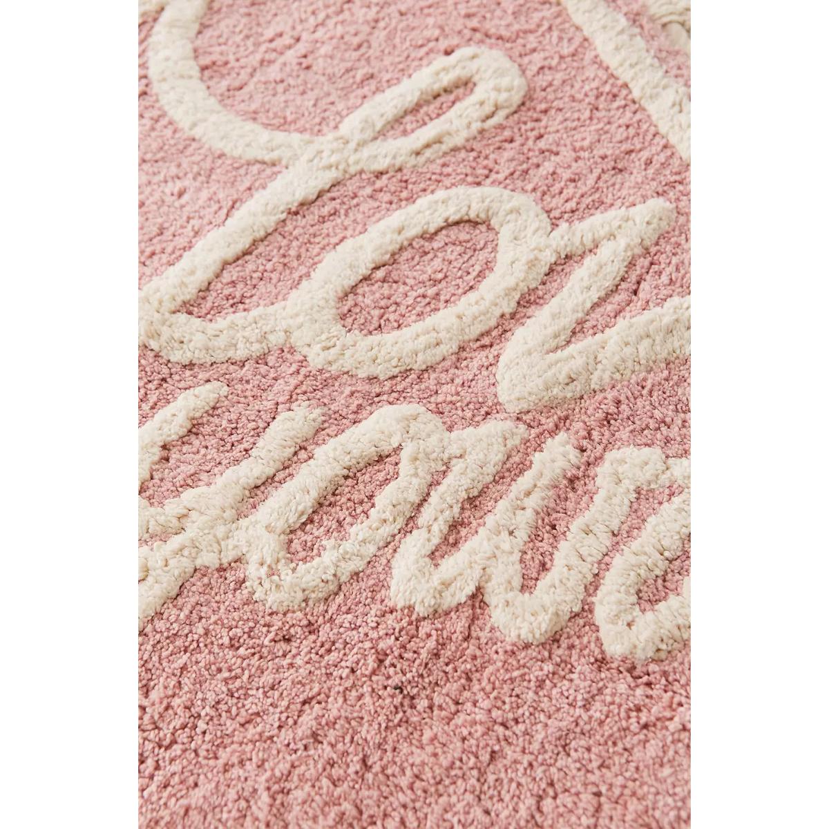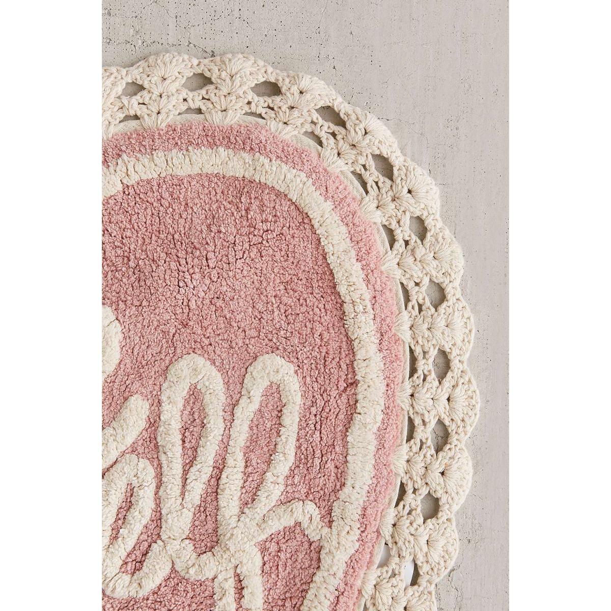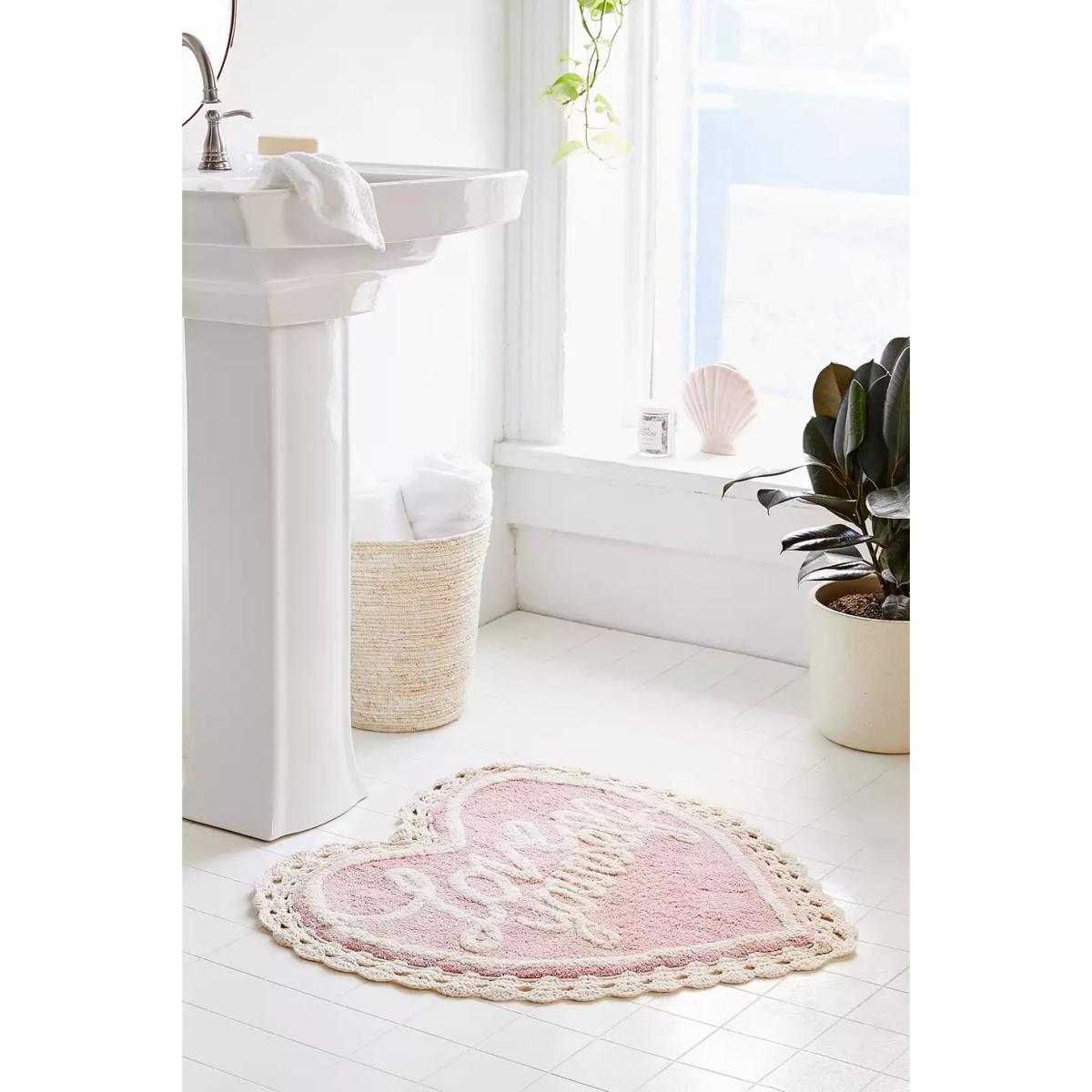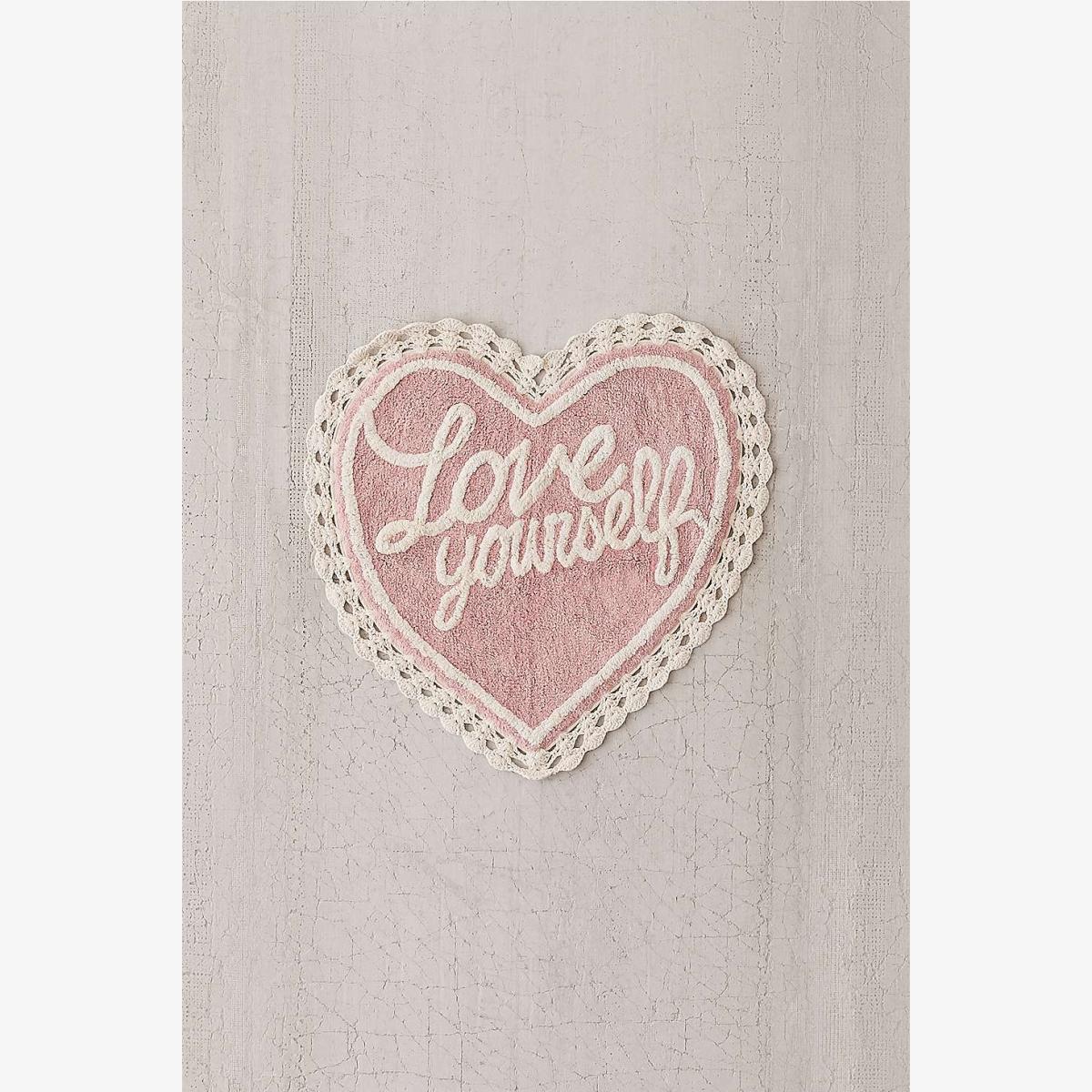 Love yourself and this bath mat from top to toe. Heart-shaped bath mat with contrast lettering and crochet trim, complete with non-slip backing. **Content + Care** \- 100% Cotton \- Spot clean **Size** \- 50.8cm (l) x 76.2cm (w)