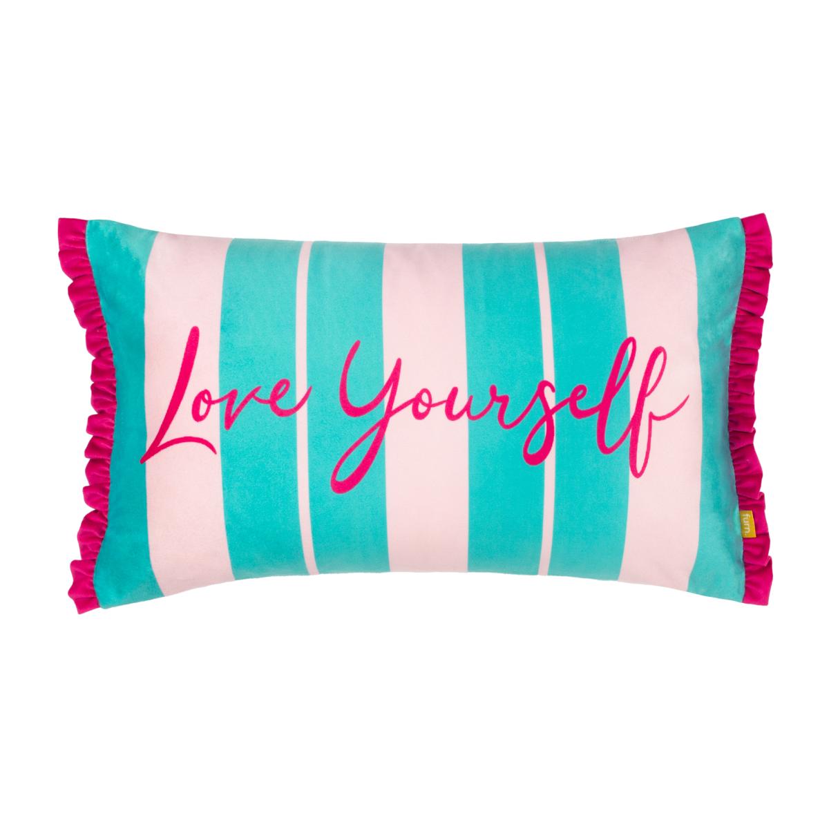 Love Yourself Striped Velvet Feather Rich Cushion - Aqua/Pink