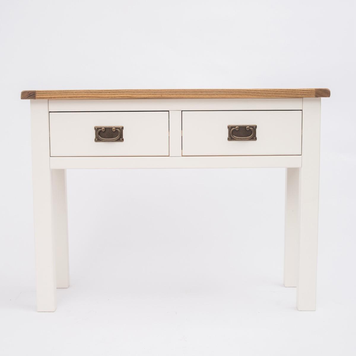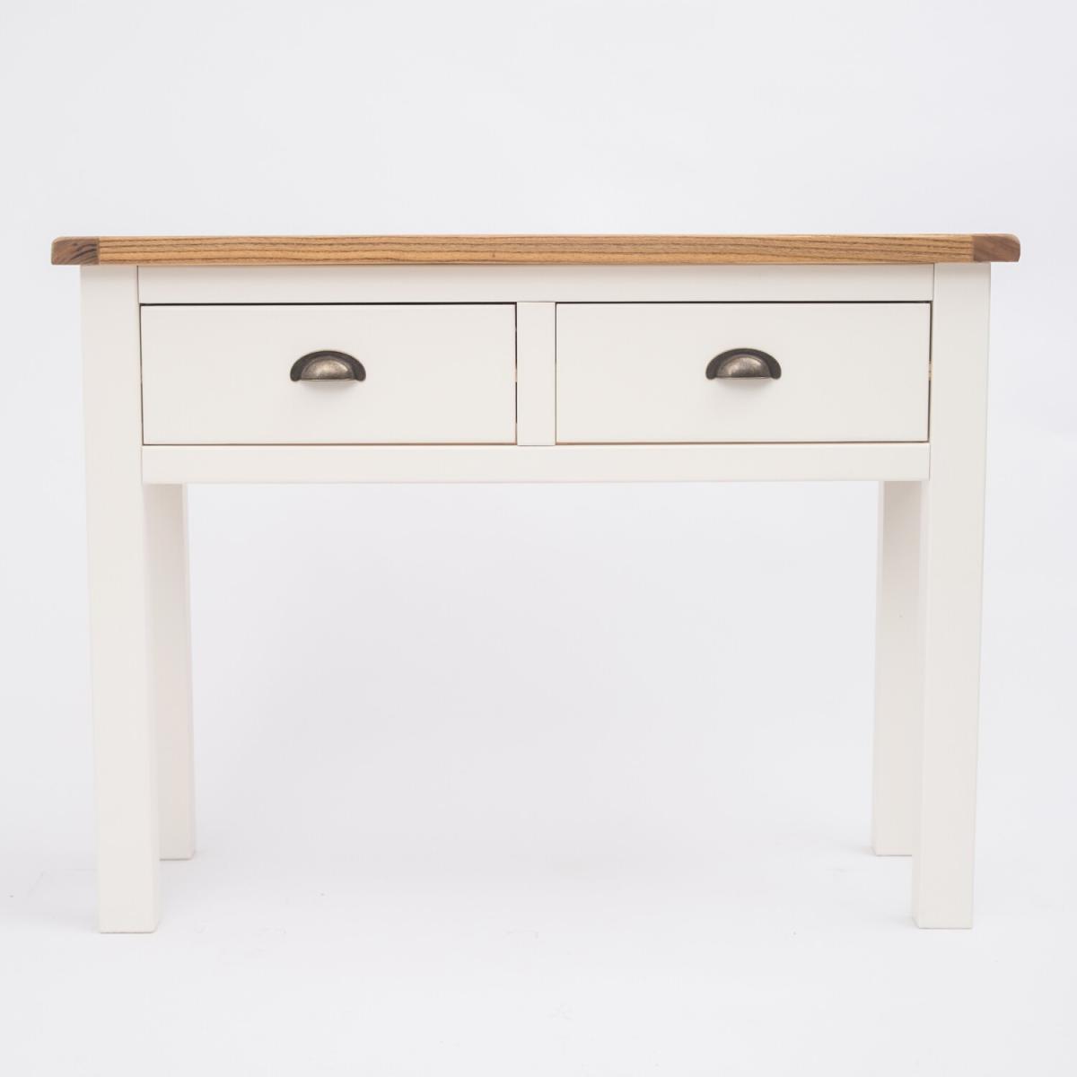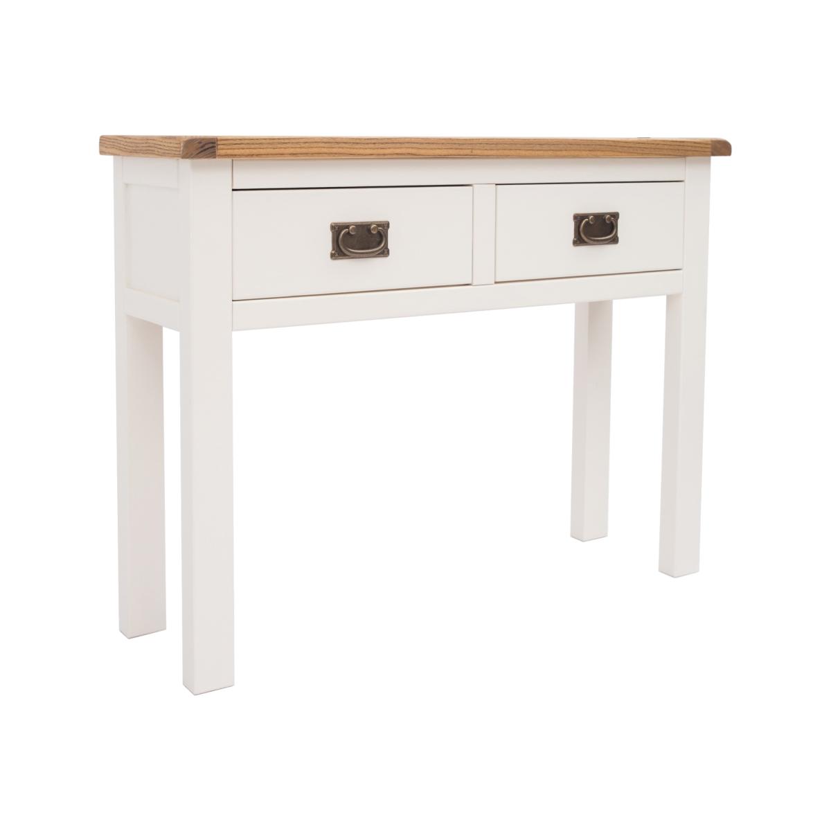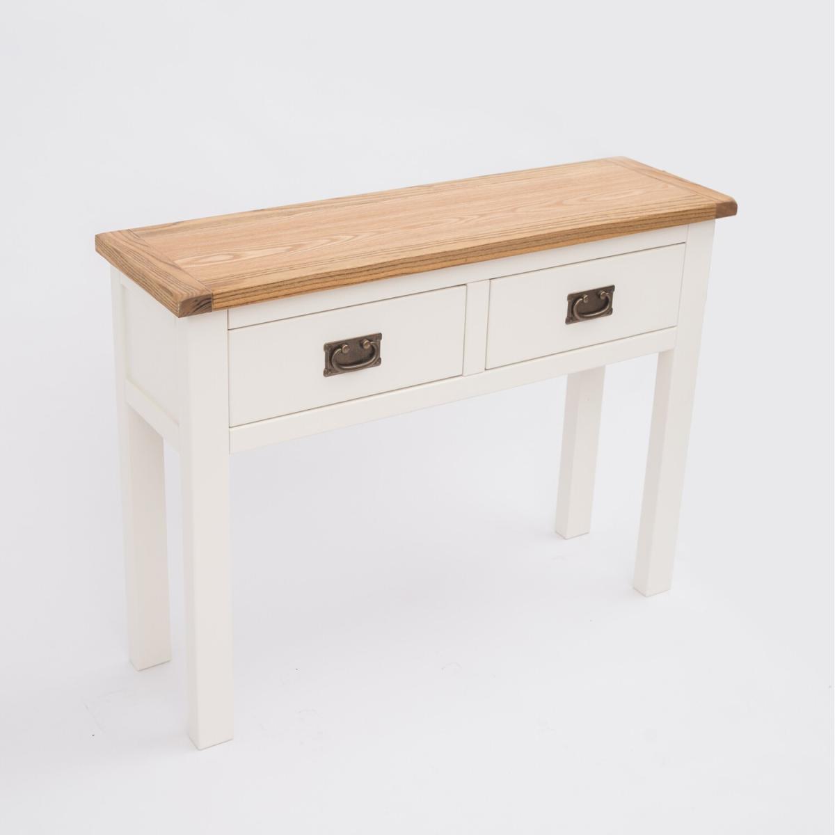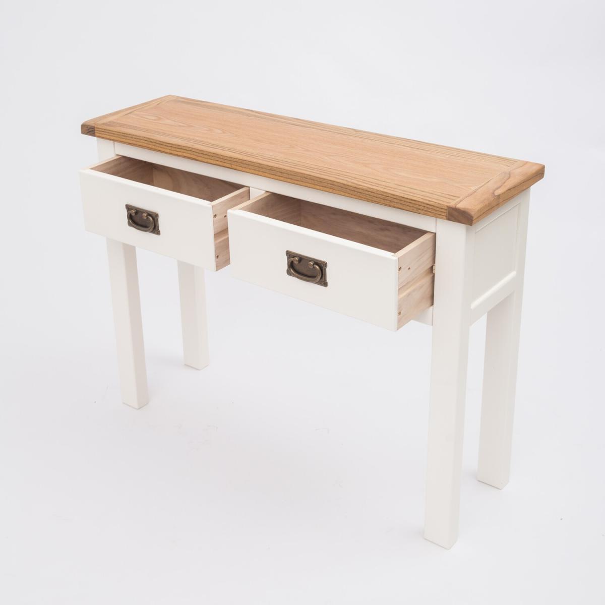Our Lovere collection has a simple but pleasing design and is produced by our skilled craftsmen to the highest standards using responsibly sourced wood and veneers. All tops are made using a combination of hardwood and ash veneer and are carefully hand-waxed giving them a great look. The body is finished with high-quality eco-friendly water-base paint in an off-white colour. This 2-drawer console table is 30cm deep so perfect to fit in narrow spaces but still offers good storage space on its 2 wide drawers. These attributes combined with a simple construction for easy assembly make it a great value product to be taken home today.