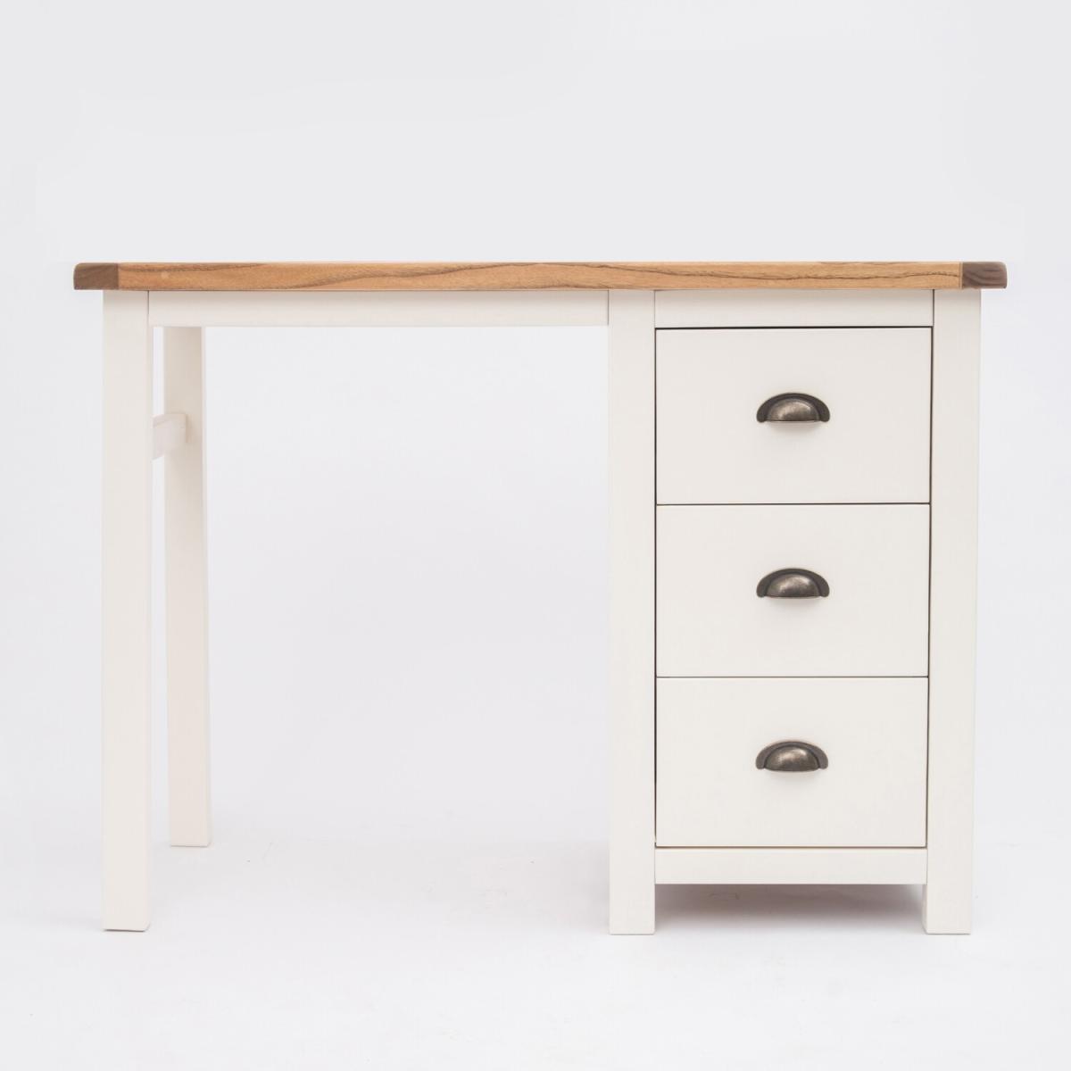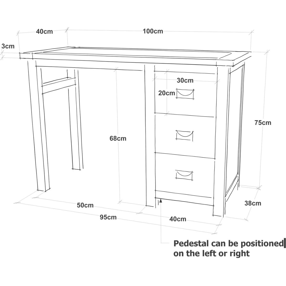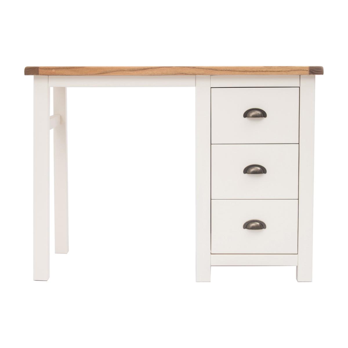 Our Lovere collection has a simple but pleasing design and is produced by our skilled craftsmen to the highest standards using responsibly sourced wood and veneers. All tops are made using a combination of hardwood and ash veneer and are carefully hand-waxed giving them a great look. The body is finished with high-quality eco-friendly water-base paint in an off-white colour. This 3 drawer pedestal dressing table/desk has deep drawers made of solid wood and the pedestal can be assembled left or right-handed. There is also a choice of 3 different handles. These attributes combined with a simple construction for easy assembly make it a great value product to be taken home today.