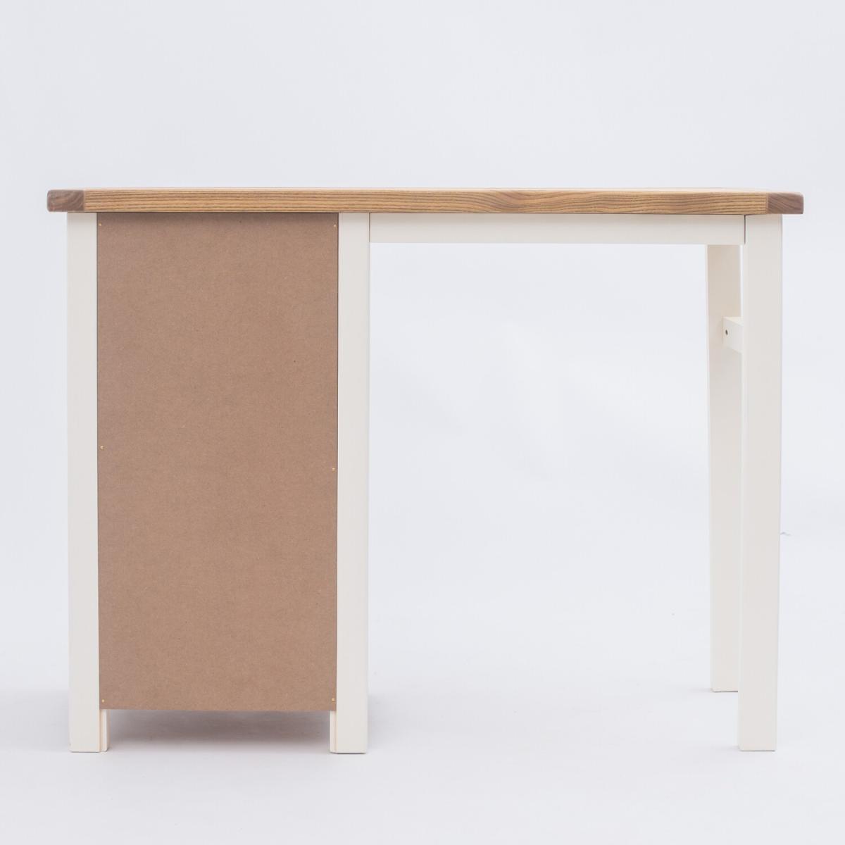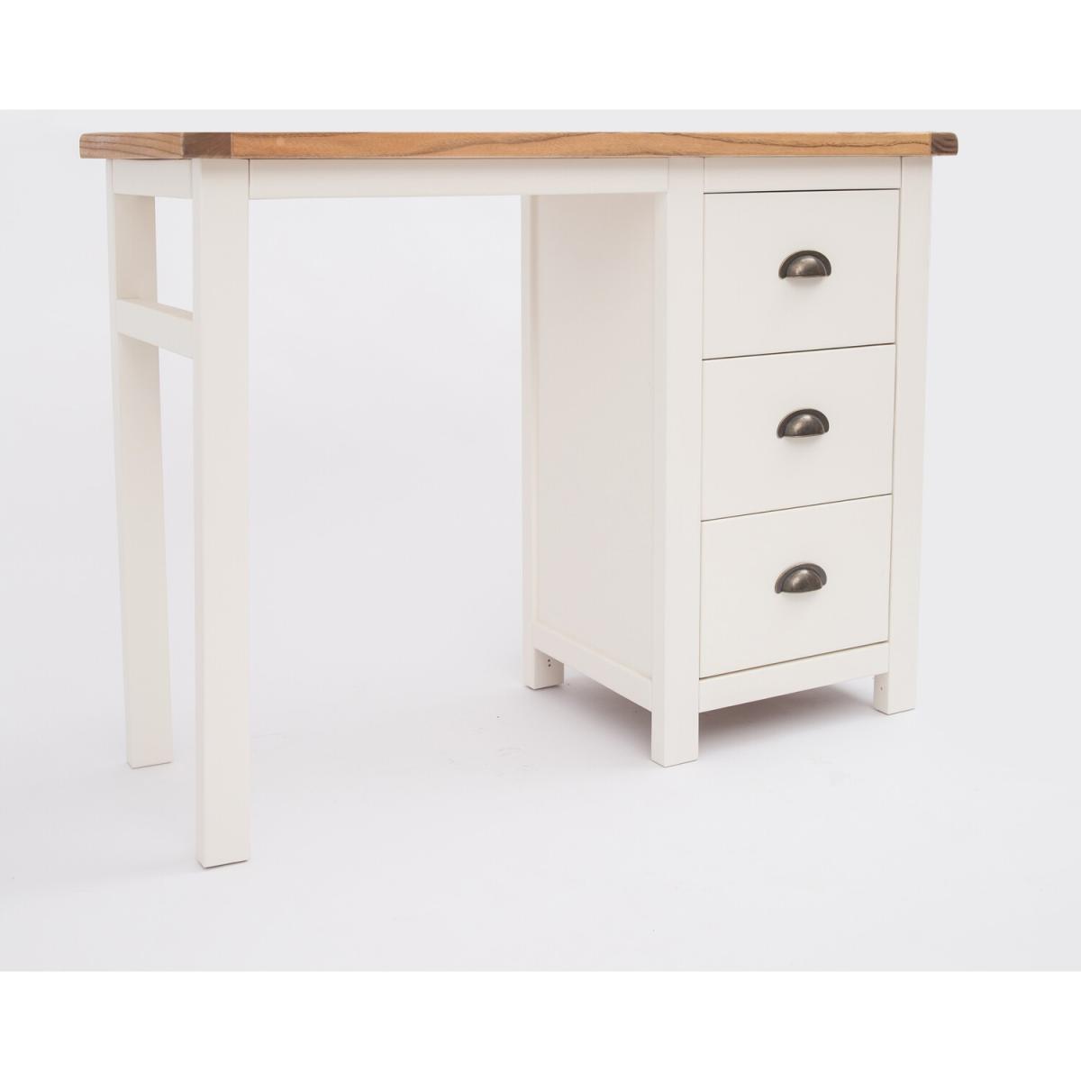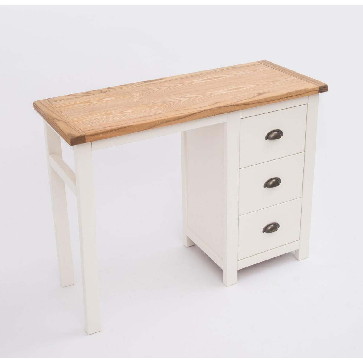 Our Lovere collection has a simple but pleasing design and is produced by our skilled craftsmen to the highest standards using responsibly sourced wood and veneers. All tops are made using a combination of hardwood and ash veneer and are carefully hand-waxed giving them a great look. The body is finished with high-quality eco-friendly water-base paint in an off-white colour. This 3 drawer pedestal dressing table/desk has deep drawers made of solid wood and the pedestal can be assembled left or right-handed. There is also a choice of 3 different handles. These attributes combined with a simple construction for easy assembly make it a great value product to be taken home today.